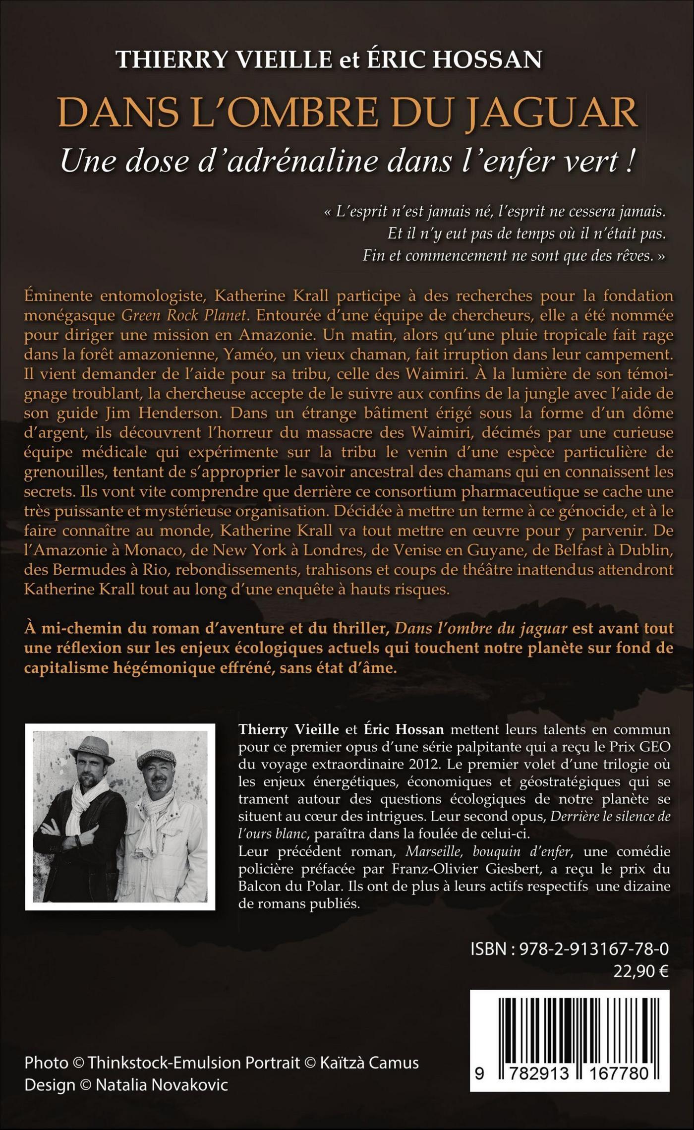 Éminente entomologiste, Katherine Krall participe à des recherches pour la fondation monégasque Green Rock Planet. Entourée d'une équipe de chercheurs, elle a été nommée pour diriger une mission en Amazonie. Un matin, Yaméo, une vieux chaman, fait irruption dans leur campement. Il vient demander de l'aide pour sa tribu, celle des Waimiri. À la lumière de son témoignage troublant, la chercheuse accepte de la suivre aux confins de la jungle... À mi-chemin du roman d'aventure et du thriller, Dans l'ombre du jaguar est avant tout une réflexion sur les enjeux écologiques actuels qui touchent notre planète sur fond de capitalisme hégémonique effréné, sans état d'âme.