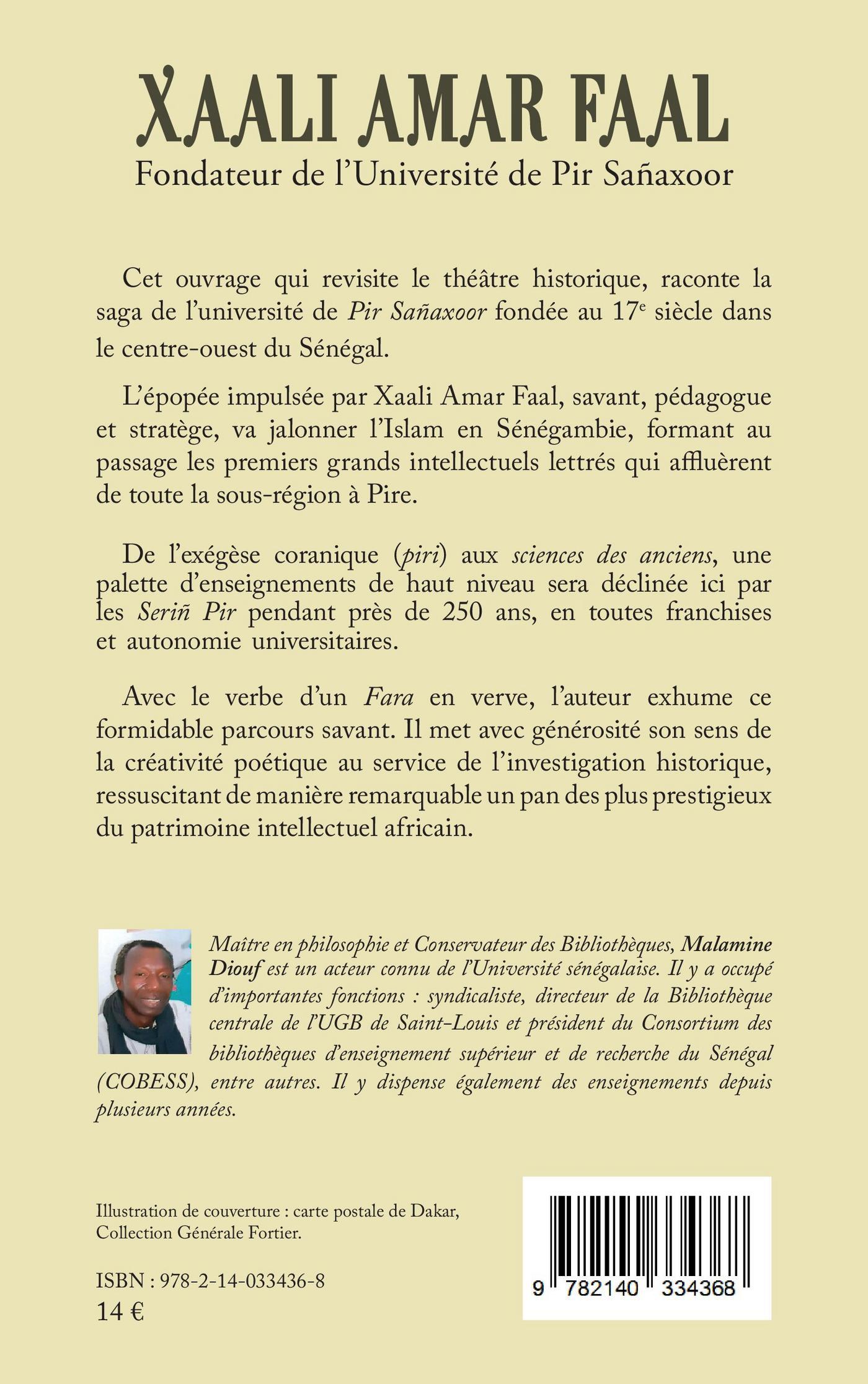Cet ouvrage qui revisite le théâtre historique, raconte la saga de l'université de Pir Sañaxoor fondée au 17e siècle dans le centre-ouest du Sénégal. L'épopée impulsée par Xaali Amar Faal, savant, pédagogue et stratège, va jalonner l'Islam en Sénégambie, formant au passage les premiers grands intellectuels lettrés qui affluèrent de toute la sous-région à Pire. De l'exégèse coranique (piri) aux sciences des anciens, une palette d'enseignements de haut niveau sera déclinée ici par les Seriñ Pir pendant près de 250 ans, en toutes franchises et autonomie universitaires. Avec le verbe d'un Fara en verve, l'auteur exhume ce formidable parcours savant. Il met avec générosité son sens de la créativité poétique au service de l'investigation historique, ressuscitant de manière remarquable un pan des plus prestigieux du patrimoine intellectuel africain.