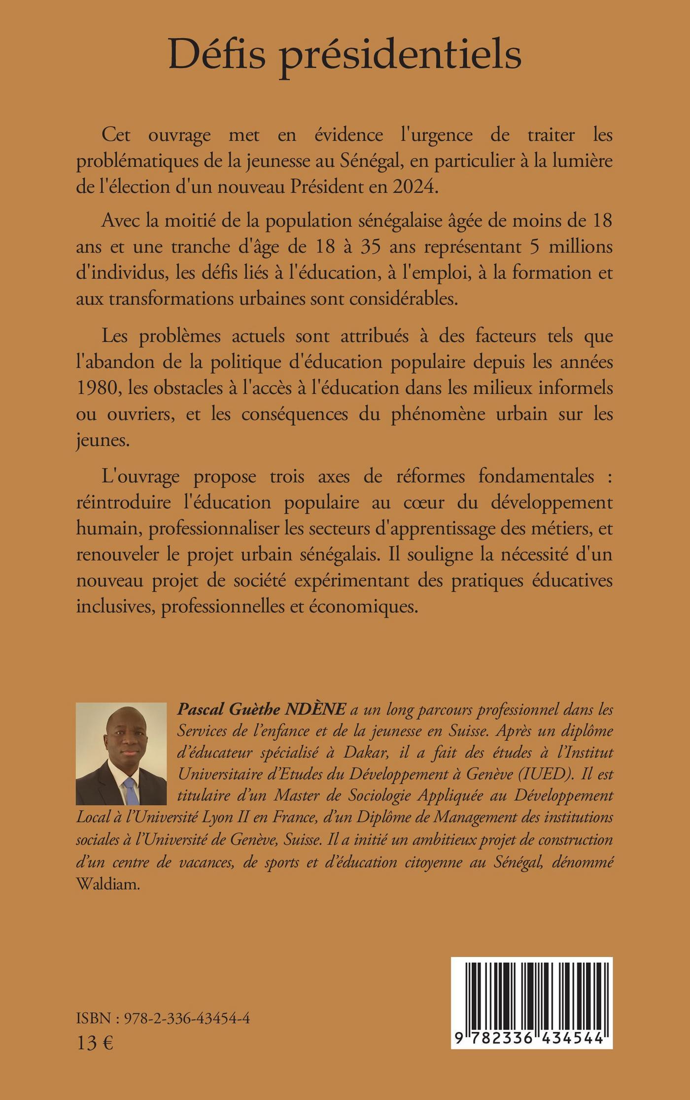 Avec la moitié de la population sénégalaise âgée de moins de 18 ans et une tranche d'âge de 18 à 35 ans représentant 5 millions d'individus, les défis liés à l'éducation, à l'emploi, à la formation et aux transformations urbaines sont considérables. Les problèmes actuels sont attribués à des facteurs tels que l'abandon de la politique d'éducation populaire depuis les années 1980, les obstacles à l'accès à l'éducation dans les milieux informels ou ouvriers, et les conséquences du phénomène urbain sur les jeunes. L'ouvrage propose trois axes de réformes fondamentales : réintroduire l'éducation populaire au cœur du développement humain, professionnaliser les secteurs d'apprentissage des métiers, et renouveler le projet urbain sénégalais. Il souligne la nécessité d'un nouveau projet de société expérimentant des pratiques éducatives inclusives, professionnelles et économiques.