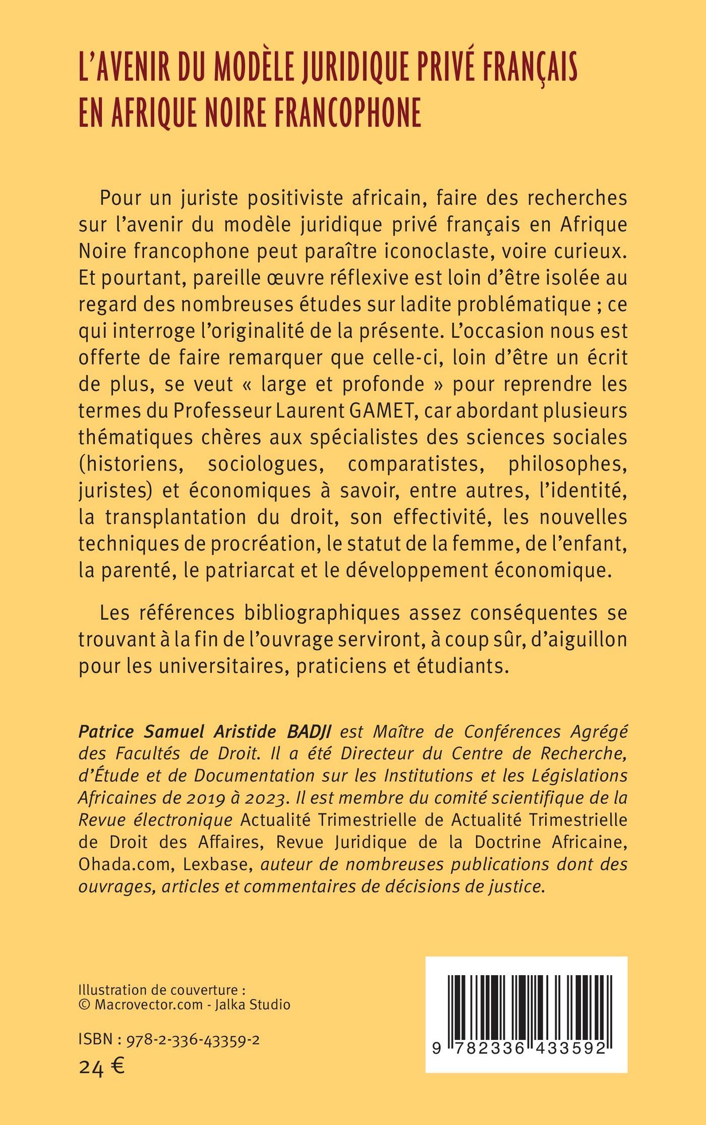 Pour un juriste positiviste africain, faire des recherches sur l’avenir du modèle juridique privé français en Afrique Noire francophone peut paraître iconoclaste, voire curieux. Et pourtant, pareille œuvre réflexive est loin d’être isolée au regard des nombreuses études sur ladite problématique ; ce qui interroge l’originalité de la présente. L’occasion nous est offerte de faire remarquer que celle-ci, loin d’être un écrit de plus, se veut « large et profonde » pour reprendre les termes du Professeur Laurent GAMET, car abordant plusieurs thématiques chères aux spécialistes des sciences sociales (historiens, sociologues, comparatistes, philosophes, juristes) et économiques à savoir, entre autres, l’identité, la transplantation du droit, son effectivité, les nouvelles techniques de procréation, le statut de la femme, de l’enfant, la parenté, le patriarcat et le développement économique. Les références bibliographiques assez conséquentes se trouvant à la fin de l’ouvrage serviront, à coup sûr, d’aiguillon pour les universitaires, praticiens et étudiants.