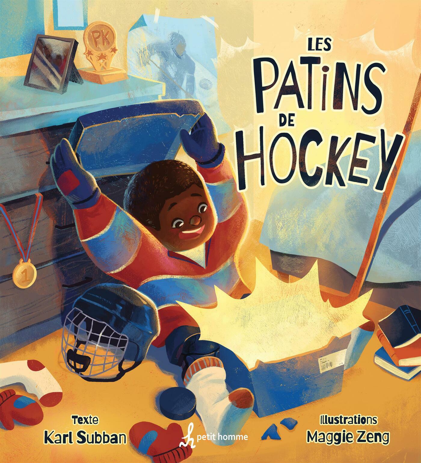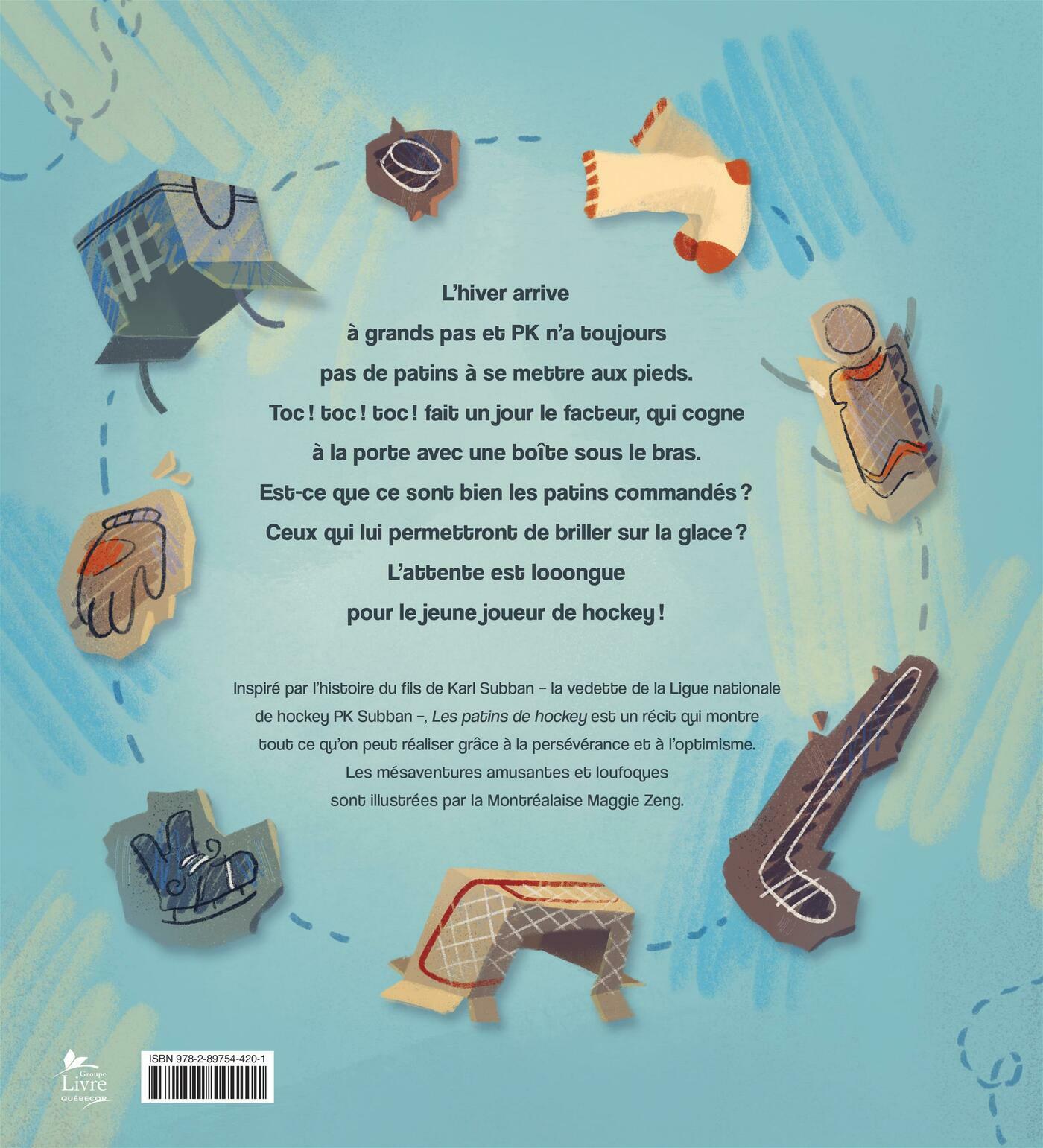 L'hiver arrive à grands pas et PK n'a toujours pas de patins à se mettre aux pieds. Toc! toc! toc! fait un jour le facteur, qui cogne à la porte avec une boîte sous le bras. Est-ce que ce sont bien les patins commandés? Ceux qui lui permettront de briller sur la glace? L'attente est looongue pour le jeune joueur de hockey!