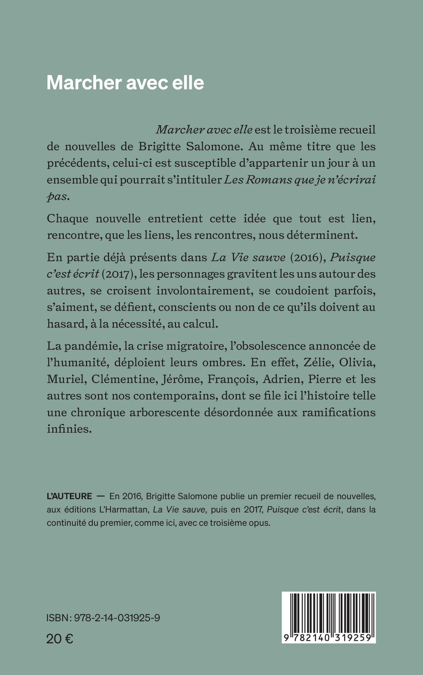 Marcher avec elle est le troisième recueil de nouvelles de Brigitte Salomone. Au même titre que les précédents, celui-ci est susceptible d'appartenir un jour à un ensemble qui pourrait s'intituler Les Romans que je n'écrirai pas. Chaque nouvelle entretient cette idée que tout est lien, rencontre, que les liens, les rencontres, nous déterminent. En partie déjà présents dans La Vie sauve (2016), Puisque c'est écrit (2017), les personnages gravitent les uns autour des autres, se croisent involontairement, se coudoient parfois, s'aiment, se défient, conscients ou non de ce qu'ils doivent au hasard, à la nécessité, au calcul. La pandémie, la crise migratoire, l'obsolescence annoncée de l'humanité, déploient leurs ombres. En effet, Zélie, Olivia, Muriel, Clémentine, Jérôme, François, Adrien, Pierre et les autres sont nos contemporains, dont se file ici l'histoire telle une chronique arborescente désordonnée aux ramifications infinies.