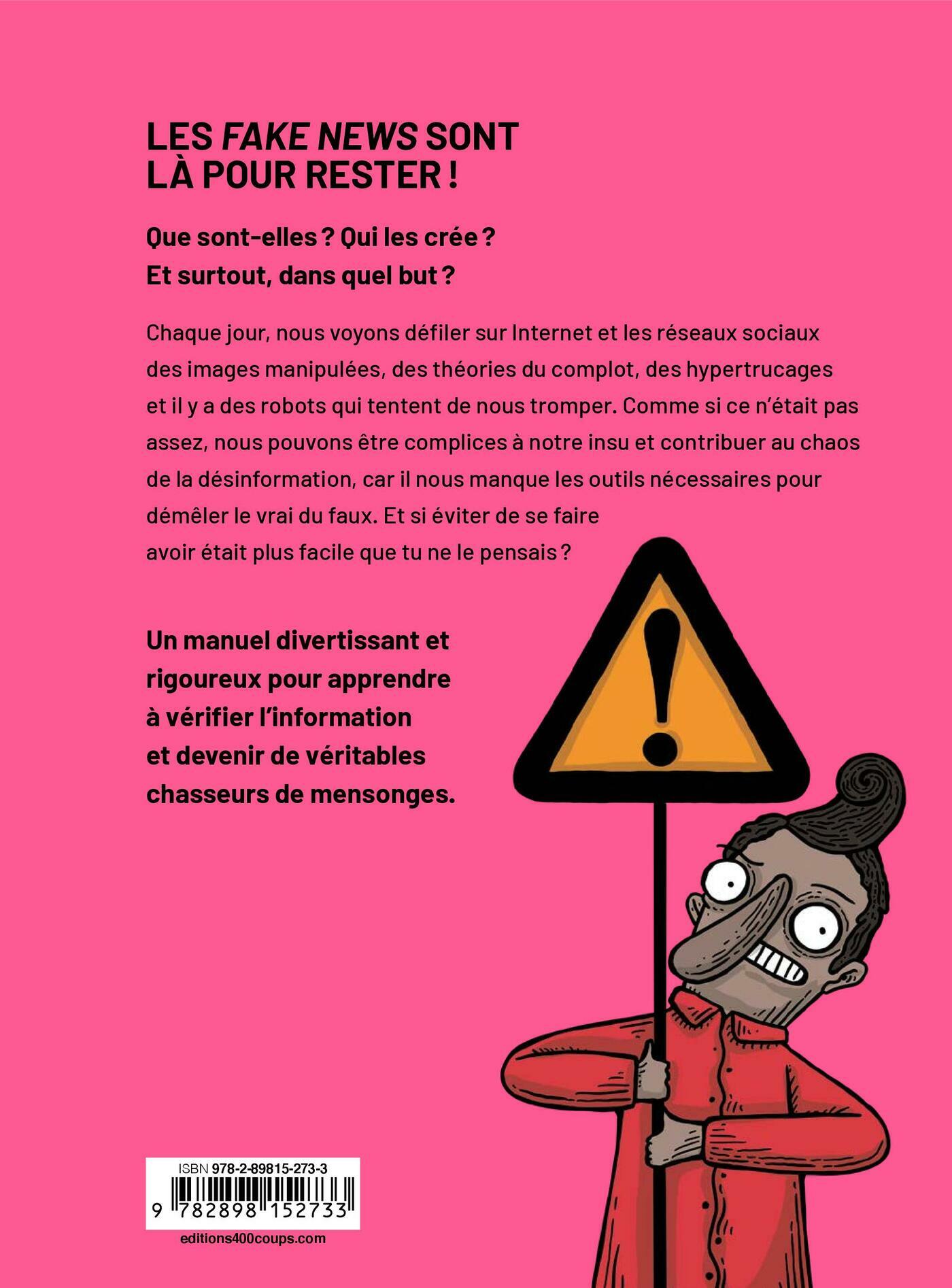 Qu’est-ce que les fausses nouvelles (fake news)? Et qui les crée? Sur Internet et les réseaux sociaux, on trouve quotidiennement des images et des vidéos manipulées, des théories du complot, des hypertrucages (deepfake) et des robots (bots) qui tentent de nous piéger. En plus, nous pouvons être complices sans le savoir et contribuer au chaos de la désinformation. C’est pourquoi il est nécessaire d’avoir des outils pour vérifier ce qui est vrai et ce qui est faux.Dans ce documentaire, Nereida Carrillo donne des explications éclairées à propos de tout ce qui entoure la désinformation. Elle outille le lecteur afin qu’il devienne alerte et critique face au flot d’informations qui lui est proposé. Les illustrations d’Alberto Montt, à la fois drôles et conceptuelles, appuient le texte avec une vive intelligence.