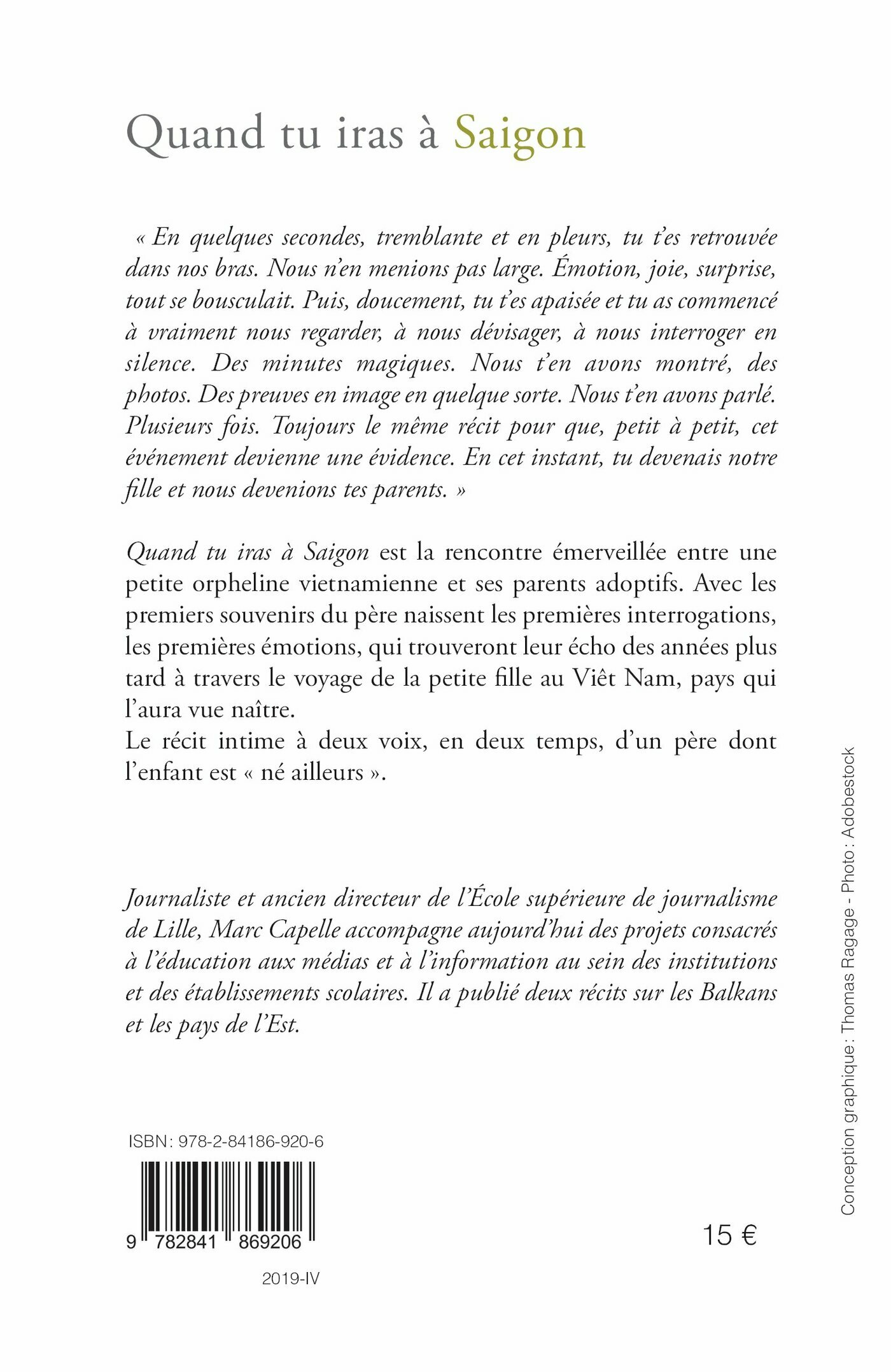 Quand tu iras à Saigon est la rencontre émerveillée entre une petite orpheline vietnamienne et ses parents adoptifs. Avec les premiers souvenirs du père naissent les premières interrogations, les premières émotions, qui trouveront leur écho des années plus tard à travers le voyage de la petite fille au Viêt Nam, pays qui l’aura vue naître.