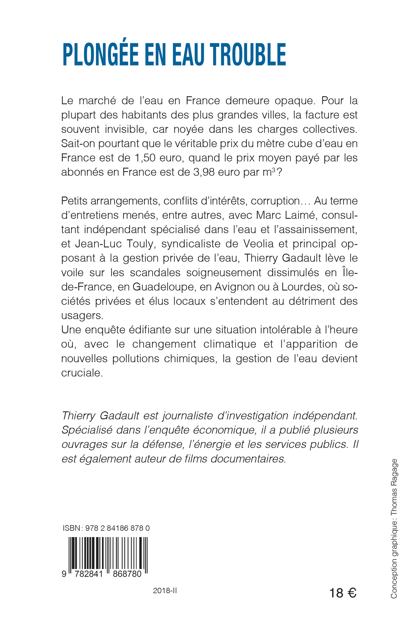 Petits arrangements, conflits d’intérêts, corruption… Au terme d’entretiens menés, entre autres, avec Marc Laimé, consultant indépendant spécialisé dans l’eau et l’assainissement, et Jean-Luc Touly, syndicaliste de Veolia et principal opposant à la gestion privée de l’eau, Thierry Gadault lève le voile sur les scandales soigneusement dissimulés en Île-de-France, en Guadeloupe, en Avignon ou à Lourdes, où sociétés privées et élus locaux s’entendent au détriment des usagers.