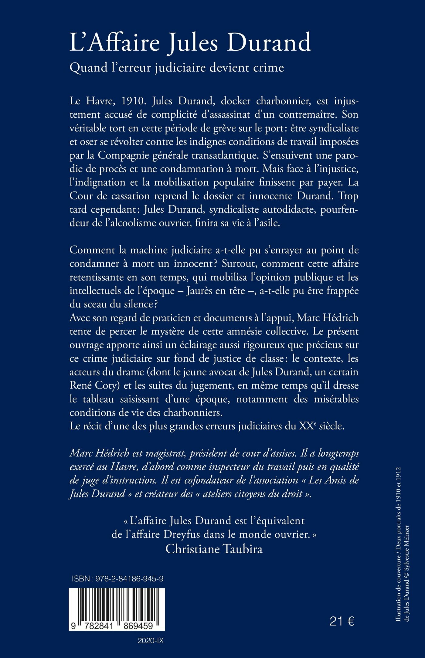 Avec son regard de praticien et documents à l’appui, Marc Hédrich tente de percer le mystère de cette amnésie collective. Le présent ouvrage apporte ainsi un éclairage aussi rigoureux que précieux sur ce crime judiciaire sur fond de justice de classe : le contexte, les acteurs du drame (dont le jeune avocat de Jules Durand, un certain René Coty) et les suites du jugement, en même temps qu’il dresse le tableau saisissant d’une époque, notamment des misérables conditions de vie des charbonniers.
