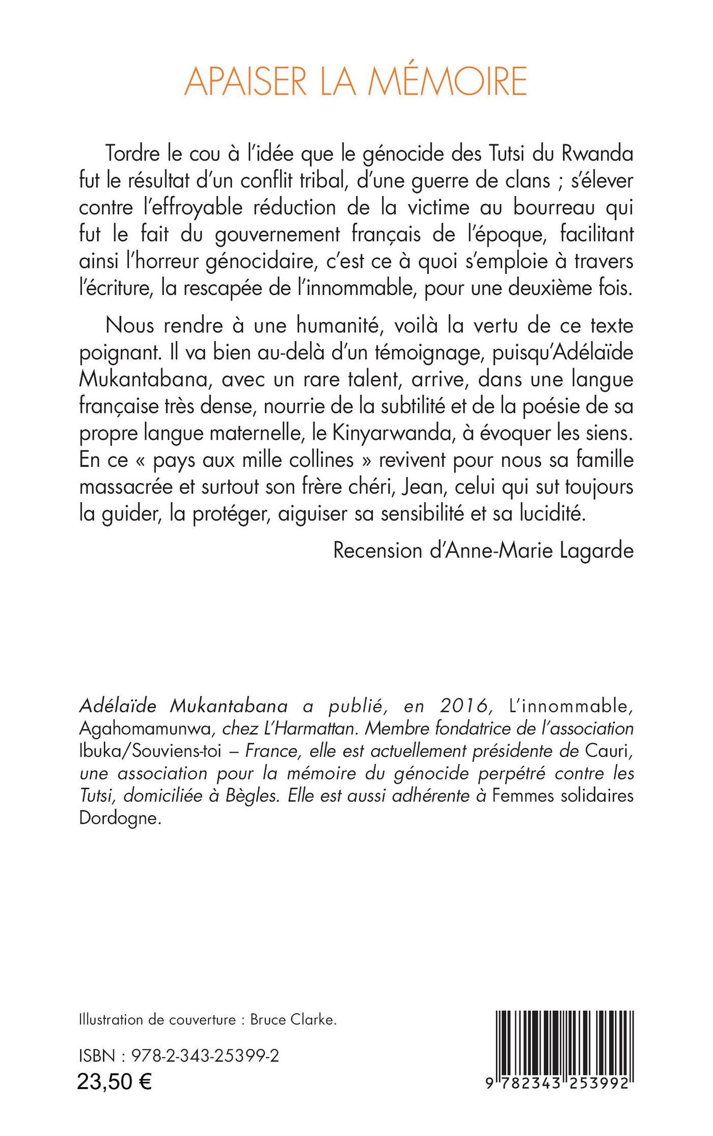 Tordre le cou à l’idée que le génocide des Tutsi du Rwanda fut le résultat d’un conflit tribal, d’une guerre de clans ; s’élever contre l’effroyable réduction de la victime au bourreau qui fut le fait du gouvernement français de l’époque, facilitant ainsi l’horreur génocidaire, c’est ce à quoi s’emploie à travers l’écriture, la rescapée de l’innommable, pour une deuxième fois. Nous rendre à une humanité, voilà la vertu de ce texte poignant. Il va bien au-delà d’un témoignage, puisqu’Adélaïde Mukantabana, avec un rare talent, arrive à évoquer les siens. En ce « pays aux mille collines » revivent pour nous sa famille massacrée et surtout son frère chéri, Jean, celui qui sut toujours la guider, la protéger, aiguiser sa sensibilité et sa lucidité. Recension d’Anne-Marie Lagarde.