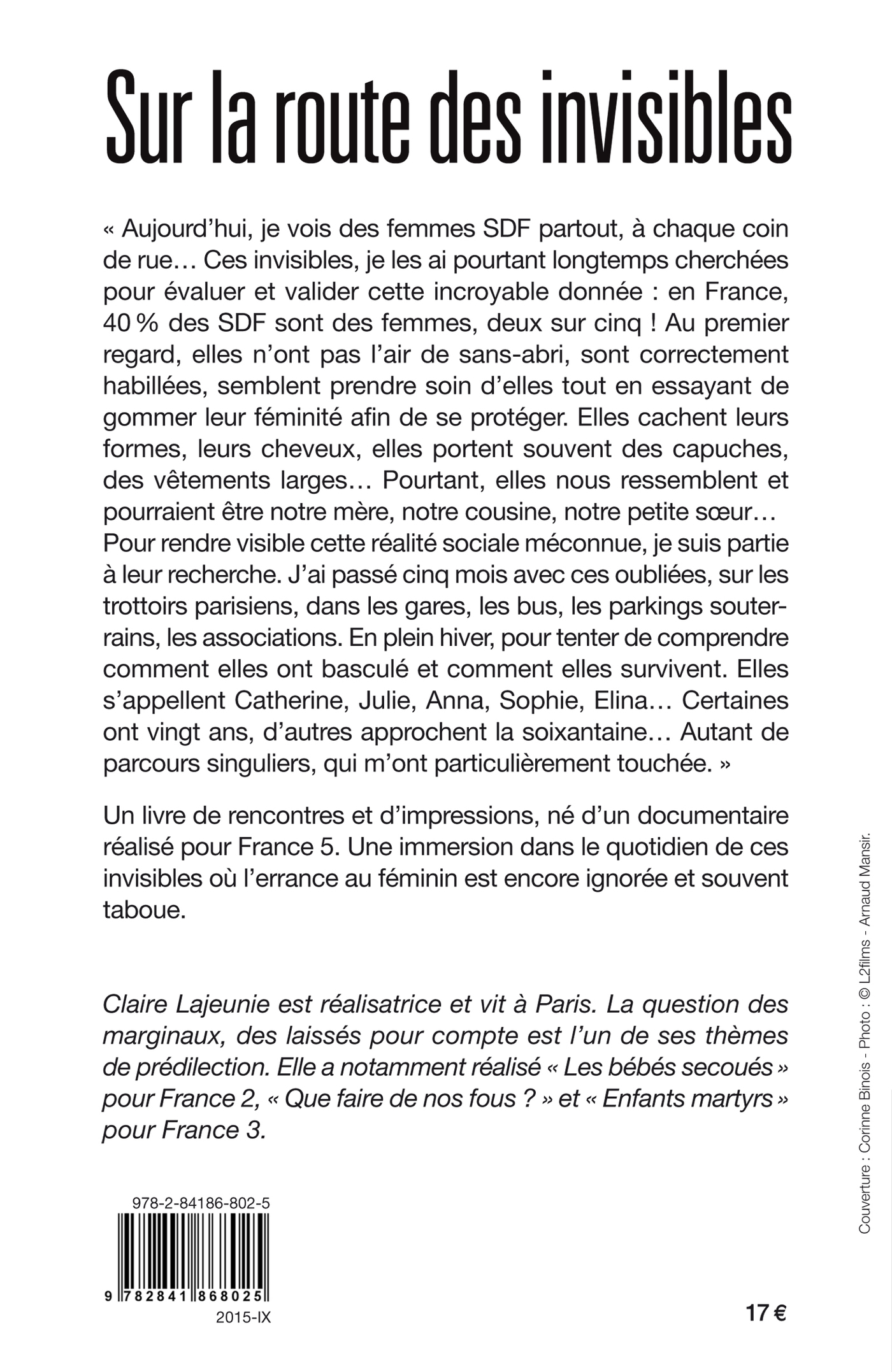 Pour rendre visible cette réalité sociale méconnue, je suis partie à leur recherche. J’ai passé cinq mois avec ces oubliées, sur les trottoirs parisiens, dans les gares, les bus, les parkings souterrains, les associations. En plein hiver, pour tenter de comprendre comment elles ont basculé et comment elles survivent. Elles s’appellent Catherine, Julie, Anna, Sophie… Certaines ont vingt ans, d’autres