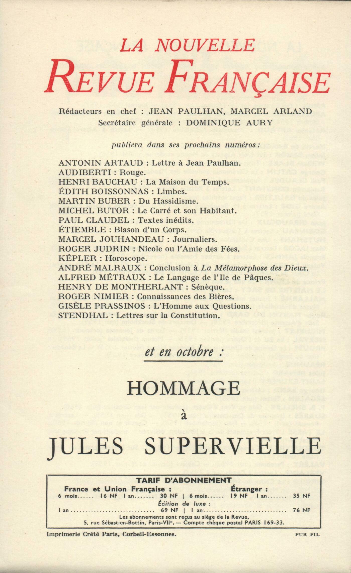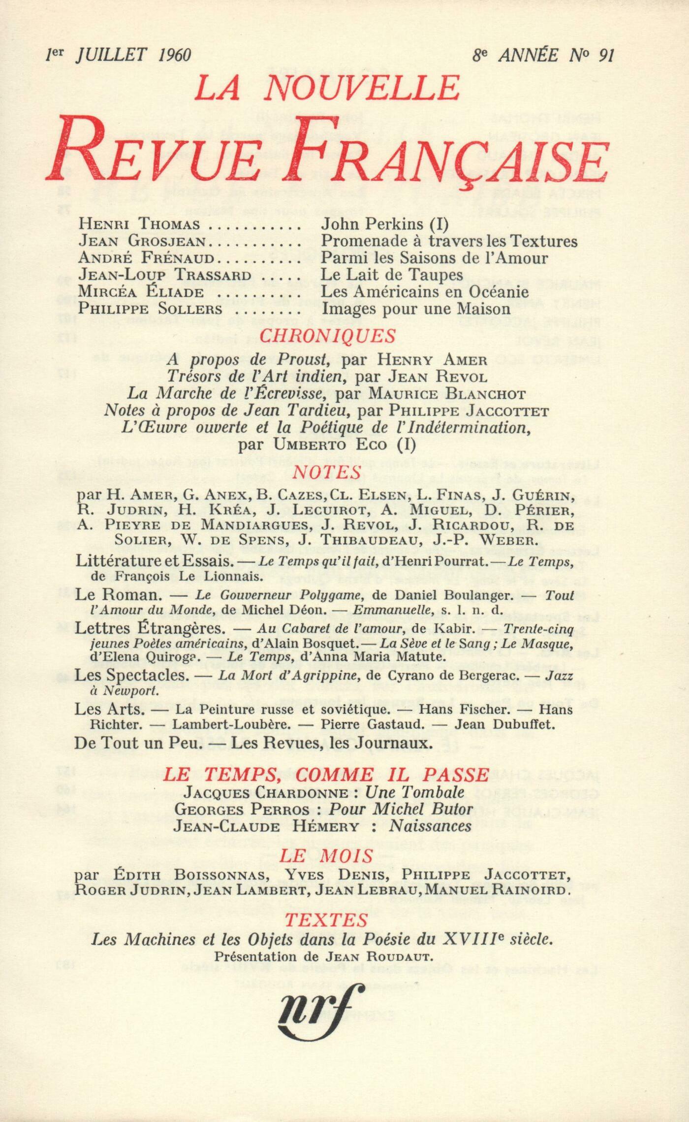 Henri Thomas, John PerkinsJean Grosjean, Vagabondage parmi les TexturesAndré Frénaud, Parmi les Saisons de l'AmourJean-Loup Trassard, Le Lait de taupesMircea Eliade, Les Américains en Océanie et le nudisme eschatologiquePhilippe Sollers, Images pour une maisonChroniques : recherches : Maurice Blanchot, La Marche de l'écrevisseChroniques : Henry Amer, Ŕ propos de ProustPhilippe Jaccottet, Notes ŕ propos de Jean TardieuJean Revol, Trésors de l'art indienUmberto Eco, L'uvre ouverte et la Poétique de l'indéterminationNotes : littérature et essais : Roger Judrin, Le Temps qu'il fait, par Henri Pourrat (Albin Michel)Bernard Cazes, Le Temps, par François Le Lionnais (Delpire)Notes : le roman : Jean Ricardou, Le Gouverneur polygame, par Daniel Boulanger (Éditions de Minuit)Claude Elsen, Tout l'amour du monde, par Michel Déon (Plon)André Pieyre de Mandiargues, Emmanuelle (s. l. n. d.)Notes : lettres étrangčres : Lucette Finas, Au Cabaret de l'Amour, par Kabir (Gallimard)Georges Anex, Trente-cinq jeunes počtes américains (Gallimard)Willy de Spens, La Sčve et le Sang, par Elena Quiroga (Plon) - Le Masque, par Elena Quiroga (Gallimard) - Le Temps, par Anna Maria Matute (Gallimard)Notes : les spectacles : Willy de Spens, La Mort d'Agrippine, de Cyrano de Bergerac (Studio des Champs-Élysées)Jean Thibaudeau, Jazz ŕ NewportNotes : les arts : René de Solier, La peinture russe et soviétique (Musée national d'Art moderne) - Hans Fischer (Kunsthalle Bern) - Hans Richter (Galerie Denise René) - Lambert-Loubčre (Galerie de Paris) - Pierre Gastaud (Galerie Jacques Massol)Jean Revol, Jean Dubuffet (Galerie Cordier, Galerie Bergruen)De tout un peu : Henri Kréa, Agonie du général Krivitski, par André Frénaud (P.-J. Oswald)André Miguel, Les Moissons de l'orage, par André Marissel (Millas-Martin)Jean-Paul Weber, Letters to Achille Chaper, de Victor JacquemontHenry Amer, L'Homme et la Verticale, par Pierre Merle (La Colombe)Willy de Spens, Le Jeu de l'Oie, par Marcel Schneider (Grasset)Jean-Paul Weber, Les Jumeaux solitaires, par Marcel Spada (Gallimard)Denis Périer, La Confession anonyme (Julliard)Henry Amer, Les Viaducs de la Seine-et-Oise, par Marguerite Duras (Gallimard)Jean Lecuirot, Le Balcon, par Jean Genet (au Gymnase) - La Dolce Vita, de FelliniLes revues, les journaux : Jorge Luis Borges, In memoriam Alfonso ReyesJacqueline Brossy-Pagčs, CévenolesJean Guérin, Bizarreries - DiversLe temps, comme il passe : Jacques Chardonne, Une TombaleGeorges Perros, Pour Michel ButorJean-Claude Hémery, NaissancesLe mois : Roger Judrin, La vertu d'étrangetéÉdith Boissonnas, Pierres Anonymes, Lili Marlčne 1660Philippe Jaccottet, Notes éparsesManuel Rainoird, Moulin Rouge, la Revue japonaiseJean Lebrau, BrindillesJean Lambert, Le nom de Vancouver (Fin)Textes : Jean Roudaut, Les Machines et les Objets dans la poésie du XVIIIe sičcle