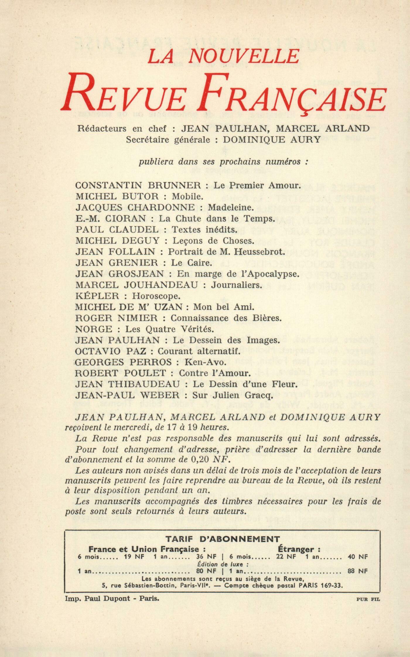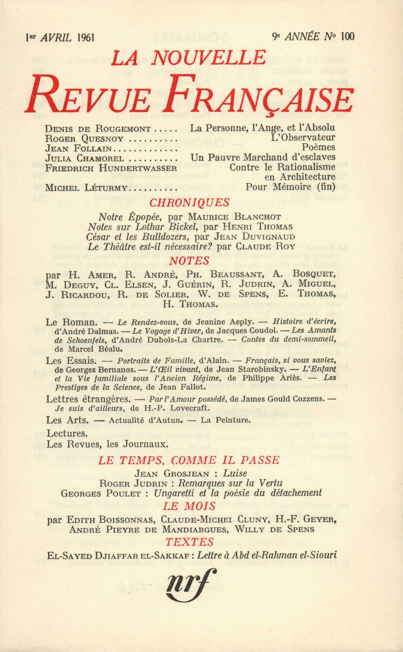 Denis de Rougemont, La Personne, l'Ange et l'Absolu ou Le dialogue Occident-OrientRoger Quesnoy, L'observateurJean Follain, PočmesJulia Chamorel, Un pauvre marchand d'esclavesFriedrich Hundertwasser, Contre le rationalisme en architectureMichel Léturmy, Pour mémoire (Fin)Chroniques : Maurice Blanchot, Notre épopéeHenri Thomas, Notes sur Lothar BickelJean Duvignaud, César et les bulldozersClaude Roy, Le théâtre est-il nécessaire?Notes : le roman : Jean Ricardou, Le Rendez-vous, par Janine Aeply (Le Seuil)Robert André, Histoire d'écrire, par André Dalmas (Grasset)Michel Deguy, Le Voyage d'hiver, par Jacques Coudol (Le Seuil)Willy de Spens, Les Amants de Schnfels, par André Dubois la Chartre (Gallimard)André Miguel, Contes du demi-sommeil, par Marcel Béalu (Pierre Fanlac)Notes : les essais : Henri Thomas, Portraits de famille, par Alain (Mercure de France)Willy de Spens, Français, si vous saviez, par Georges Bernanos (Gallimard)Michel Deguy, L'il vivant, par Jean Starobinski (Gallimard)Édith Thomas, L'Enfant et la vie familiale sous l'Ancien Régime, par Philippe Aričs (Plon)Roger Judrin, Prestiges de la science, par Jean Fallot (La Baconničre)Notes : lettres étrangčres : Alain Bosquet, Par l'amour possédé, par James Gould Cozzens (Albin Michel)Claude Elsen, Je suis ailleurs, par H.-P. Lovecraft (Denoël)Notes : les arts : Philippe Beaussant, Actualité d'AutunNotes : la peinture : René de Solier, Balthus - Douze peintres polonais modernes (Musée national d'Art moderne) - Kandinsky (Galerie Karl Flinker) - Singier (Galerie de France) - Brauner (galerie Rive Droite)Notes : lectures : André Miguel, Cartolines et dédicaces, par André Pieyre de Mandiargues (Le Terrain Vague)Roger Judrin, L'Algérie mal enchaînée, par Pierre Boudot (Gallimard)Henry Amer, Les précurseurs de Marco Polo, par A. t'Serstevens (Arthaud)Les revues : Jorge Luis Borges - Jean Guérin, Chacun et aucunJean Guérin - Julio Torri, De la peine de mortJean Guérin, Le sottisierLe temps, comme il passe : Roger Judrin, Remarques sur les maladies de la vertuJean Grosjean, LuiseGeorges Poulet, Ungaretti et la poésie du détachementLe mois : André Pieyre de Mandiargues, Les matériologiesH.-F. Geyer, AphorismesWilly de Spens, Sur ChardonneClaude Michel Cluny, Mémorable pour Claude DominiqueÉdith Boissonnas, TortuesTextes : El-Sayed Djiaffar el-Sakkaf, Lettre ŕ Abdel Rahman el Sioury