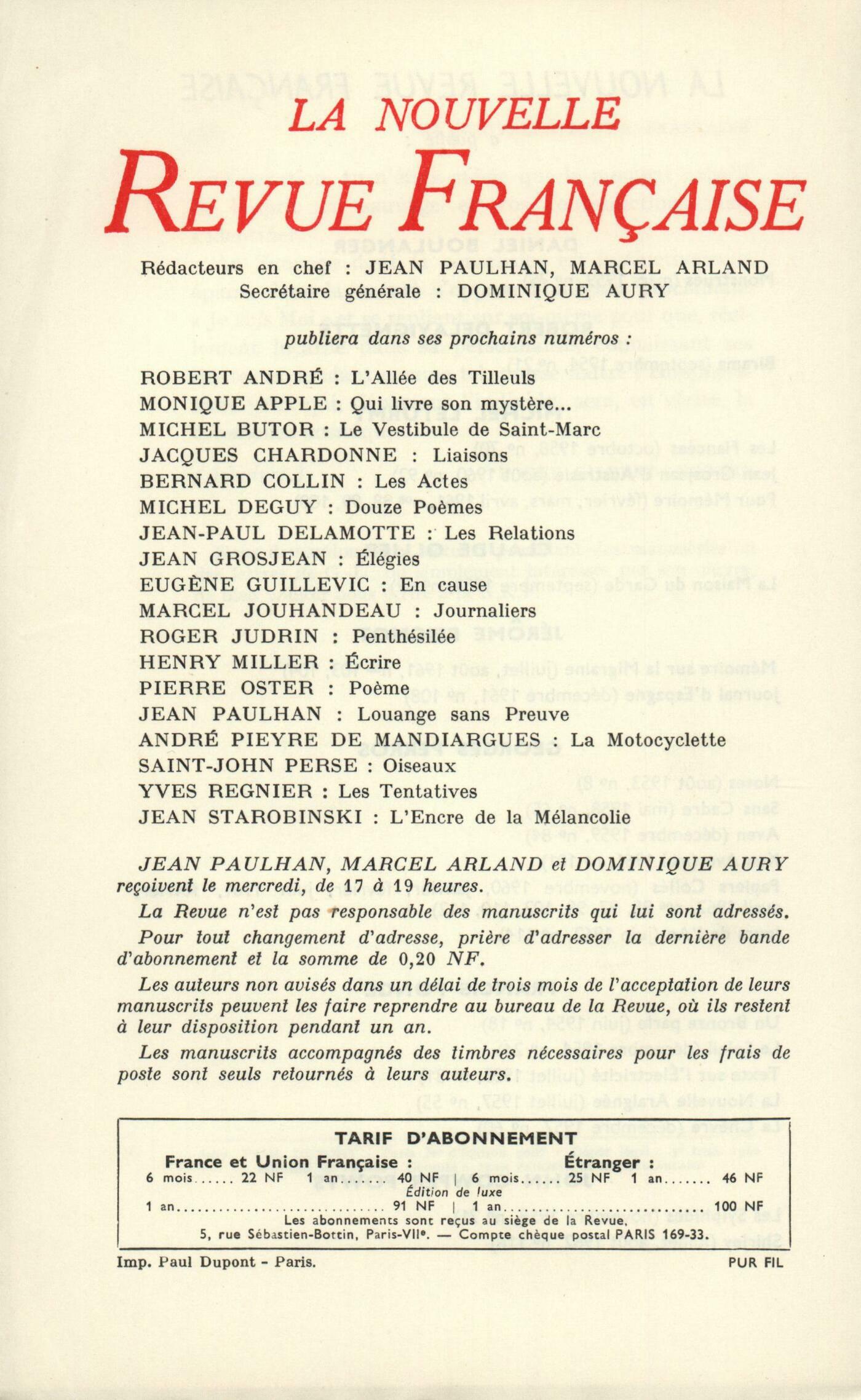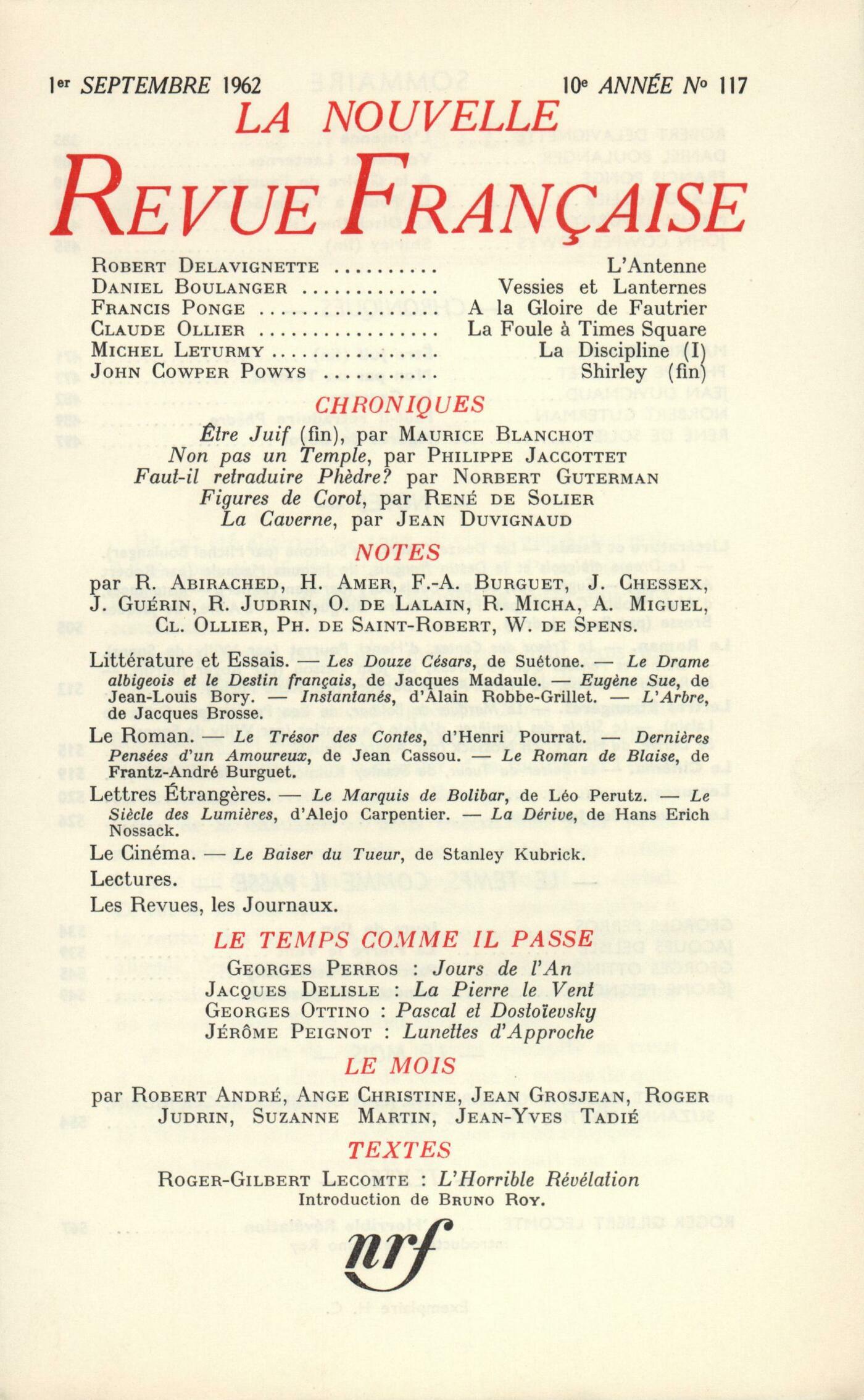 Robert Delavignette, L'AntenneDaniel Boulanger, Vessies et lanternesFrancis Ponge, Ŕ la gloire de FautrierClaude Ollier, La foule ŕ Times SquareMichel Léturmy, La Discipline (I)John Cowper Powys, Shirley (Fin)Chroniques : Maurice Blanchot, Ętre Juif (Fin)Philippe Jaccottet, Non pas un templeJean Duvignaud, La CaverneNorbert Guterman, Faut-il retraduire Phčdre?René de Solier, Figures de CorotNotes : littérature et essais : Michel Boulanger, Les Douze Césars, par Suétone (Buchet-Chastel)Robert Abirached, Le Drame albigeois et le Destin français, par Jacques Madaule (Grasset)Henry Amer, Eugčne Süe, par Jean-Louis Bory (Hachette)Frantz André Burguet, Instantanés, par Alain Robbe-Grillet (Éditions de Minuit)Roger Judrin, L'Arbre, par Jacques Brosse (Delpire)Notes : le roman : Willy de Spens, Le Trésor des Contes, XII, par Henri Pourrat (Gallimard)Roger Judrin, Derničres pensées d'un amoureux, par Jean Cassou (Albin Michel)René Micha, Le Roman de Blaise, par Frantz-André Burguet (Gallimard)Notes : lettres étrangčres : Odile de Lalain, Le Marquis de Bolibar, par Leo Perutz (Albin Michel)Willy de Spens, Le Sičcle des Lumičres, par Alejo Carpentier (Gallimard)André Miguel, La Dérive, par Hans Erich Nossack (Gallimard)Notes : le cinéma : Claude Ollier, Le Baiser du tueur, de Stanley KubrickNotes : lectures : André Miguel, En deçŕ, au delŕ, par Monique Apple (Denoël)Philippe Jaccottet, Plein pouvoir, par Carlo Masoni (Éditions du Verseau)Philippe de Saint-Robert, Le Monde ŕ la mort de Socrate, par Michel Mourre (Hachette)Robert André, Logique et morale du diagnostic, par Jean-Charles Sournia (Gallimard)Philippe de Saint-Robert, Les aveux infidčles, par Jacques de Bourbon-Busset (Gallimard)Willy de Spens, De la rive étrangčre, par Claire Sainte-Soline (Grasset)Jacques Chessex, La Vie ręvée, par François-Régis Bastide (Le Seuil) - Le Nyctalope, par Antoine Tudal (Julliard)Willy de Spens, Les lentes nuits, par Françoise des Ligneris (Grasset)André Miguel, Un été acide, par Pol Vandromme (Éditions Pierre de Méyčre)Willy de Spens, Pour vivre ici, par Juan Goytisolo (Gallimard)Les revues : Jean Guérin - Jean-François Revel, Ŕ l'éloge de la peintureWilliam Butler Yeats, Deux počmesJean Guérin - Carlo Emilio Gadda - Elio Vittorini, Un texte de GaddaJean Guérin, Divers Anonymes, NotesLe temps, comme il passe : Georges Perros, Jours de l'anPierre Delisle, La Pierre, le VentGeorges Ottino, Pascal et DostoďevskyJérôme Peignot, Oů il est démontré que les lunettes d'approche ne sont pas des loupesLe mois : Suzanne Martin, Le cheval bleuRoger Judrin, Les écrivains et les femmesJean Grosjean, ArmoireRobert André, En font-ils de la musique?Jean-Yves Tadié, Impressions d'ÉgypteAnge Christine, Préface au dix-huitičme sičcleTextes : Roger Gilbert-Lecomte, L'Horrible Révélation... la seule