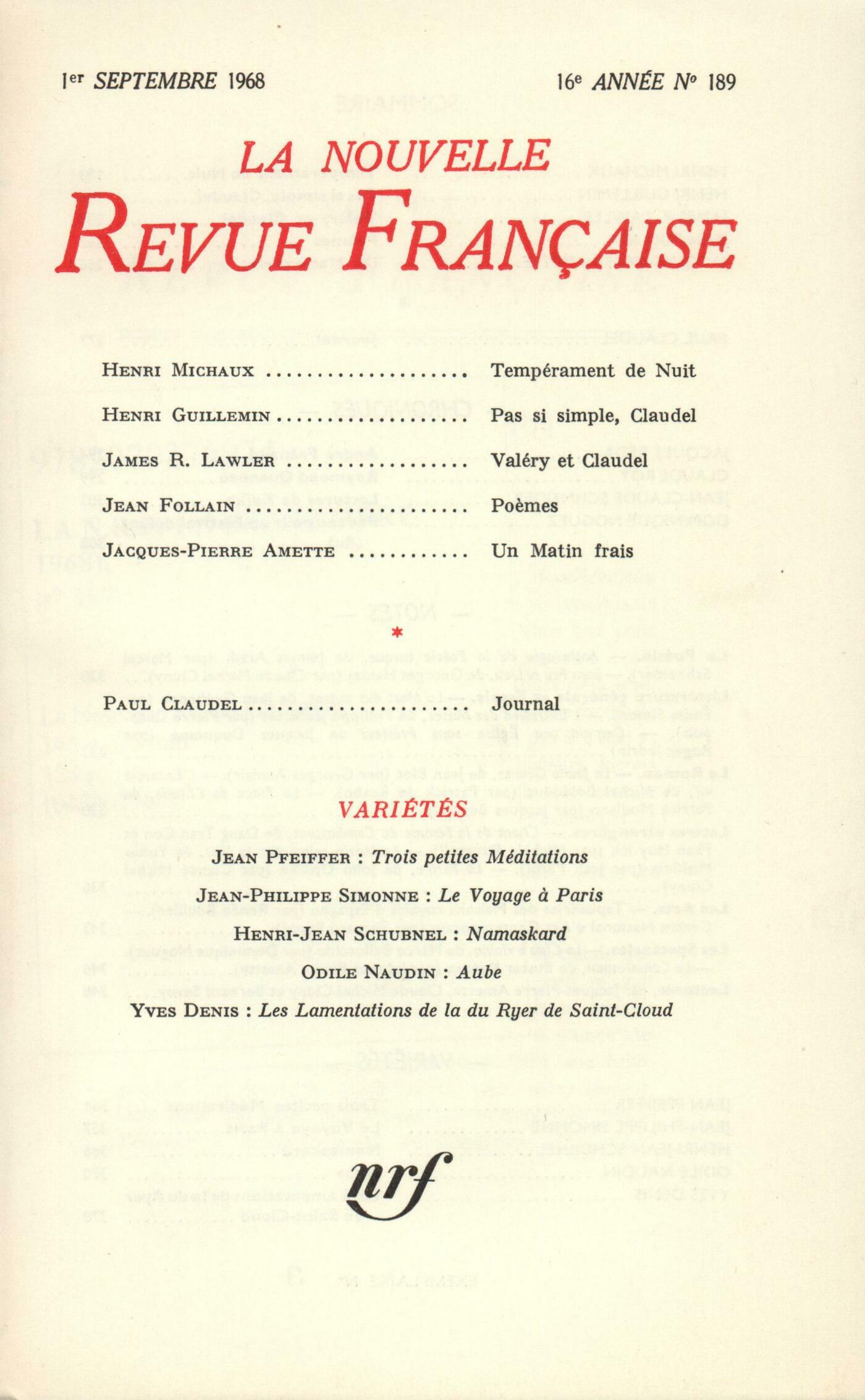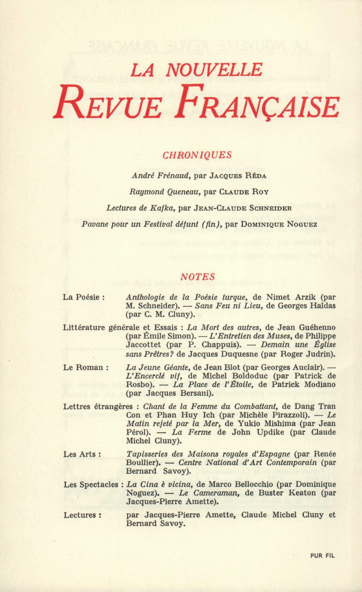 Henri Michaux, Tempérament de nuitHenri Guillemin, Pas si simple, ClaudelJames R. Lawler, Valéry et ClaudelJean Follain, PočmesJacques-Pierre Amette, Un matin fraisPaul Claudel, JournalChroniques : Jacques Réda, André FrénaudClaude Roy, Raymond QueneauJean-Claude Schneider, Lectures de KafkaDominique Noguez, Pavane pour un Festival défunt (Fin)Notes : la poésie : Marcel Schneider, Anthologie de la poésie turque, par Nimet Arsik (Gallimard)Claude Michel Cluny, Sans feu ni lieu, par Georges Haldas (Éditions Rencontre)Notes : littérature générale et essais : Émile Simon, La Mort des autres, par Jean Guéhenno (Grasset)Pierre Chappuis, L'entretien des muses, par Philippe Jaccottet (Gallimard)Roger Judrin, Demain une Église sans prętres?, par Jacques Duquesne (Grasset)Notes : le roman : Georges Auclair, La Jeune Géante, par Jean Blot (Gallimard)Patrick de Rosbo, L'encerclé vif, par Michel Boldoduc (Gallimard)Jacques Bersani, La Place de l'Étoile, par Patrick Modiano (Gallimard)Notes : lettres étrangčres : Michčle Pirazzoli-t'Serstevens, Chant de la femme du combattant, par Dang Tran Con et Phan Huy Ich (Gallimard)Jean Pérol, Le marin rejeté par la mer, par Yukio Mishima (Gallimard)Claude Michel Cluny, La Ferme, par John Updike (Éditions du Seuil)Notes : les arts : Renée Boullier, Tapisseries des Maisons royales d'Espagne (Bordeaux)Bernard Savoy, Création du ŤCentre national d'Art contemporainť (C.N.A.C.)Notes : les spectacles : Dominique Noguez, La Cina č vicina, de Marco BellocchioJacques-Pierre Amette, Le Cameraman, de Buster KeatonLectures : Claude Michel Cluny, Argyne et les gypačtes, de Louis Foucher (Seghers)Jacques-Pierre Amette, L'Ami, par Bruno Gay-Lussac (Gallimard)Bernard Savoy, Le soldat sans tambour, par Jean-Philippe Simonne (Flammarion)Jacques-Pierre Amette, Les enfants et les fous, par Erich Fried (Gallimard)Variétés : Jean Pfeiffer, Trois petites méditationsJean-Philippe Simonne, Le voyage ŕ ParisHenri-Jean Schubnel, NamaskardOdile Naudin, AubeYves Denis, Les Lamentations de la du Ryer de Saint-Cloud