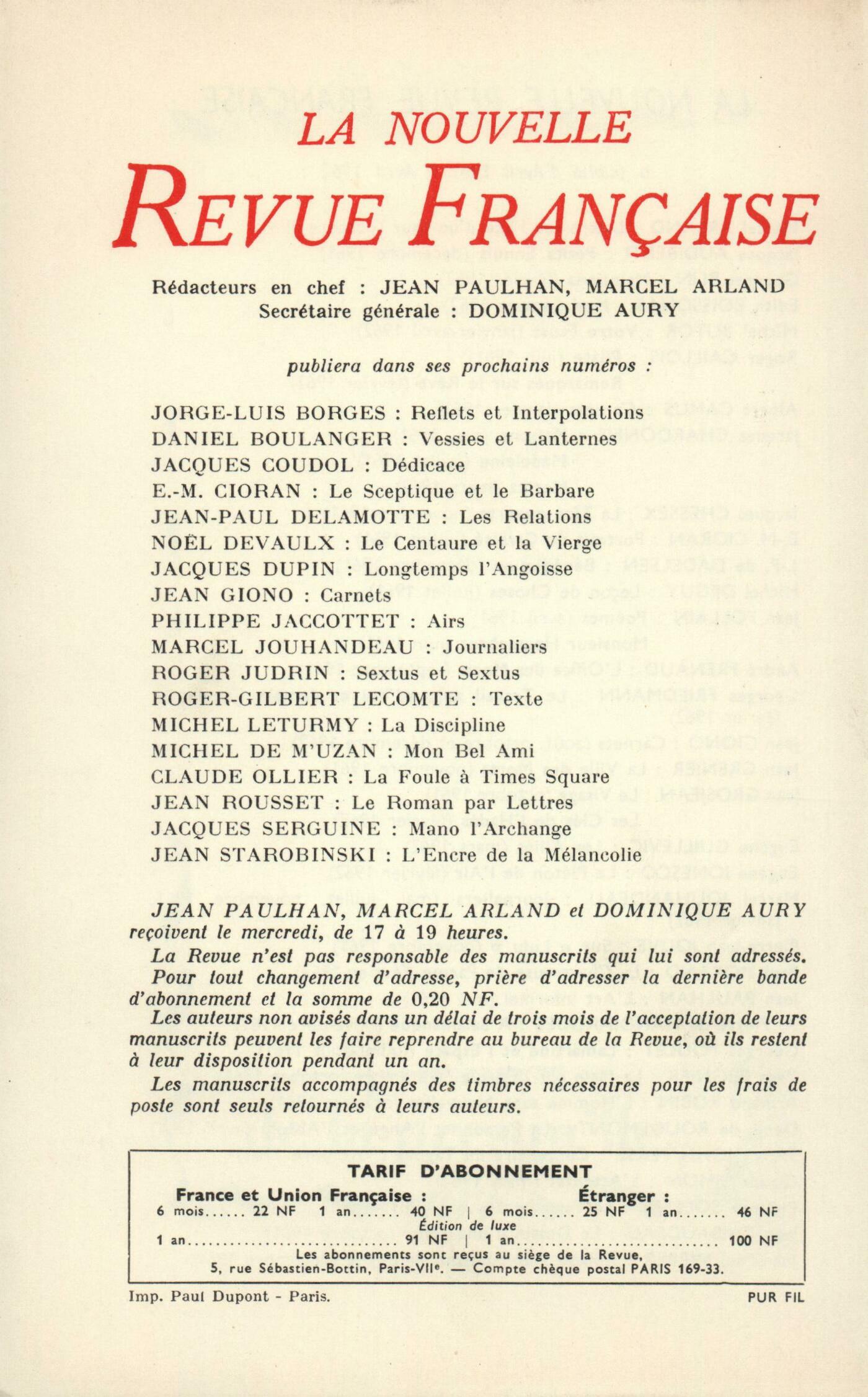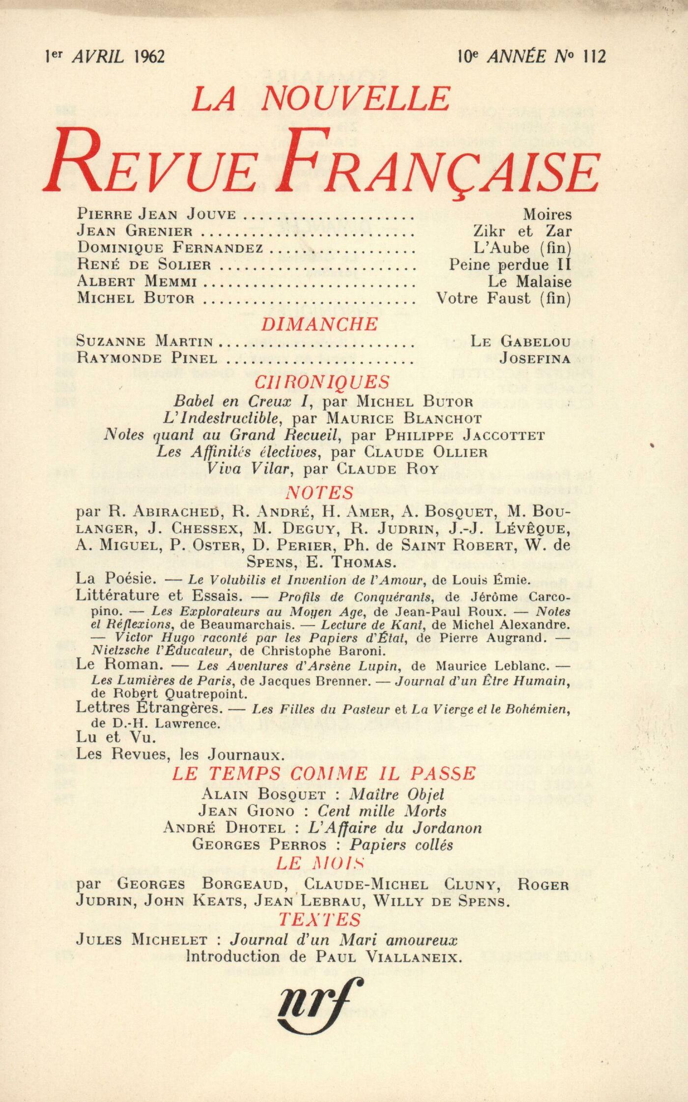 Pierre Jean Jouve, MoiresJean Grenier, Zikr et ZarDominique Fernandez, L'Aube (Fin)René de Solier, Peine perdue (II)Albert Memmi, Le MalaiseMichel Butor - Henri Pousseur, Votre Faust (Fin)Dimanche : Suzanne Martin, Le GabelouRaymonde Pinel, CosefinaChroniques : Maurice Blanchot, L'IndestructibleMichel Butor, Babel en creuxPhilippe Jaccottet, Notes quant au Grand RecueilClaude Roy, Viva VilarClaude Ollier, Les Affinités électivesNotes : Jean Revol, Ŕ la mémoire d'André LhoteNotes : la poésie : Alain Bosquet, Le Volubilis et Invention de l'amour, par Louis Émié (Yves Filhol)Notes : littérature et essais : Philippe de Saint-Robert, Profils de conquérants, par Jérôme Carcopino (Flammarion)Henry Amer, Les explorateurs au Moyen Âge, par Jean-Paul Roux (Le Seuil)Roger Judrin, Notes et réflexions, de Beaumarchais (Hachette)Michel Deguy, Lecture de Kant, par Michel Alexandre (P. U. F.)Édith Thomas, Victor Hugo raconté par les papiers d'État, par Pierre Angrand (Gallimard)Roger Judrin, Nietzsche l'éducateur, par Christophe Baroni (Corréâ)Notes : le roman : Michel Boulanger, Les Aventures d'Arsčne Lupin, gentleman-cambrioleur, par Maurice Leblanc (Hachette-Gallimard)Jacques Chessex, Les Lumičres de Paris, par Jacques Brenner (Julliard)Robert Abirached, Journal d'un ętre humain, par Robert Quatrepoint (Denoël)Notes : lettres étrangčres : Robert André, Les Filles du Pasteur, par D. H. Lawrence (Gallimard) - La Vierge et le Bohémien, par D. H. Lawrence (Plon)Lu et vu : Pierre Oster, Choix de počmes, d'Angčle Vannier (Seghers)André Miguel, Les oiseaux font bouger le ciel, par Gabrielle Marquet (Gallimard)Denis Périer, L'Épi monstre, par Nikolas Genka (Julliard)André Miguel, Ŕ la recherche d'un miroir, par Jean Reverzy (Julliard) - Selon toute vraisemblance, par Albert Ayguesparse (La Renaissance du Livre)Robert André, Cahiers français, par Ilya Ehrenbourg (Fasquelle)Willy de Spens, Petit déjeuner chez Tiffany, par Truman Capote (Gallimard) - Théâtre, de François Billetdoux (La Table Ronde)Denis Périer, Rétrospective Friesz (Galerie Montmorency) - Bernard Buffet (Galerie David et Garnier)Jean-Jacques Lévęque, Schneider (Galerie Arditti) - Mihailovitch (Galerie Ariel)Les revues, les journaux : Giuseppe Ungaretti, PočmesHenri Massis, Ŕ propos de Tagore Anonymes, Bizarreries - DiversLe temps, comme il passe : Jean Giono, Cent mille mortsAlain Bosquet, Maître objetAndré Dhôtel, L'Affaire du JordanonGeorges Perros, Papiers collésLe mois : Roger Judrin, L'Arche et la ColombeJohn Keats, Ode sur la mélancolieJean Lebrau, BrindillesGeorges Borgeaud, Des emballagesWilly de Spens, Campagne 1962Textes : Jules Michelet, Journal d'un mari amoureux