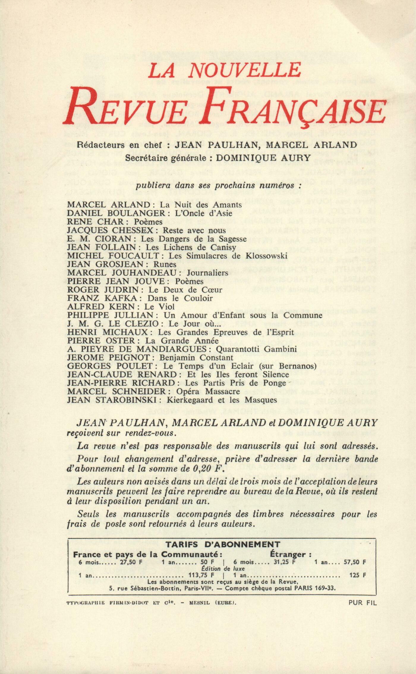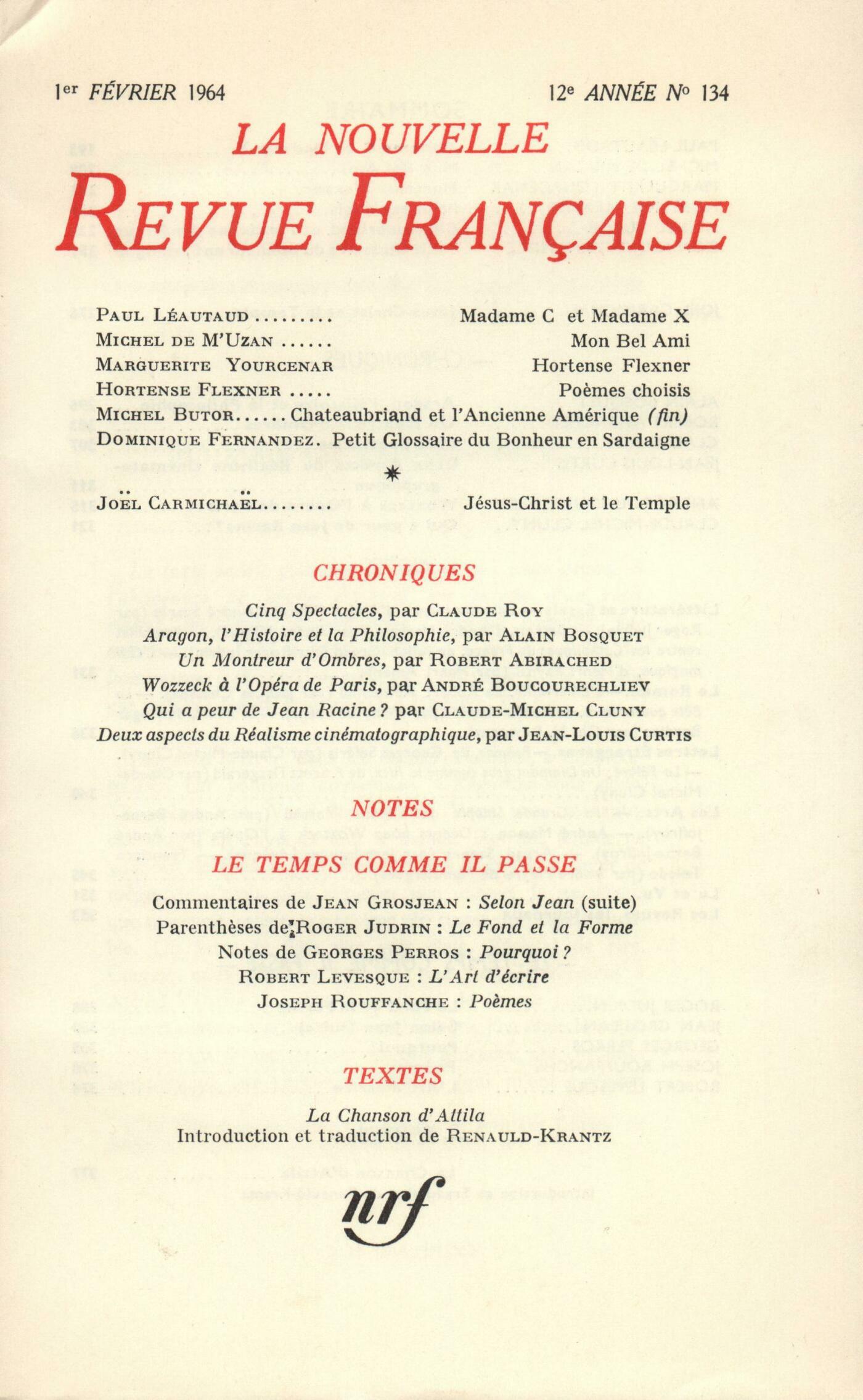 Paul Léautaud, Madame C... et Madame X...Michel de M'Uzan, Mon Bel AmiMarguerite Yourcenar, Hortense FlexnerHortense Flexner, Počmes choisisMichel Butor, Chateaubriand et l'ancienne Amérique (Fin)Dominique Fernandez, Petit glossaire du bonheur en SardaigneJoël Carmichael, Jésus-Christ et le TempleChroniques : Alain Bosquet, Aragon, l'Histoire et la philosophieRobert Abirached, Un montreur d'ombresChroniques. Le théâtre : Claude Roy, Cinq spectaclesChroniques : Jean-Louis Curtis, Deux aspects du réalisme cinématographiqueAndré Boucourechliev, Wozzeck ŕ l'Opéra de ParisClaude Michel Cluny, Qui a peur de Jean Racine?Notes : littérature et essais : Roger Judrin, Correspondance d'André Gide et André Suarčs (Gallimard)André Miguel, Beckett, par André Marissel (Éditions Universitaires)Roger Judrin, Pamphlet contre les catholiques de France, par Julien Green (Plon)Henry Amer, L'il magique, par Henri Raynal (Le Seuil)Notes : le roman : Jacques Chessex, L'Émerveillée, par Robert Abirached (Grasset)Willy de Spens, La Bęte quaternaire, par Renée Massip (Gallimard)Charles-Henry Reymont, Le Mime, par Roger Bordier (Calmann-Lévy)Notes : lettres étrangčres : Claude Michel Cluny, Počmes, de Georges Séféris (Mercure de France) - La Fęlure, par F. Scott Fitzgerald (Gallimard) - Un diamant gros comme le Ritz, par F. Scott Fitzgerald (Laffont)Notes : les arts : André Berne-Joffroy, La grande Ťsinopiať de Simone Martini - Décors pour Wozzeck ŕ l'Opéra, d'André MassonJean-Jacques Lévęque, Arpad Szenes (Galerie Jeanne Bucher)André Pieyre de Mandiargues, Francisco Toledo (Galerie Karl Flinker)Lu et vu : Jean Lebrau, Aux vitres de l'Éternité, par Armand Bernier (Les Cahiers du Nord)Willy de Spens, L'Okapi, par Philippe Diolé (Gallimard)Jean Guérin, Un autre monde, par Grandville (Club des Libraires)Jean-Philippe Salabreuil, Lars Bo (Galerie des Peintres Graveurs)Les revues : Henry Miller, Ô lac de lumičre Roland-Manuel, Ŕ la recherche d'Armand RobinJean Guérin, DiversLe temps comme il passe : Roger Judrin, Le fond et la formeJean Grosjean, Commentaires selon Jean (III)Georges Perros, Pourquoi?Joseph Rouffanche, PočmesRobert Levesque, L'art d'écrireTextes : Anonymes, La Chanson d'Attila