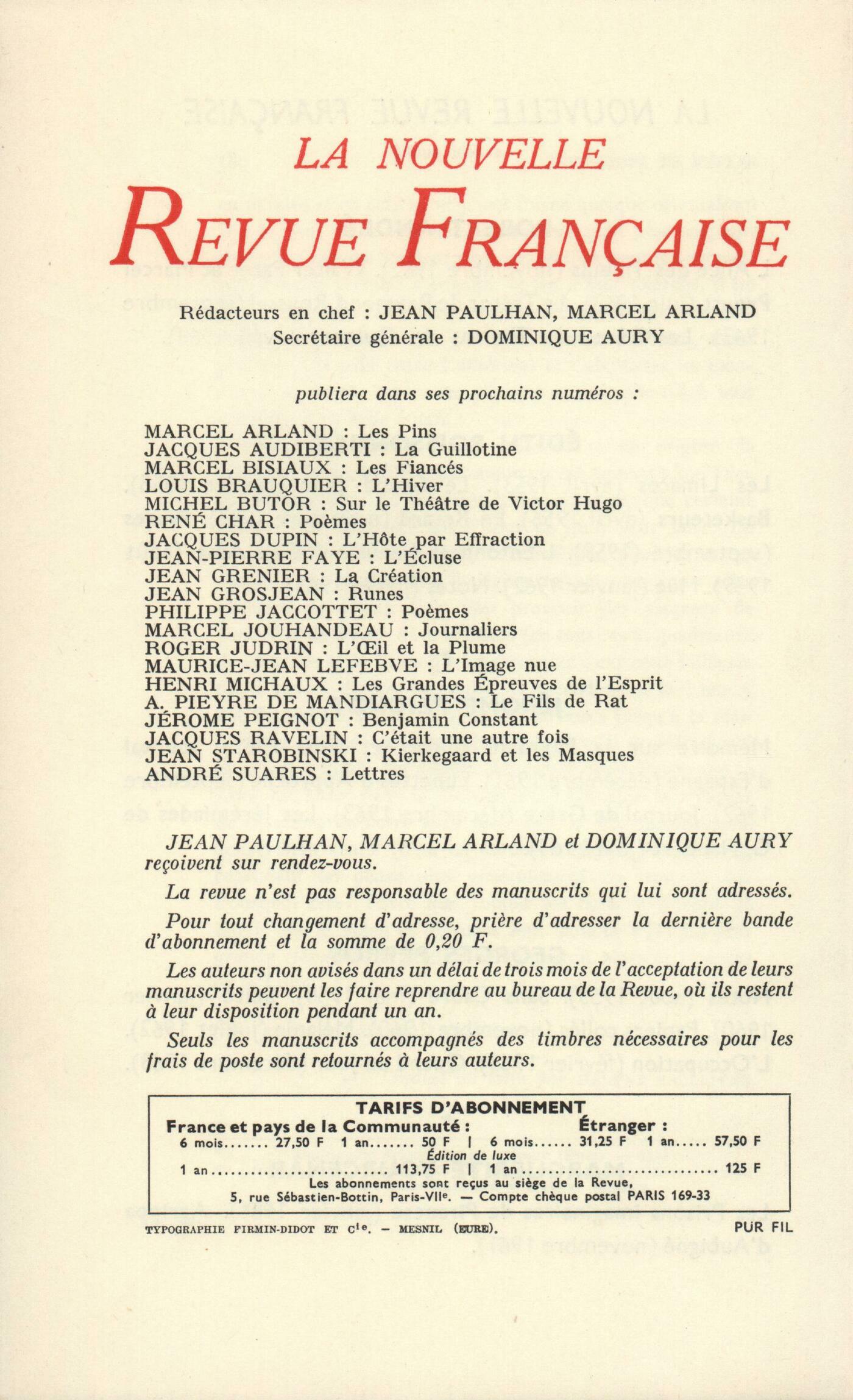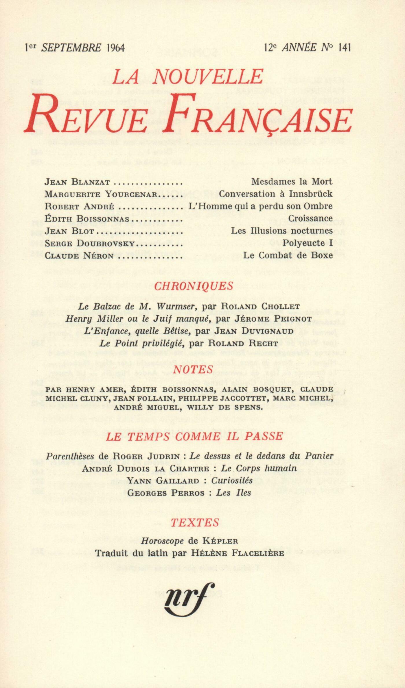 Jean Blanzat, Mesdames la MortMarguerite Yourcenar, La conversation ŕ InnsbrückRobert André, Lettre sur l'homme qui a perdu son ombreÉdith Boissonnas, PočmesJean Blot, Les Illusions nocturnesSerge Doubrovsky, Polyeucte ou La conquęte de DieuClaude Néron, Le combat de boxeChroniques : Roland Chollet, Le Balzac de M. WurmserRoland Recht, Le point privilégiéJean Duvignaud, L'enfance, quelle bętise!Jérôme Peignot, Henry Miller ou Le Juif manquéNotes : la poésie : Alain Bosquet, Počtes révolutionnaires du QuébecNotes : littérature et essais : Henry Amer, Alchimie, par Eugčne Canseliet (J.-J. Pauvert)Jean Follain, Journal, de Raďssa Maritain (Desclée de Brouwer)Willy de Spens, Ionesco, par Philippe Sénart (Éditions Universitaires)Notes : lettres étrangčres : André Miguel, Peintre inconnu, par Véniamine Kavérine (Gallimard)Marc Michel, Bętes de notre temps, par Aldo Palazzeschi (Julliard)André Miguel, La Descente du Styx, par Lawrence Durrell (La Murčne)Claude Michel Cluny, Un Amour, par Dino Buzzati (Robert Laffont)Notes : les arts : Édith Boissonnas, VasarelyLu et vu : André Miguel, Répons, par Pierre Torreilles (G.L.M.)Philippe Jaccottet, La Description de l'homme, du cadre et de la lyre, par Fouad Gabriel Naffah (Mercure de France)André Miguel, Campagnes secrčtes, par Jean Joubert (Cahiers de la Licorne) - Certaines choses naturelles, par James Laughlin (Seghers)Claude Michel Cluny, Céline ou La multiplication, par Dominique Halévy (Denoël)André Miguel, Soho ŕ la dérive, par Colin Wilson (Gallimard)Janine Béraud, Laubičs (Galerie Facchetti)Le temps comme il passe. Parenthčses : Roger Judrin, Le dessus et le dedans du panierLe temps comme il passe : Georges Perros, Les ÎlesAndré Dubois La Chartre, Le corps humainYann Gaillard, CuriositésTextes : Jean Kepler, Horoscope