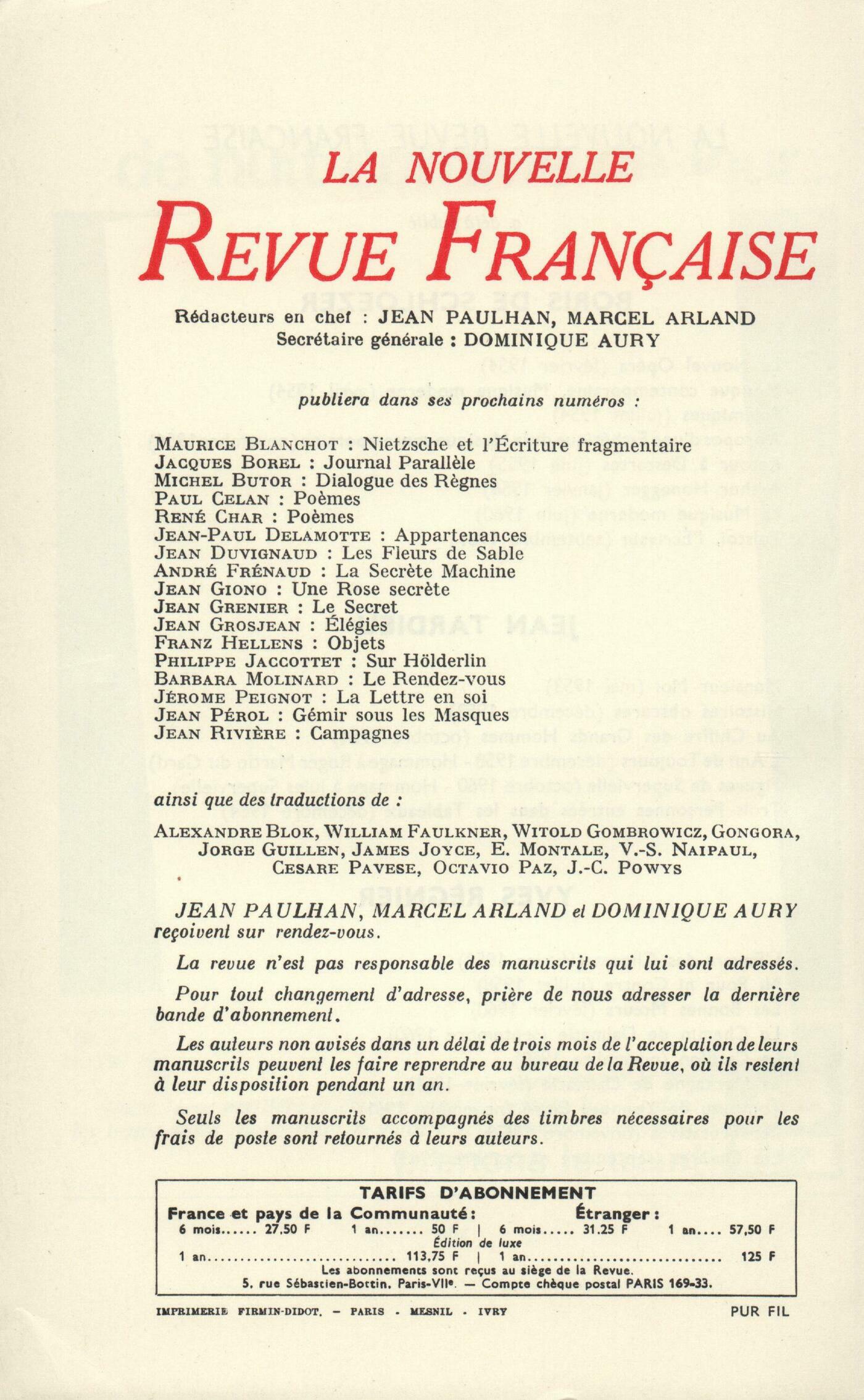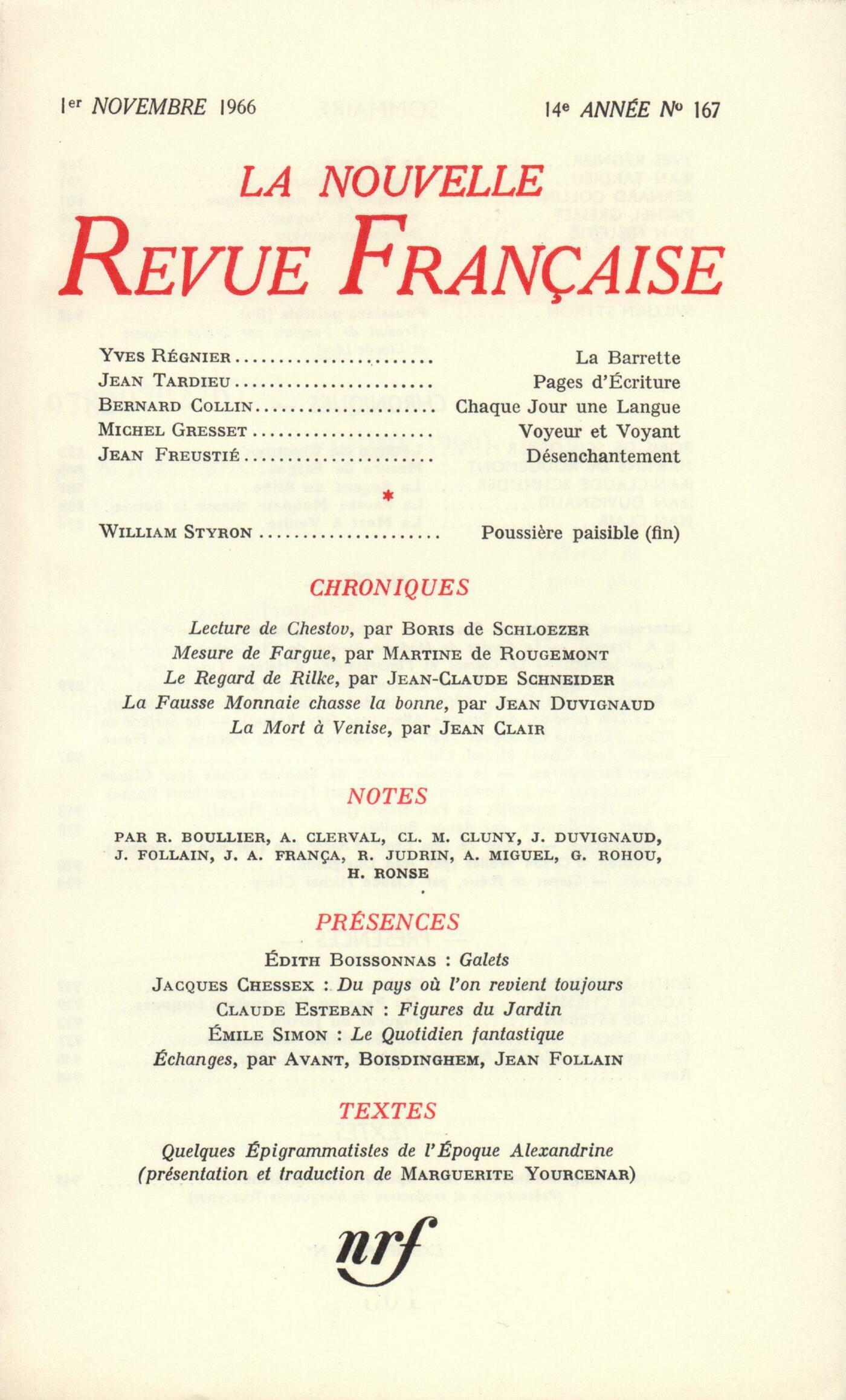 Yves Régnier, La BarretteJean Tardieu, Pages d'écritureBernard Collin, Chaque jour une langueMichel Gresset, Voyeur et voyantJean Freustié, DésenchantementWilliam Styron, Poussičre paisible ( Fin)Chroniques : Boris de Schlzer, Lecture de ChestovMartine de Rougemont, Mesure de FargueJean-Claude Schneider, Le regard de RilkeJean Duvignaud, La fausse monnaie chasse la bonneJean Clair, La Mort ŕ Venise ou La XXXIIIe BiennaleNotes : littérature générale et essais : J.-A. França, L'espace et le regard, par Jean Paris (Le Seuil)Roger Judrin, La genčse de Madame Bovary, par Claudine Gothot-Mersch (José Corti)Jean Follain, Le cosmos et l'imagination, par Hélčne Tuzet (José Corti) - Catherine de Russie, par Zoé Oldenbourg (Gallimard)Notes : le roman : Alain Clerval, Le Chinois d'Afrique, par Robert Sabatier (Albin Michel)Guy Rohou, Le Lieu commun, par Suzanne Allen (Gallimard) - La surface de l'eau, par Eugénie de Keyser (Gallimard)Claude Michel Cluny, La Matasse, par Pierre Boudot (Gallimard)Notes : lettres étrangčres : Claude Michel Cluny, Le Bateau ouvert, par Stephen Crane (Mercure de France)Henri Ronse, Le Lieutenant Kijé, par Iouri Tynianov (Gallimard)André Miguel, Une femme tranquille, par Paul Smith (Albin Michel)Notes : les arts : Renée Boullier, BissičreNotes : les spectacles : Jean Duvignaud, Lettres ŕ Roger Blin, par Jean Genet (Gallimard) - Falstaff, d'Orson WellesCarnet de lectures : poésie : Claude Michel Cluny, Alyscamps, par Jean-Paul Guibbert (Mercure de France) - Počmes de la mort juive, par Robert Mallat (Pierre-Jean Oswald) - Feux et recueillements, par Michel Carrez (Éditions Universitaires)Présences : Édith Boissonnas, GaletsJacques Chessex, Le pays oů l'on revient toujoursClaude Esteban, Figures du jardinÉmile Simon, Le quotidien fantastiqueÉchanges : Avant, Automne Boisdinghem, Denrée périssableJean Follain, Chronique du goűt Anonymes, Revue - MémentoTextes : Collectifs, Quelques épigrammatistes de l'époque alexandrine