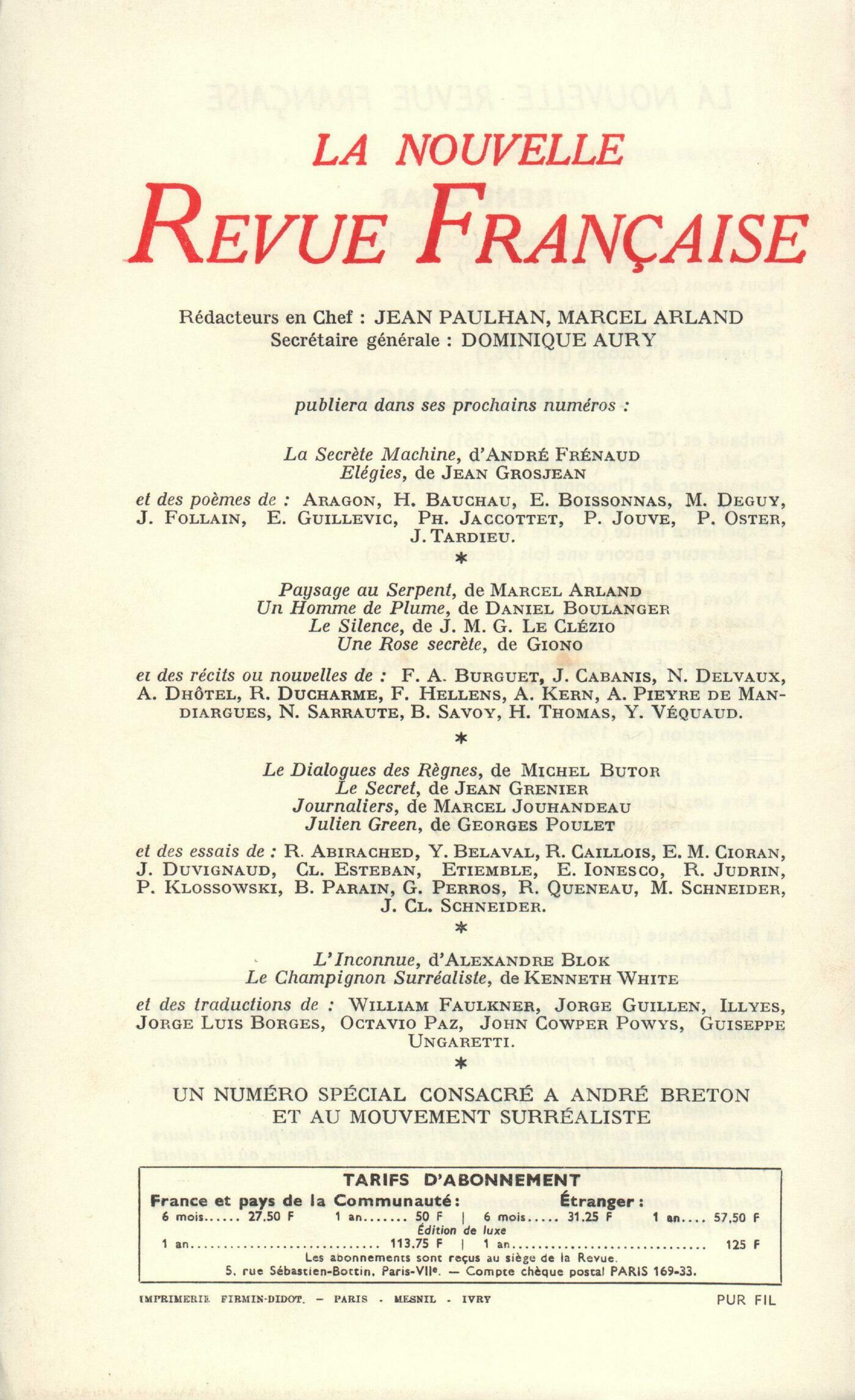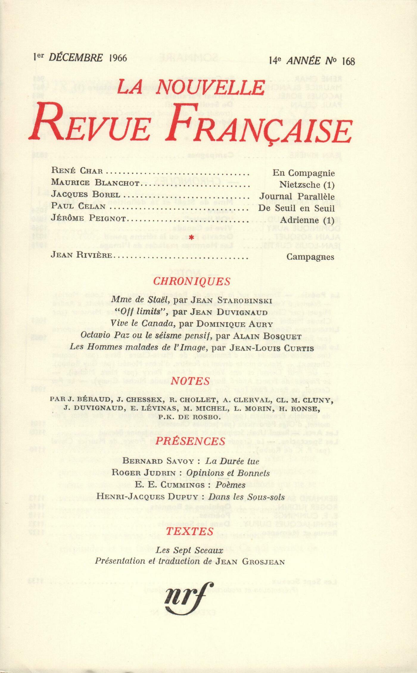 René Char, En compagnieMaurice Blanchot, Nietzsche et l'écriture fragmentaireJacques Borel, Journal parallčlePaul Celan, De seuil en seuilJérôme Peignot, AdrienneJean Rivičre, CampagnesChroniques : Jean Starobinski, Mme de Staël et la définition de la littératureJean Duvignaud, ŤOff limitsťDominique Aury, Vive le CanadaAlain Bosquet, Octavio Paz ou Le séisme pensifJean-Louis Curtis, Les hommes malades de l'imageNotes : la poésie : Louis Morin, Travaux sur la Terre, par Robert Marteau (Le Seuil)Claude Michel Cluny, Počmes, d'Yves Martin (Guy Chambelland) - Fables de nuit, par André Miguel (Pierre-Jean Oswald) - Carré blanc, par Joyce Mansour (Le Soleil Noir)Notes : littérature générale et essais : Emmanuel Lévinas, Une voix de fin silence, par Roger Laporte (Gallimard)Henri Ronse, Le Jeu et les philosophesNotes : le roman : Guy Rohou, La Bataille de Toulouse, par José Cabanis (Gallimard)Jacques Chessex, Une saison dans la vie d'Emmanuel, par Marie-Claire Blais (Grasset)Guy Rohou, Nature morte devant la fenętre, par Irčne Monési (Mercure de France)Marc Michel, Un petit cheval et une voiture, par Anne Perry (Gallimard)Claude Michel Cluny, Le Protégé, par Frantz André Burguet (Gallimard)Guy Rohou, Le Feu central, par René Pons (Gallimard)Notes : lettres étrangčres : Jean Duvignaud, De sang-froid, par Truman Capote (Gallimard)Roland Chollet, Les Fenętres d'or et autres récits, par Adolf Rudnicki (Gallimard)Alain Clerval, Le Soleil de la mort, par Pandelis Prevelakis (Gallimard)Jacques Chessex, Des enfants et des bętes s'aimaient, par Olga Pérovskaďa (Fernand Nathan)Notes : les arts : Janine Béraud, Sculptures et peintures, de Raoul Dubac (Galerie Maeght)Notes : les spectacles : Patrick de Rosbo, La Grande Pitié du royaume de France, par Maurice Clavel (Gallimard)Présences : Bernard Savoy, La durée tueRoger Judrin, Opinions et bonnetsE.E. Cummings, PočmesHenri-Jacques Dupuy, Dans les sous-sols Anonymes, Revue - MémentoTextes : Saint Jean, Les Sept Sceaux