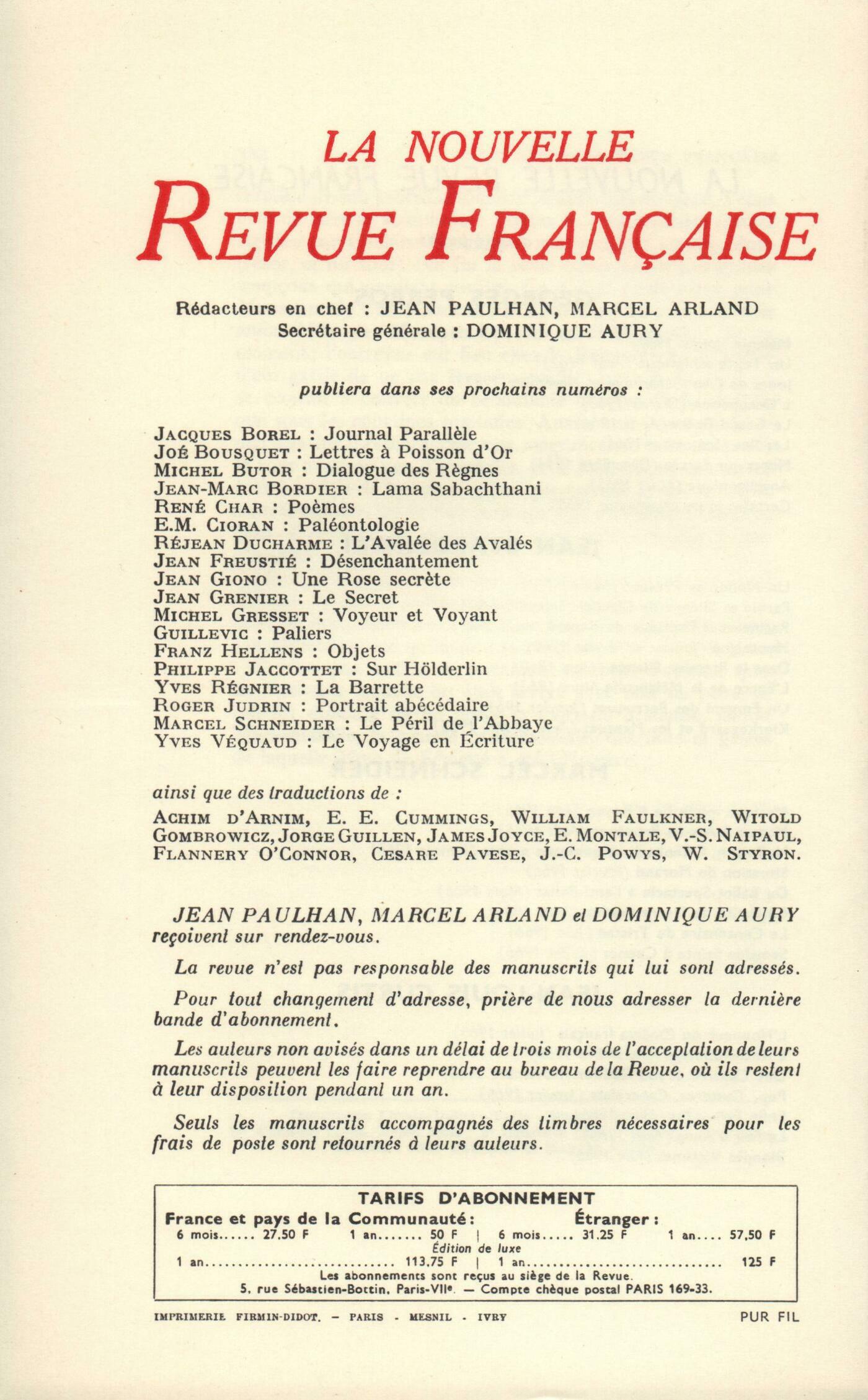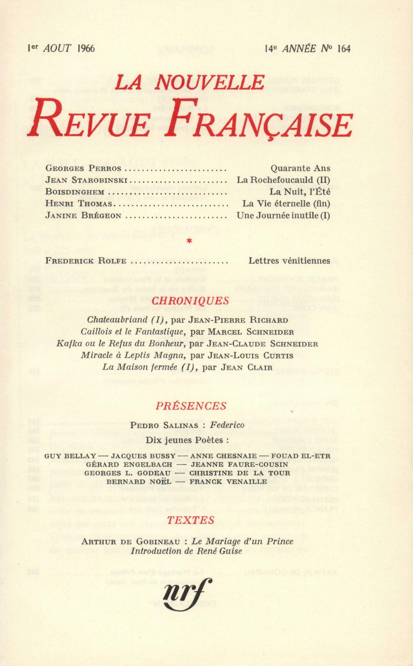 Georges Perros, Quarante ansJean Starobinski, La Rochefoucauld et les morales substitutives (Fin) Boisdinghem, La nuit, l'étéHenri Thomas, La Vie éternelle (Fin)Janine Brégeon, Une journée inutileOdile de Lalain, ŤLes Lettres vénitiennes, écrites par Fréderick Rolfe ŕ un ami, ont été publiées pour...ťFrederick Rolfe, Extraites des Lettres vénitiennesChroniques : Jean-Pierre Richard, Chateaubriand, la civilisation, l'histoireMarcel Schneider, Roger Caillois, déchiffreur du fantastiqueJean-Claude Schneider, Kafka ou Le refus du bonheurJean-Louis Curtis, Miracle ŕ Leptis MagnaJean Clair, La Maison ferméePrésences : Pedro Salinas, FedericoGuy Bellay, PočmesJacques Bussy, DixainsAnne Chesnaie, Du côté de la TerreFouad El-Etre, PočmesGérard Engelbach, PočmesJeanne Faure-Cousin, Dit sur le sable...Georges-L. Godeau, Des enfantsChristine de La Tour, Vaisseau de l'ombreBernard Noël, La face de silenceFranck Venaille, L'été n'en finit pasTextes : Arthur de Gobineau, Le Mariage d'un Prince
