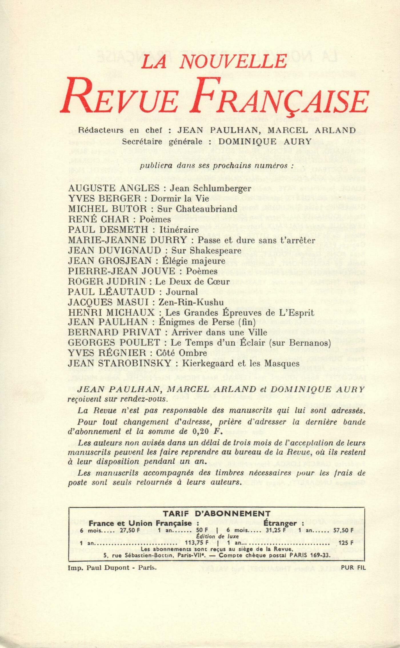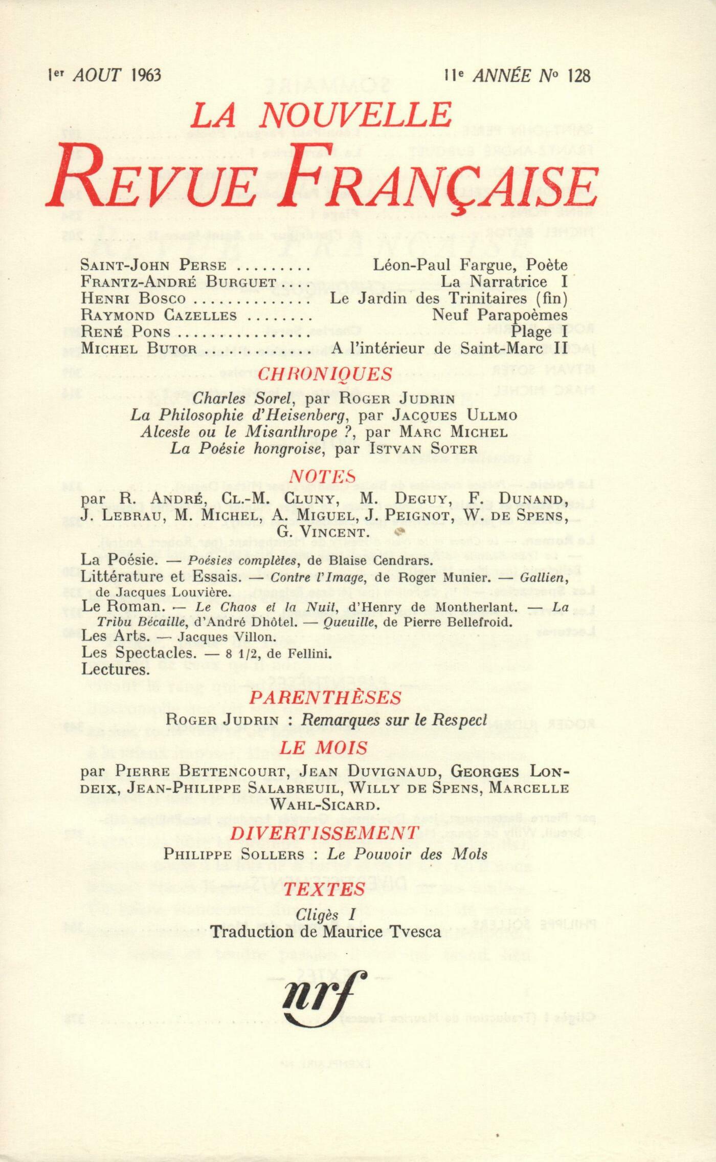 Saint-John Perse, Léon-Paul Fargue, PočteFrantz André Burguet, La NarratriceHenri Bosco, Le Jardin des Trinitaires (Fin)Raymond Cazelles, Neuf parapočmesRené Pons, PlageMichel Butor, Ŕ l'intérieur de Saint-Marc (II)Chroniques : Roger Judrin, Charles SorelJean Ullmo, La philosophie d'HeisenbergIstvan Sötér, Sur la poésie hongroiseMarc Michel, Alceste ou le Misanthrope?Notes : la poésie : Michel Deguy, Poésies complčtes, de Blaise Cendrars (Denoël)Notes : littérature et essais : Michel Deguy, Contre l'Image, par Roger Munier (Gallimard)Claude Michel Cluny, Gallien, par Jacques Louvičre (Le Seuil)Notes : le roman : Robert André, Le Chaos et la Nuit, par Henry de Montherlant (Gallimard)Marc Michel, La Tribu Bécaille, par André Dhôtel (Gallimard) - Gueuille, par Pierre Bellefroid (Gallimard)Notes : les spectacles : Jérôme Peignot, 8 ˝, de FelliniNotes : les arts : Frank Dunand, Jacques VillonLectures : Gilbert Vincent, Fenčstrou, par Fernand Moutet (Imprimerie Francou)Jean Lebrau, Bréviaire des Ténčbres, par Raoul Bécousse (Jean Subervie)André Miguel, Les Neiges de juillet, par Jean Joubert (Julliard)Willy de Spens, L'Horloge sans aiguilles, par Carson Mc Cullers (Stock) - L'Île au rhum, par Simon Vestdijk (Gallimard)Les revues, les journaux : René Char, Sept parcelles de LuberonGeorges Poulet, [Sur la poésie de Char]Gabriel Bounoure, [Sur la poésie de Char]Léon Deubel, Max Jacob vu par Léon DeubelVincent Muselli, Propos de Muselli Anonymes, D'un curieux accidentJean Guérin, Mathias Lübeck - DiversParenthčses : Roger Judrin, Remarques sur le respectLe mois : Marcelle Wahl-Sicard, Le souvenir de Jean AmroucheJean Duvignaud, Phčdre au MaghrebJean-Philippe Salabreuil, La ParoissienneWilly de Spens, PlaidoyersPierre Bettencourt, Mon filsGeorges Londeix, La Semaine sainte chez les TarahumarasDivertissement : Philippe Sollers, Le Pouvoir des MotsTextes : Maurice Toesca, ŤCligčs, c'est l'anti-Tristan. Chrétien de Troyes lui-męme nous le dit et nous l'explique...ť Chrétien de Troyes, Cligčs