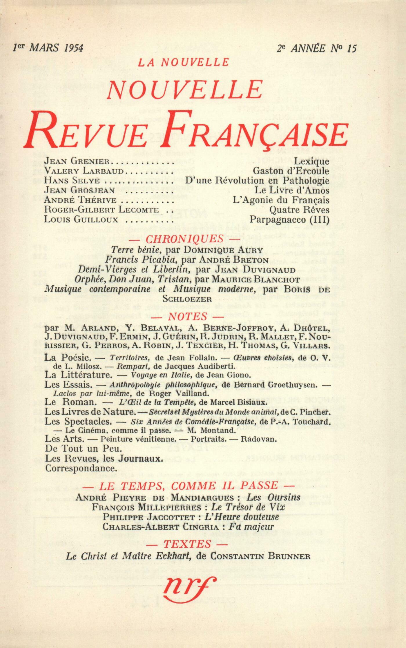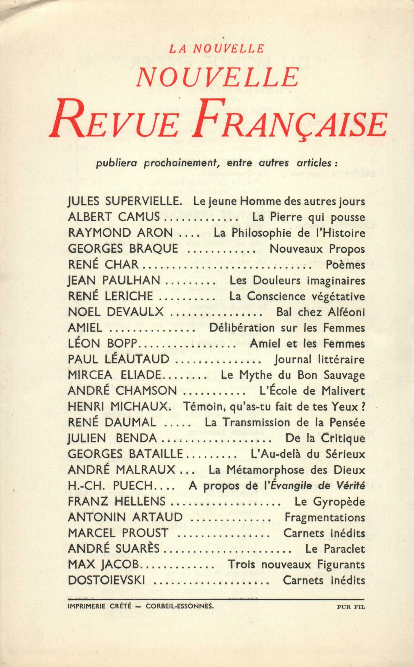 Jean Grenier, LexiqueValery Larbaud, Gaston d'ErcouleHans Selye, D'une révolution en pathologieJean Grosjean, Le Livre d'AmosAndré Thérive, L'agonie du françaisRoger Gilbert-Lecomte, Quatre ręvesArthur Adamov, Notes [sur Quatre ręves]Louis Guilloux, Parpagnacco (III)Chroniques : André Breton, Francis PicabiaChroniques : recherches : Maurice Blanchot, Orphée, Don Juan, TristanChroniques : les romans : Dominique Aury, Terre bénieChroniques : le théâtre : Jean Duvignaud, Demi-Vierges et LibertinChroniques : la musique : Boris de Schlzer, Musique contemporaine, musique moderneNotes : la poésie : Henri Thomas, Territoires, par Jean Follain - uvres choisies, de O. V. de L. Milosz Armand Robin, Rempart, par Jacques Audiberti Notes : la littérature : Georges Perros, Voyage en Italie, par Jean Giono Notes : les essais : Yvon Belaval, Anthropologie philosophique, par Bernard Groethuysen Roger Judrin, Laclos par lui-męme, par Roger Vailland Notes : le roman : Henri Thomas, L'il de la Tempęte, par Marcel Bisiaux Notes : les livres de nature : André Dhôtel, Secrets et mystčres du monde animal, par Chapman Pincher Notes : les spectacles : Jean Duvignaud, Six années de Comédie-Française, par Pierre-Aimé Touchard François Nourissier, Le cinéma, comme il passe...Jean Texcier, M. MontandNotes : les arts : André Berne-Joffroy, Chefs-d'uvre vénitiens - Portraits Marcel Arland, Radovan (Zagreb)De tout un peu : Gilbert Villars, Impasse du romarin, par Jean Lebrau - Poésie choisie, par René Laporte - Lampions et coloquintes, par Marcel Béalu Jean Guérin, Les rats, par Bernard Frank France Ermin, Le Mercenaire, par Pierre Fisson Gilbert Villars, Du rififi chez les hommes, par Auguste Le Breton - Maudit soit ce jour, par Gerald Gardon Jean Duvignaud, Le Songe d'une Nuit d'été, de Shakespeare - La Marche des Jongleurs, d'Isidore Isou - Le Monde des Accusés, de Walter Jans - La Volupté de l'Honneur, de Luigi Pirandello - Azouk, d'Alexandre Rivemale - Un inspecteur vous demande, de J.-B. Priestley - Carnet de notes, du ŤThéâtre des Gobbiť - Les Hussards, de P.-A. Bréal - Bel-Ami, de Frédéric Dard d'aprčs Guy de Maupassant Jean Guérin, Picasso, par Maurice Raynal André Berne-Joffroy, Peinture naďve - Tytgat Les revues, les journaux : Édith Boissonnas, Un počmeJean Guérin, Professionnels et amateurs - L'amour, l'assassinat - Histoire de la belle écuyčreCharles-Albert Cingria, Sur le langage de RamuzJean Guérin, DiversAndré Baudry -Marcel Jouhandeau, Correspondance François Millepierres, Le trésor de Vix Philippe Jaccottet, L'heure douteuse André Pieyre de Mandiargues, Les oursins Charles-Albert Cingria, Fa majeur Constantin Brunner, Le Christ et maître Eckhart