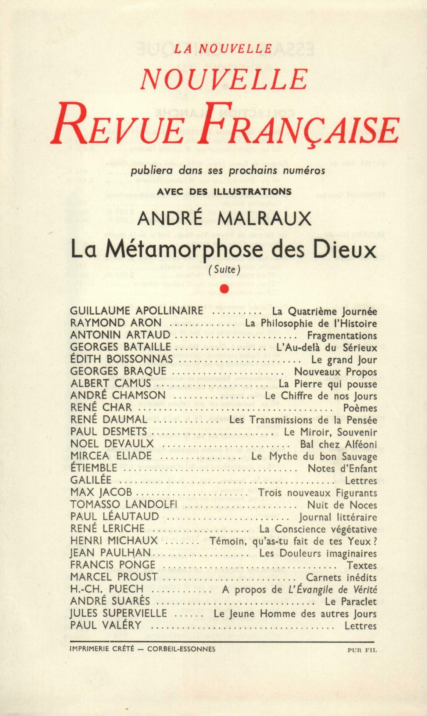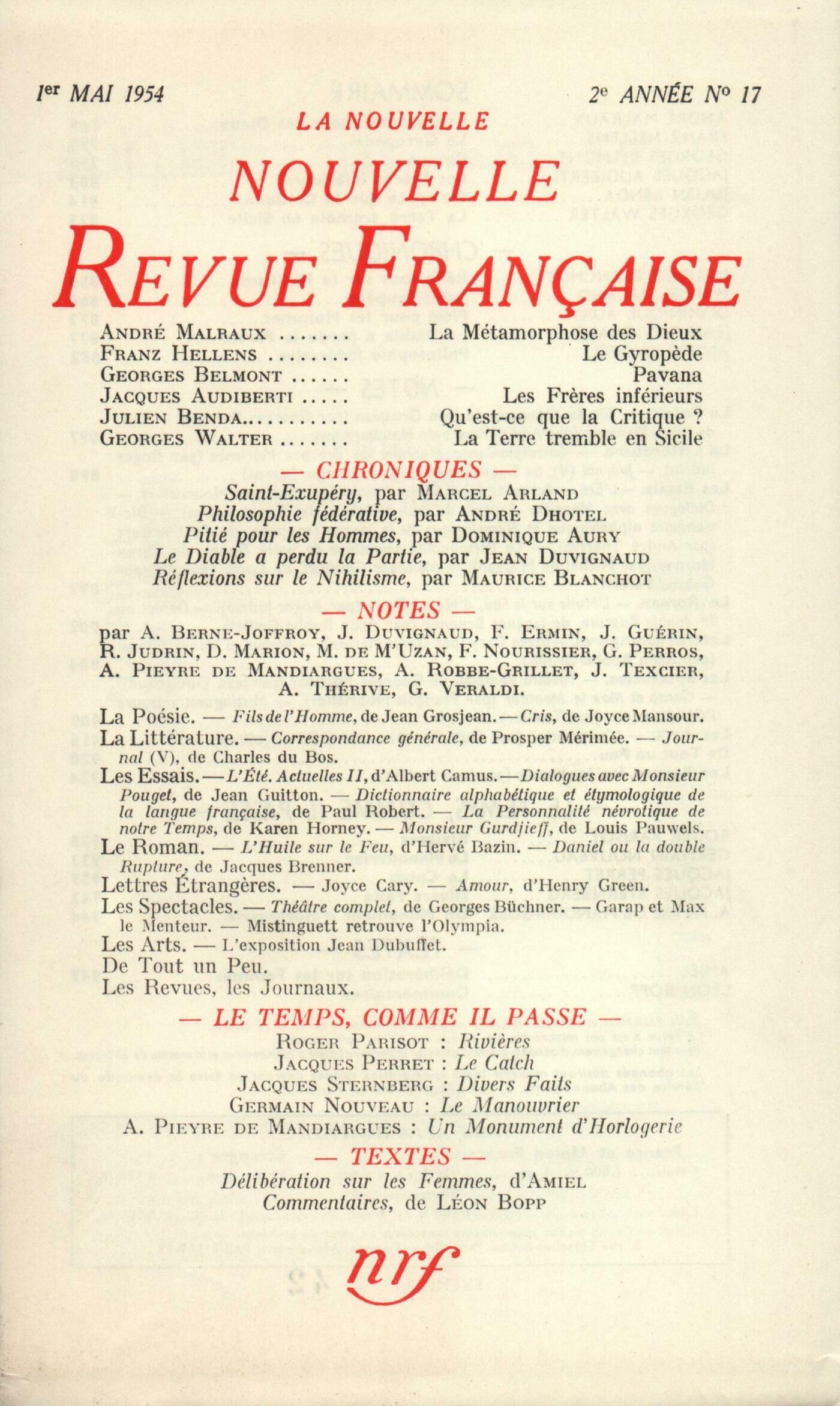 André Malraux, La Métamorphose des DieuxFranz Hellens, Le GyropčdeGeorges Belmont, PočmesJacques Audiberti, Les Frčres inférieursJulien Benda, Qu'est-ce que la critique?Georges Walter, La terre tremble en SicileChroniques : recherches : Maurice Blanchot, Réflexions sur le nihilisme (II)Chroniques : la littérature : Marcel Arland, De l'homme ŕ l'uvre : Saint-ExupéryChroniques : les romans : Dominique Aury, Pitié pour les hommesChroniques : le théâtre : Jean Duvignaud, Le Diable a perdu la partieChroniques : André Dhôtel, Philosophie fédérativeNotes : la poésie : Georges Perros, Fils de l'Homme, par Jean Grosjean (Gallimard)André Pieyre de Mandiargues, Cris, par Joyce Mansour (Seghers)Notes : la littérature : Roger Judrin, Correspondance générale, I, de Prosper Mérimée (Privat)Georges Perros, Journal, V, de Charles du Bos (La Colombe)Notes : les essais : François Nourissier, L'Été et Actuelles, II, par Albert Camus (Gallimard)Roger Judrin, Dialogues avec Monsieur Pouget, par Jean Guitton (Grasset)André Thérive, Dictionnaire alphabétique et analogique de la langue française, par Paul Robert (Presses Universitaires de France)Michel de M'Uzan, La personnalité névrotique de notre temps, par Karen Horney (L'Arche)Gabriel Veraldi, Monsieur Gurdjieff, par Louis Pauwels (Éditions du Seuil)Notes : le roman : Roger Judrin, L'Huile sur le feu, par Hervé Bazin (Grasset)Alain Robbe-Grillet, Daniel ou La double rupture, par Jacques Brenner (Gallimard)Notes : lettres étrangčres : Denis Marion, Joyce CaryAlain Robbe-Grillet, Amour, par Henry Green (Gallimard)Notes : les spectacles : Jean Duvignaud, Théâtre complet, de Georg Buchner (L'Arche)François Nourissier, Garap et Max le menteurJean Texcier, Mistinguett retrouve l'OlympiaNotes : les arts : André Berne-Joffroy, L'exposition Jean DubuffetDe tout un peu : Jean Guérin, Le Grand Film, par Jean L'Anselme (Cahiers de Rochefort)Georges Perros, Tableau des murs de ce temps, par Maurice Sachs (Gallimard)France Ermin, Monsieur d'Ustelles, par Jacques Perry (Julliard)Jean Duvignaud, Europe, du cardinal de Richelieu et de Desmarets de Saint-Sorlin (Salle Valhubert) - Si vous aimez ceux qui vous aiment, de Claude Baldy (Mathurins) - Le mari, la femme et la mort, d'André Roussin (Ambassadeurs) - Le Plaisir d'aimer, de Jean de Létraz (La Potiničre)François Nourissier, Closed Vision - Trouble in StoreAndré Pieyre de Mandiargues, Pointe sčche, par Jean-Jacques Kim (Seghers)Les revues, les journaux : Jean Guérin, Les Cahiers de l'Artisan - Changer la vie - DiversLe temps, comme il passe : Roger Parisot, Rivičres Sud Paris sur mer Fenętres de Buci...Germain Nouveau, Le ManouvrierJacques Perret, Le CatchJacques Sternberg, Divers faitsAndré Pieyre de Mandiargues, Un monument d'horlogerieTextes : Léon Bopp, Amiel et les femmes