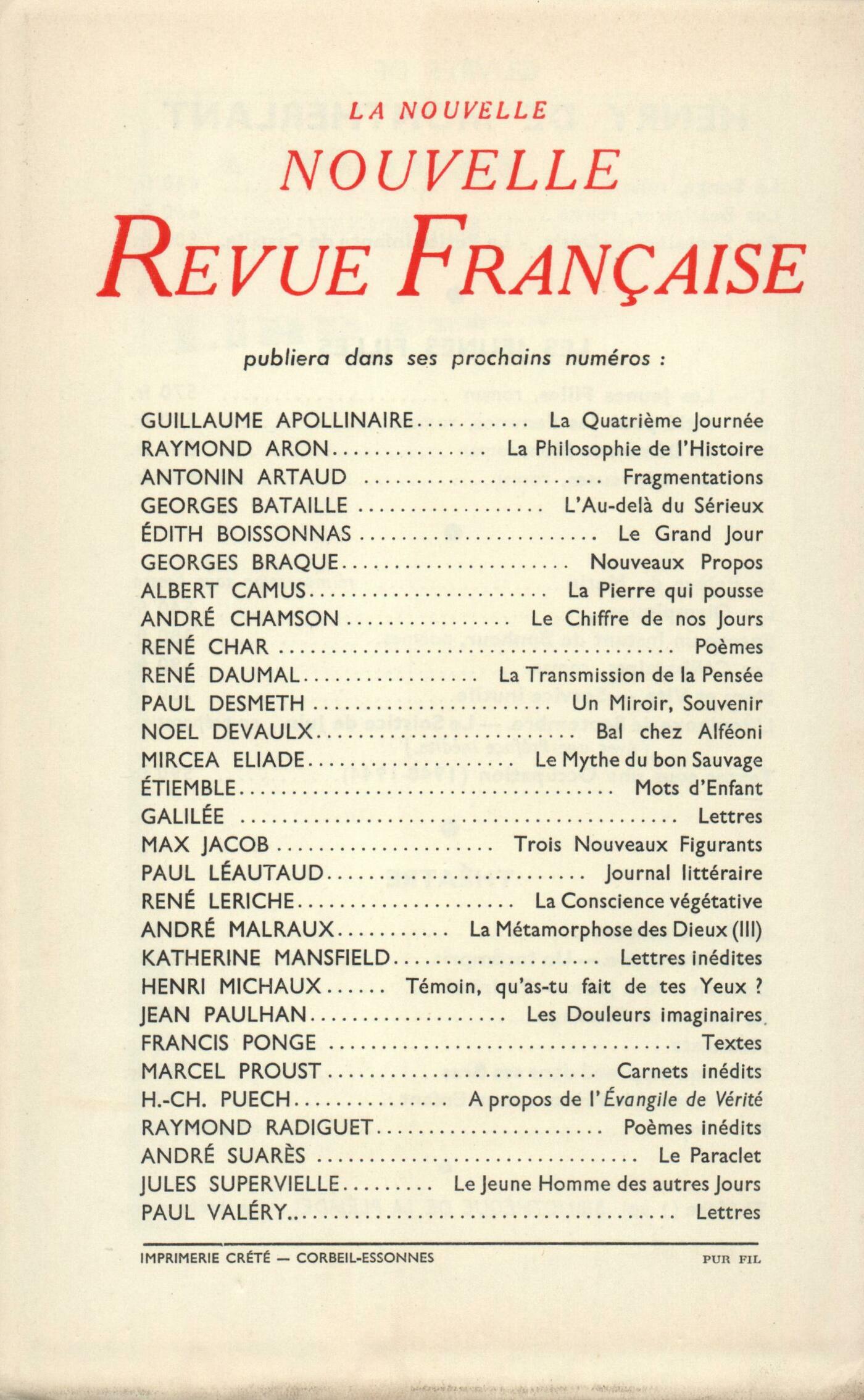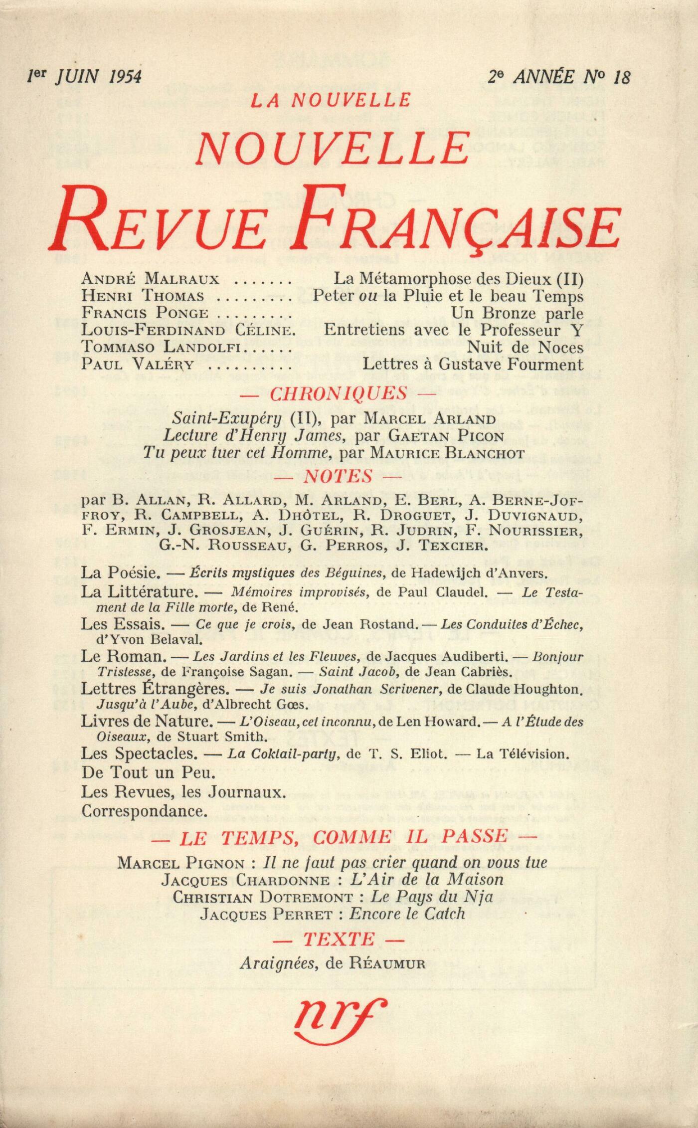 André Malraux, La Métamorphose des Dieux (II)Henri Thomas, Peter ou La pluie et le beau tempsFrancis Ponge, Un Bronze parleLouis-Ferdinand Céline, Entretiens avec le Professeur YTommaso Landolfi, Nuit de NocesPaul Valéry, Lettres ŕ Gustave FourmentChroniques : recherches : Maurice Blanchot, Tu peux tuer cet homme (III)Chroniques : la littérature : Marcel Arland, Saint-Exupéry (II)Gaëtan Picon, Lecture d'Henry JamesNotes : la poésie : Jean Grosjean, Écrits mystiques des Béguines, par Hadewijch d'Anvers (Éditions du Seuil)Notes : la littérature : Georges Perros, Mémoires improvisés, par Paul Claudel (Gallimard)Robert Droguet, Le Testament de la Fille morte, par René (Gallimard)Notes : les essais : Roger Allard, Ce que je crois, par Jean Rostand (Grasset)Robert Campbell, Les conduites d'échec, par Yvon Belaval (Gallimard)Notes : le roman : Jean Duvignaud, Les Jardins et les Fleuves, par Jacques Audiberti (Gallimard)Marcel Arland, Bonjour tristesse, par Françoise Sagan (Julliard) - Saint Jacob, par Jean Cabričs (Plon)Notes : lettres étrangčres : Roger Judrin, Je suis Jonathan Scrivener, par Claude Houghton (Corręa)Guy-Noël Rousseau, Jusqu'ŕ l'aube, par Albrecht Gs (Albin Michel)Notes : les livres de nature : André Dhôtel, L'oiseau, cet inconnu, par Len Howard (Hachette) - Ŕ l'étude des oiseaux, par Stuart Smith (Stock)Notes : les spectacles : Blaise Allan, La Cocktail-party, de T. S. Eliot (Vieux-Colombier)Emmanuel Berl, La télévisionDe tout un peu : Jean Guérin, Examen de conscience des Français, par Jules Romains (Flammarion) - Le drame d'Albert Einstein, par Antonina Vallentin (Plon) - Hécate et ses Chiens, par Paul Morand (Flammarion)France Ermin, L'Huissier et le Sergent, par Danielle Roland (Julliard)Jean Duvignaud, Vętir ceux qui sont nus Bellavita, de Luigi Pirandello (Petit-Marigny) - Un nommé Judas, de Claude-André Puget et Pierre Bost (Comédie-Caumartin) - Hamlet de Tarascon, de Jean Canolle (Théâtre La Bruyčre)François Nourissier, Roman Holiday, de William Wyler - Il Capotto, d'Alberto Lattuada - The Wild One, de Lazlo BenedeckMarcel Arland, Le Paris de ChagallAndré Berne-Joffroy, Tal-Coat (Galerie Maeght)Jean Guérin, Schwitters (Galerie Beggruen)Les revues, les journaux : Jorge Luis Borges, Page pour se souvenir du colonel Suarez, vainqueur ŕ JuninFrançois Mauriac, Le poids de la liberté Anonymes, DiversCorrespondance : André Masson, Une lettreLe temps, comme il passe : Jacques Chardonne, L'Air de la MaisonMarcel-Étienne Pignon, Il ne faut pas crier quand on vous tueJacques Perret, Encore le catchChristian Dotremont, Le Pays du NjaTextes : Réaumur, Trois textes inédits