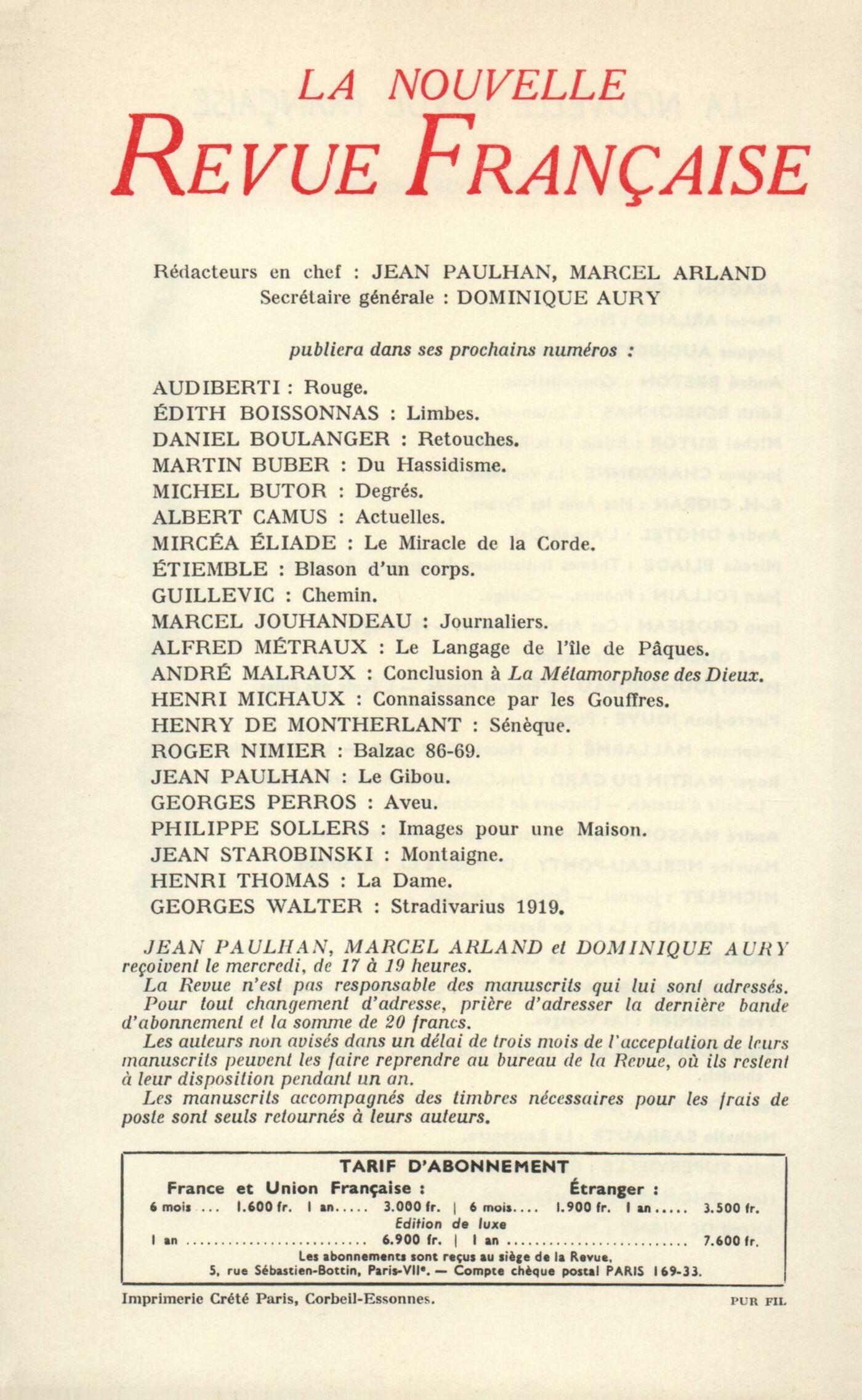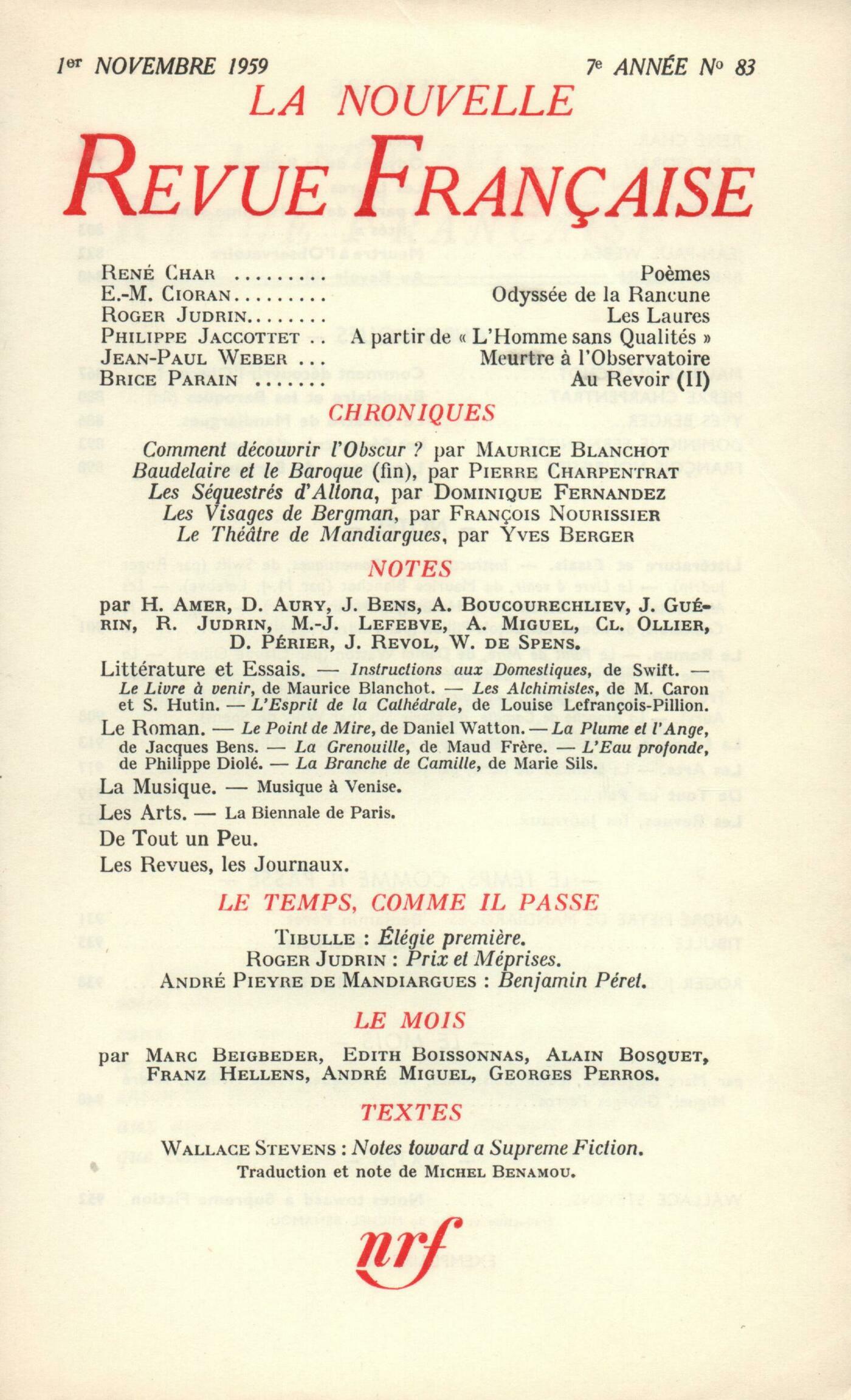 René Char, Počmes Cioran, Odyssée de la RancuneRoger Judrin, Les LauresPhilippe Jaccottet, Ŕ partir de L'Homme sans qualitésJean-Paul Weber, Meurtre ŕ l'ObservatoireBrice Parain, Au revoir (II)Chroniques : recherches : François Blanchot, Comment découvrir l'Obscur?Chroniques : Pierre Charpentrat, Baudelaire et le baroque (Fin)Yves Berger, Le Théâtre d'André Pieyre de MandiarguesChroniques : le théâtre : Dominique Fernandez, Les Séquestrés d'AltonaChroniques : le cinéma : François Nourissier, Les Visages d'Ingmar BergmanNotes : littérature et essais : Roger Judrin, Instructions aux domestiques, par Jonathan Swift (Le Livre de Poche)Maurice-Jean Lefebve, Le Livre ŕ venir, par Maurice Blanchot (Gallimard)Henry Amer, Les Alchimistes, par M. Caron et S. Hutin (Le Seuil)André Miguel, L'Esprit de la Cathédrale, par Louise Lefrançois-Pillion (Plon)Claude Ollier, Le Point de mire, par Daniel Watton (Julliard)Notes : le roman : Roger Judrin, La Plume et l'Ange, par Jacques Bens (Gallimard)Willy de Spens, La Grenouille, par Maud Frčre (Gallimard)Dominique Aury, L'Eau profonde, par Philippe DioléWilly de Spens, La Branche de Camille, par Marie Sils (Gallimard)Notes : la musique : André Boucourechliev, Le XXIIe Festival de musique de VeniseNotes : les arts : Jean Revol, Premičre Biennale de Paris (Musée d'Art moderne)De tout un peu : Jean Guérin, uvre poétique, de Vincent Muselli (Point et Contrepoints)Dominique Aury, Acteur et témoin, par Henri Calet (Mercure de France)Jacques Bens, La Voyageuse, par Gisčle Prassinos (Plon) - Les Enfants des collines, par Pierre-Adrien Ekman (Gallimard) - La Grande Idée, par Jacques Perry (Julliard)Georges Perros, Le Dieu des Mouches, par Frédérick Tristan (Grasset)Dominique Aury, J'irai aimer ailleurs, par Agnčs Nanquette (Gallimard)Jean Guérin, Journal intime, de Paul Klee (Grasset)Les revues, les journaux : Jean Guérin, Raymond Bayer De la peinture moderne Témoignages en tous sens La peinture moderne (suite) Anonymes, DiversLe temps, comme il passe : André Pieyre de Mandiargues, Benjamin Péret Tibulle, Élégie premičreRoger Judrin, Prix et méprisesLe mois : Édith Boissonnas, Autres vacancesMarc Beigbeder, La vraie couleur des blousons noirsFranz Hellens, La BracéliteGeorges Perros, Plaisirs d'amourAndré Miguel, Alpilles (I)Alain Bosquet, Instantanés américains (II)Textes : Wallace Stevens, Notes Toward A Supreme Fiction