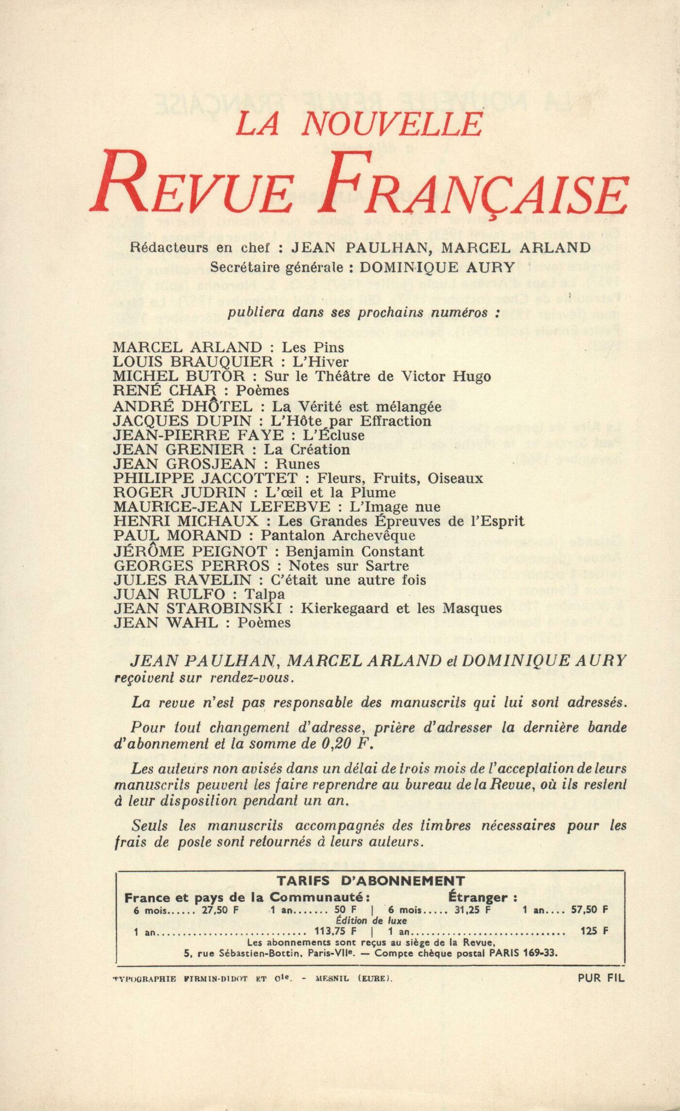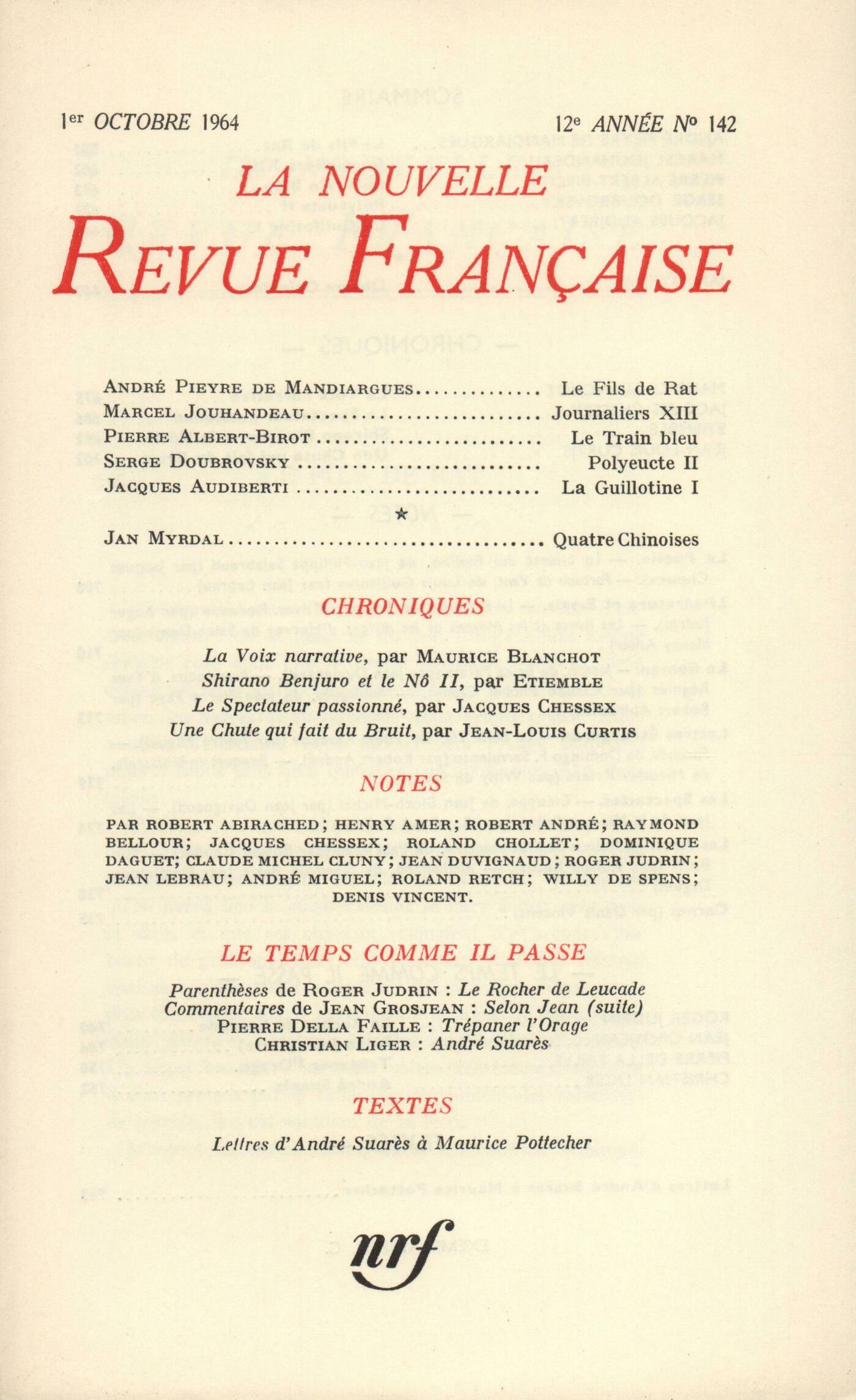 André Pieyre de Mandiargues, Le Fils de ratMarcel Jouhandeau, JournaliersPierre Albert-Birot, Le Train bleuSerge Doubrovsky, Polyeucte ou La conquęte de Dieu (Fin)Jacques Audiberti, La GuillotineJan Myrdal, Quatre ChinoisesChroniques : Maurice Blanchot, La Voix narrativeJacques Chessex, Le spectateur passionné Étiemble, Shirano Benjuro et le Nô (Fin)Jean-Louis Curtis, Une chute qui fait du bruitNotes : la poésie : Jacques Chessex, La liberté des feuilles, par Jean-Philippe Salabreuil (Gallimard)Jean Lebrau, Fortune de vent, par Louis Guillaume (José Corti)Notes : littérature et essais : Roger Judrin, Le Président de Brosses, par Yves Florenne (Mercure de France)Henry Amer, Les ręves et les moyens de les diriger, par Hervey de Saint-Denys (Cercle du Livre précieux)Notes : le roman : Jean Duvignaud, Joseph, par Brice Parain (Gallimard)Claude Michel Cluny, Promenoirs, par Yves Régnier (Grasset)Robert Abirached, Analogues, par Jean Pierre Faye (Le Seuil) - Théâtre, de Jean Pierre Faye (Le Seuil)Notes : lettres étrangčres : André Miguel, La Belle Vie, par Iouri Kazakov (Gallimard)Robert André, Facundo, par Domingo F. Sarmiento (La Table Ronde)Willy de Spens, Banquet en Blithuanie, par Miroslav Krleza (Calmann-Lévy)Notes : les spectacles : Jean Duvignaud, Ctésippe, par Jean Bloch-Michel (Gallimard)Raymond Bellour, Les jeux de la mise en scčneNotes : les arts : Roland Chollet, Théorie de l'art moderne, par Paul Klee (Gonthier)Roland Recht, Sur BurriDominique Daguet, Aleijadinho, par Germain Bazin (Éditions du Temps)Carnet : Denis Vincent, Appareil de la Terre, par Jean Follain (Gallimard) - Le XIXe sičcle, choix de textes de Barbey d'Aurevilly (Mercure de France) - Passe-temps, II, par Paul Léautaud (Mercure de France) - Histoire de Georges Guersant, par Jean Hougron (Stock) - Adieu trophées, par Christian Guillet (Flammarion) - L'autre côté, par Alfred Kubin (J.-J. Pauvert) - Rouault (Musée du Louvre) (Suite)Le temps comme il passe. Parenthčses : Roger Judrin, Le rocher de LeucadeLe temps comme il passe : Jean Grosjean, Commentaires selon Jean (Fin)Pierre Della Faille, Trépaner l'orageChristian Liger, André SuarčsTextes : André Suarčs, Lettres ŕ Maurice Pottecher