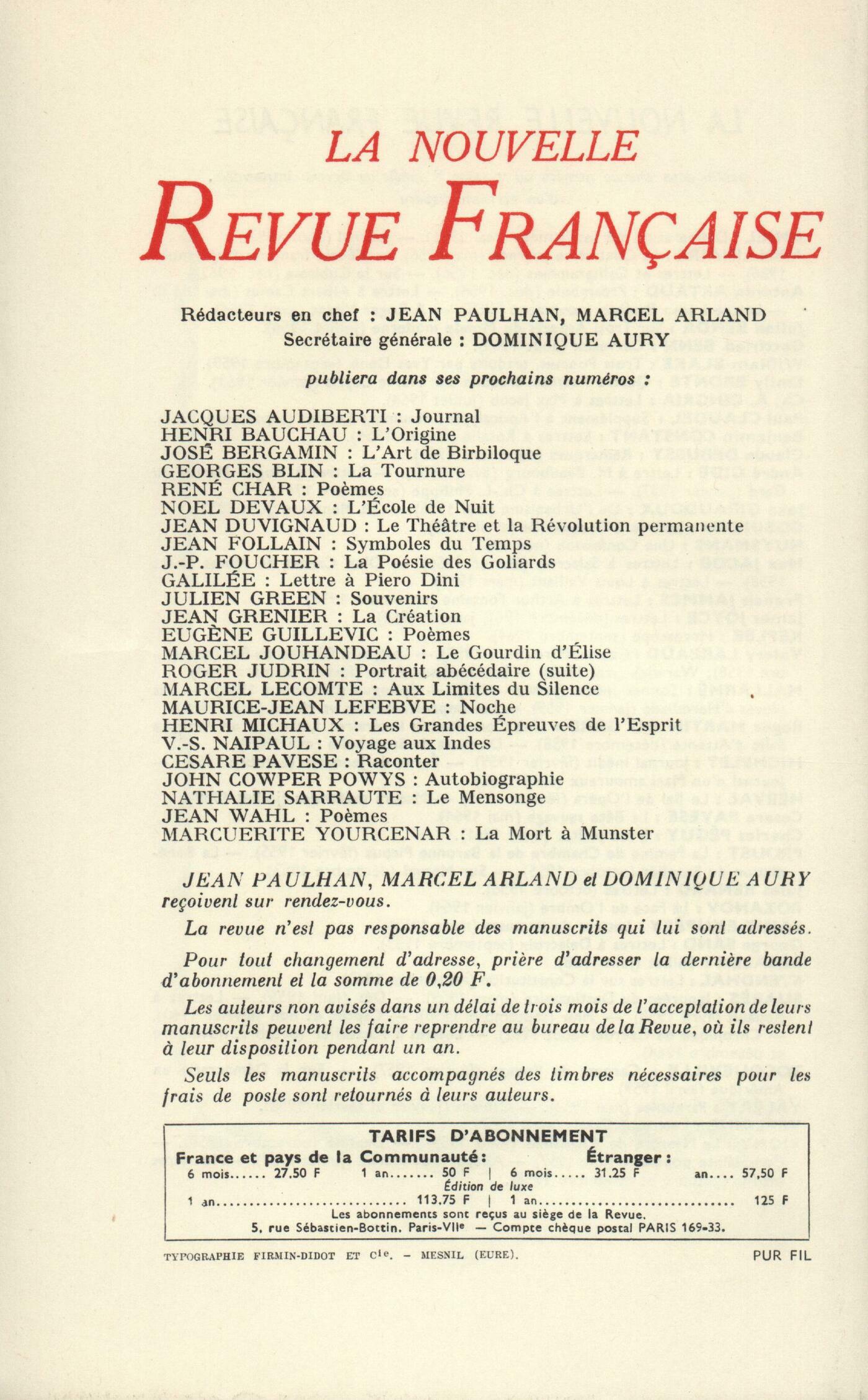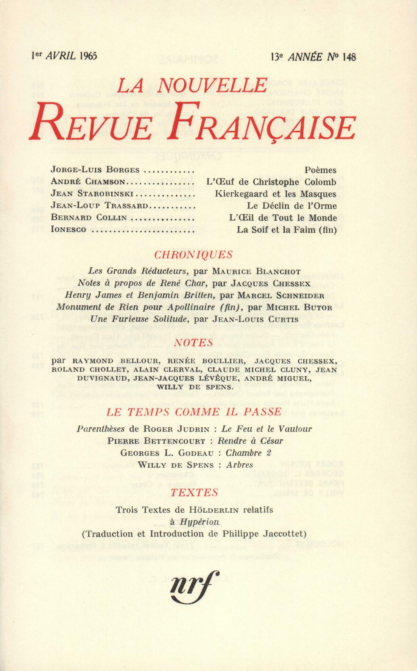 Jorge Luis Borges, PočmesAndré Chamson, L'uf de Christophe ColombJean Starobinski, Kierkegaard et les masquesJean-Loup Trassard, Le Déclin de l'ormeBernard Collin, L'il de tout le mondeEugčne Ionesco, La Soif et la Faim (Fin)Chroniques : Maurice Blanchot, Les Grands RéducteursJacques Chessex, Notes ŕ propos de René CharMichel Butor, Monument de rien pour Apollinaire (Fin)Jean-Louis Curtis, Une furieuse solitudeMarcel Schneider, Henry James et Benjamin BrittenNotes : littérature et essais : Alain Clerval, Pour un Malherbe, par Francis Ponge (Gallimard)Claude Michel Cluny, Waterloo, par Robert Margerit (Gallimard)André Miguel, Tolstoď, par Henri Troyat (Fayard)Notes : le roman : Jean Duvignaud, Rapport sur Bruno, par Joseph Breitbach (Gallimard)Claude Michel Cluny, Le pingouin aux olives, par Yann Gaillard (Julliard)Notes : lettres étrangčres : Alain Clerval, Journal de guerre et d'occupation, d'Ernst Jünger (Julliard) - Quatre surs, par Junichiro Tanizaki (Gallimard)André Miguel, La Tęte, par Ernst Augustin (Gallimard)Claude Michel Cluny, Les pauvres sont fous, par Cesare Zavattini (Julliard)Notes : les spectacles : Raymond Bellour, Oberhausen, 1965Notes : les arts : Renée Bouillier, Les trésors des églises de France - ŤLe mouvementť - Henri Michaux, cinéasteRoland Chollet, Picasso dans l'il d'un photographeJean-Jacques Lévęque, Tal Coat (Galerie Beno d'Incelli)Jacques Chessex, Anne-Marie Haesler-Jaccottet (Galerie Bridel)Lectures : Willy de Spens, Sécheresse, par Graciliano Ramos (Gallimard) - Le Passé nu, par Ernst Erich Noth (Plon) - Pizarre et ses frčres, par Siegfried Huber (Plon) - Les derniers rapaces, par Simonne Jacquemard (Stock) - Choix de Poésies, de Jean Richepin (Fasquelle)Le temps comme il passe. Parenthčses : Roger Judrin, Le feu et le vautourLe temps comme il passe : Georges-L. Godeau, Chambre 2Pierre Bettencourt, Rendre ŕ CésarWilly de Spens, ArbresTextes : Friedrich Hölderlin, Trois textes relatifs ŕ Hypérion
