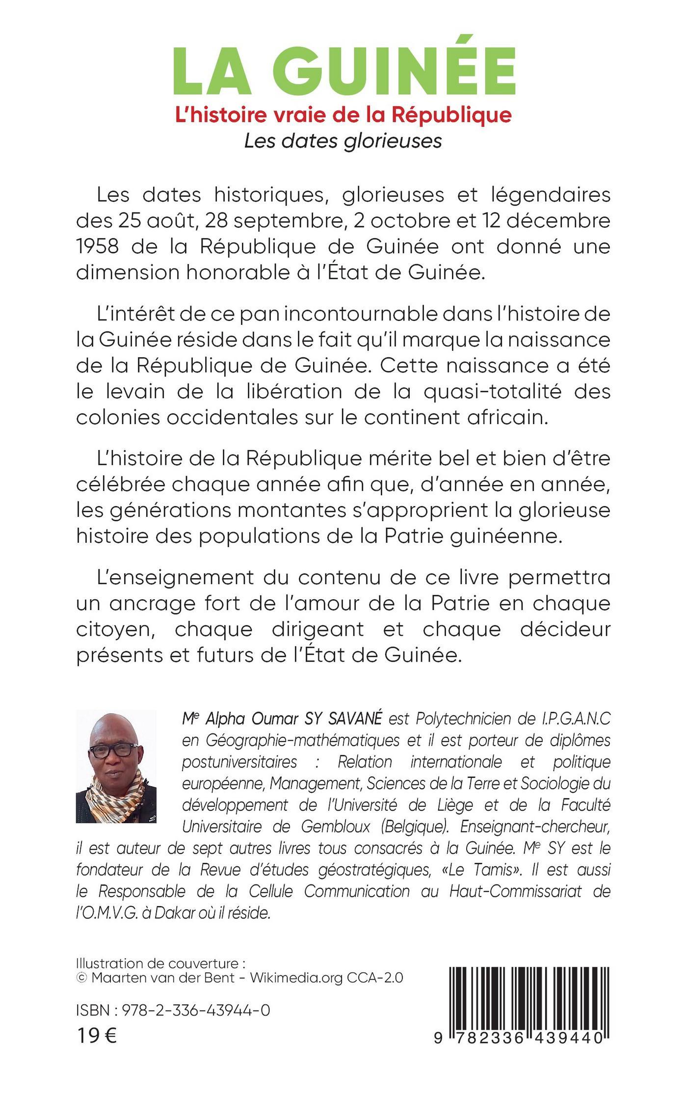 Les dates historiques, glorieuses et légendaires des 25 août, 28 septembre, 2 octobre et 12 décembre 1958 de la République de Guinée ont donné une dimension honorable à l’État de Guinée. L’intérêt de ce pan incontournable dans l’histoire de la Guinée réside dans le fait qu’il marque la naissance de la République de Guinée. Cette naissance a été le levain de la libération de la quasi-totalité des colonies occidentales sur le continent africain. L’histoire de la République mérite bel et bien d’être célébrée chaque année afin que, d’année en année, les générations montantes s’approprient la glorieuse histoire des populations de la Patrie guinéenne. L’enseignement du contenu de ce livre permettra un ancrage fort de l’amour de la Patrie en chaque citoyen, chaque dirigeant et chaque décideur présents et futurs de l’État de Guinée.