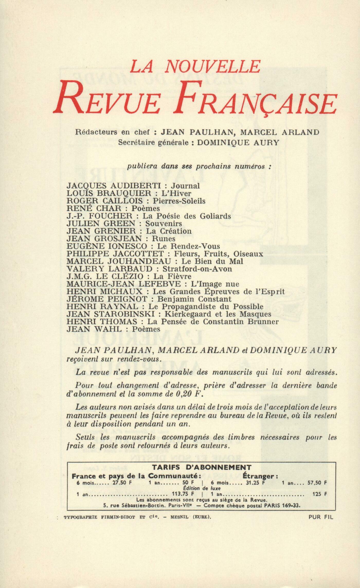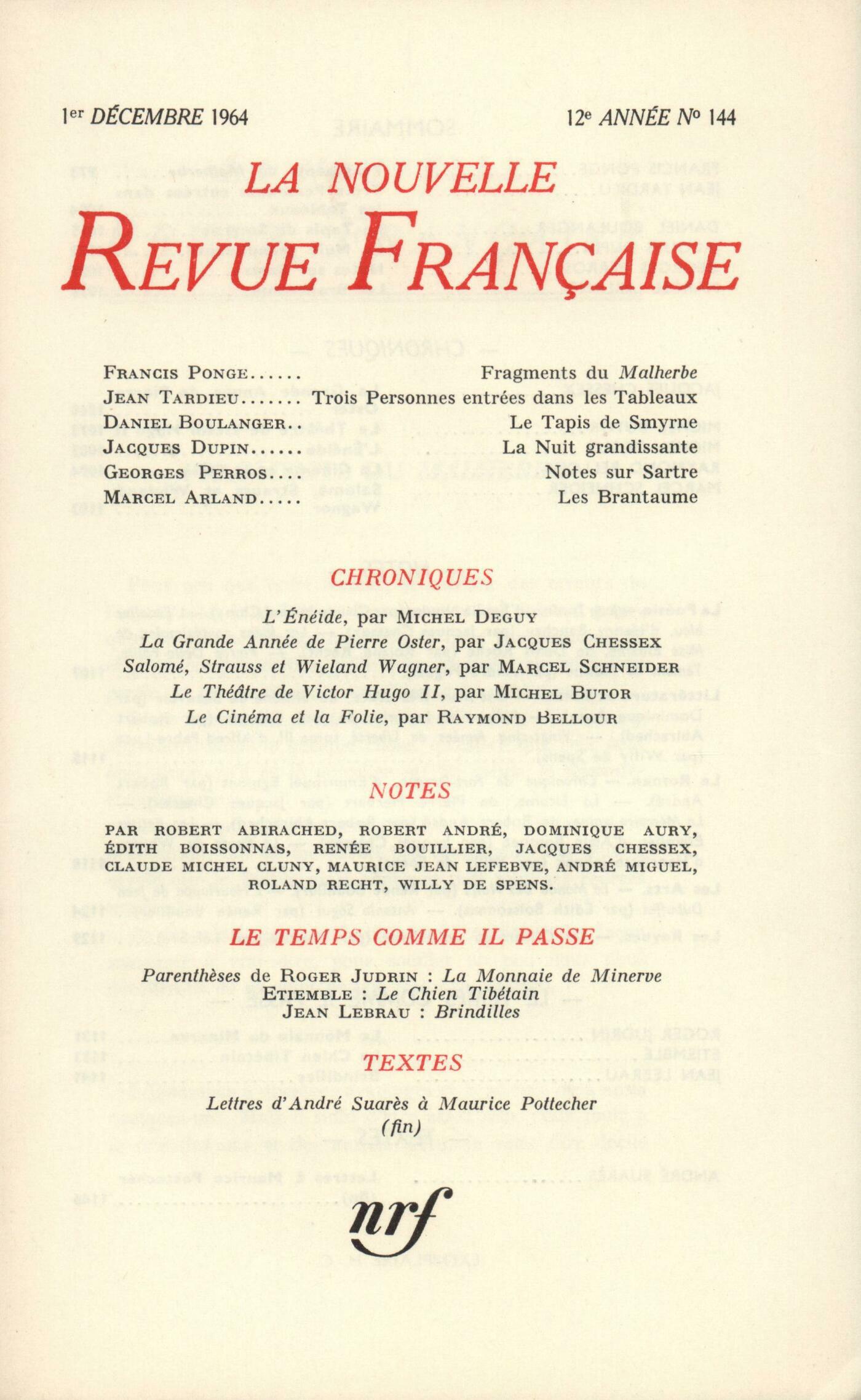 Philippe Sollers, Fragments du MalherbeJean Tardieu, Trois personnes entrées dans les tableauxDaniel Boulanger, Le tapis de SmyrneJacques Dupin, La Nuit grandissanteGeorges Perros, Notes sur SartreMarcel Arland, Les BrantaumeChroniques : Jacques Chessex, La Grande Année ou Quelques remarques sur Pierre OsterMichel Butor, Le théâtre de Victor Hugo (II)Michel Deguy, L'ÉnéideRaymond Bellour, Le cinéma et la folieMarcel Schneider, Salomé, Strauss et Wieland WagnerNotes : la poésie : Claude Michel Cluny, Jean Tardieu, par Émilie Noulet (Seghers)Jacques Chessex, L'Escalier bleu, par Henry Bauchau (Gallimard)Roland Recht, Les Idées centésimales de Miss Elanize, par Denis Roche (Le Seuil)André Miguel, Pierre Della Faille, témoin de SodomeNotes : littérature et essais : Dominique Aury, Une mort trčs douce, par Simone de Beauvoir (Gallimard)Robert Abirached, Plaisirs et lectures, par José Cabanis (Gallimard) - Les Jeux de la nuit, par José Cabanis (Gallimard)Notes : le roman : Willy de Spens, Vingt-cinq années de liberté, III, par Alfred Fabre-Luce (Julliard)Robert André, Chronique de Fort-Dragon, par Emmanuel Egmont (Gallimard)Jacques Chessex, La Licorne, par Pierre Herbart (Gallimard)Robert Abirached, La Mémoire vaine, par Robert André (Grasset)Jacques Chessex, Les Petites Éternités, par Alain Bosquet (Grasset)Willy de Spens, La Route du whisky, par Henriette Jelinek (Gallimard)Notes : les arts : Renée Bouillier, Le monde des NaďfsÉdith Boissonnas, L'Hourloupe de Jean DubuffetRenée Bouillier, Antonio Ségui (Galeries Jeanne Bucher et Claude Bernard)Les revues : Maurice-Jean Lefebve, Les Cahiers de symbolismeLe temps comme il passe. Parenthčses : Roger Judrin, La monnaie de MinerveLe temps comme il passe : Étiemble, Le chien tibétainJean Lebrau, BrindillesTextes : André Suarčs, Lettres ŕ Maurice Pottecher (Fin)