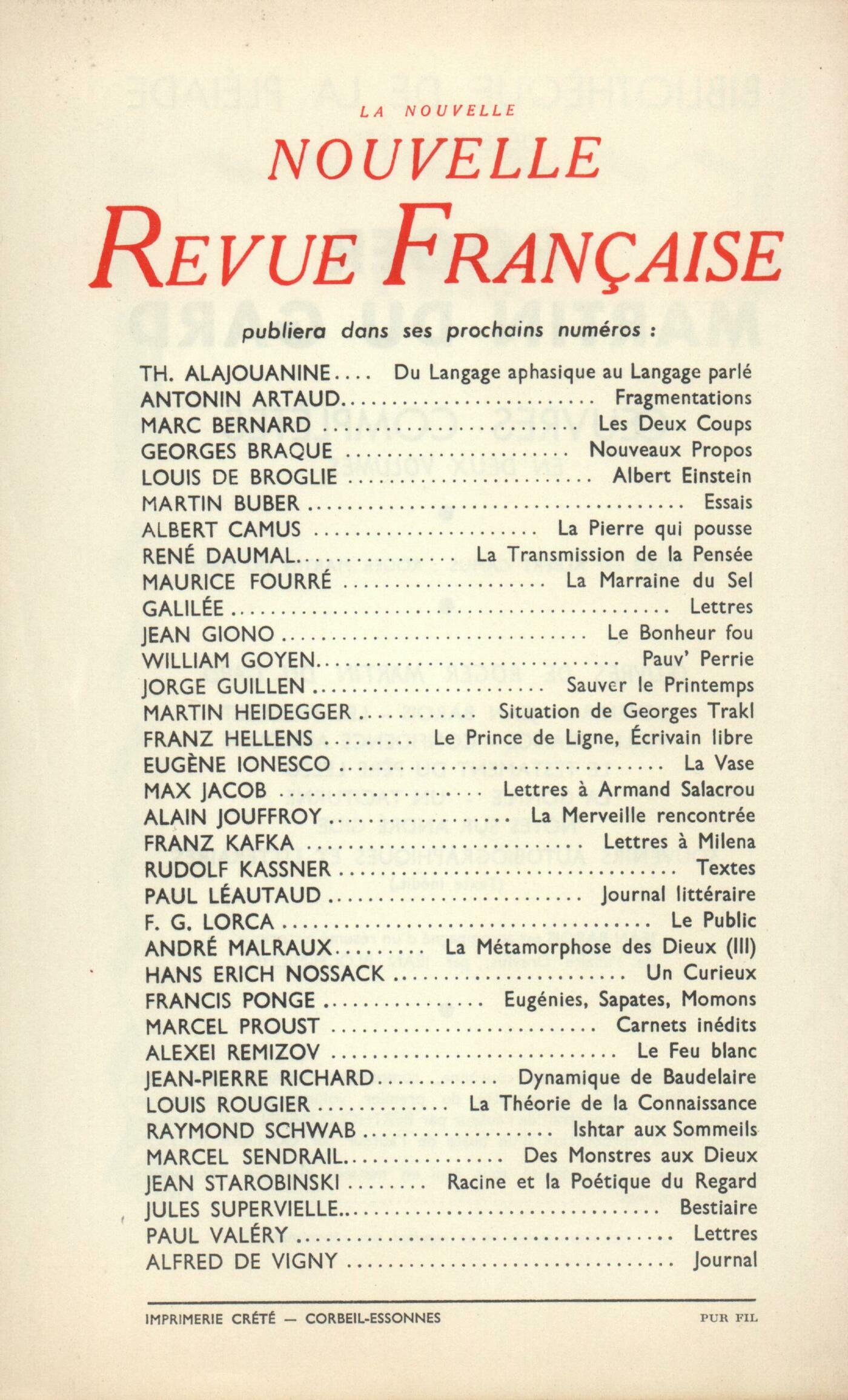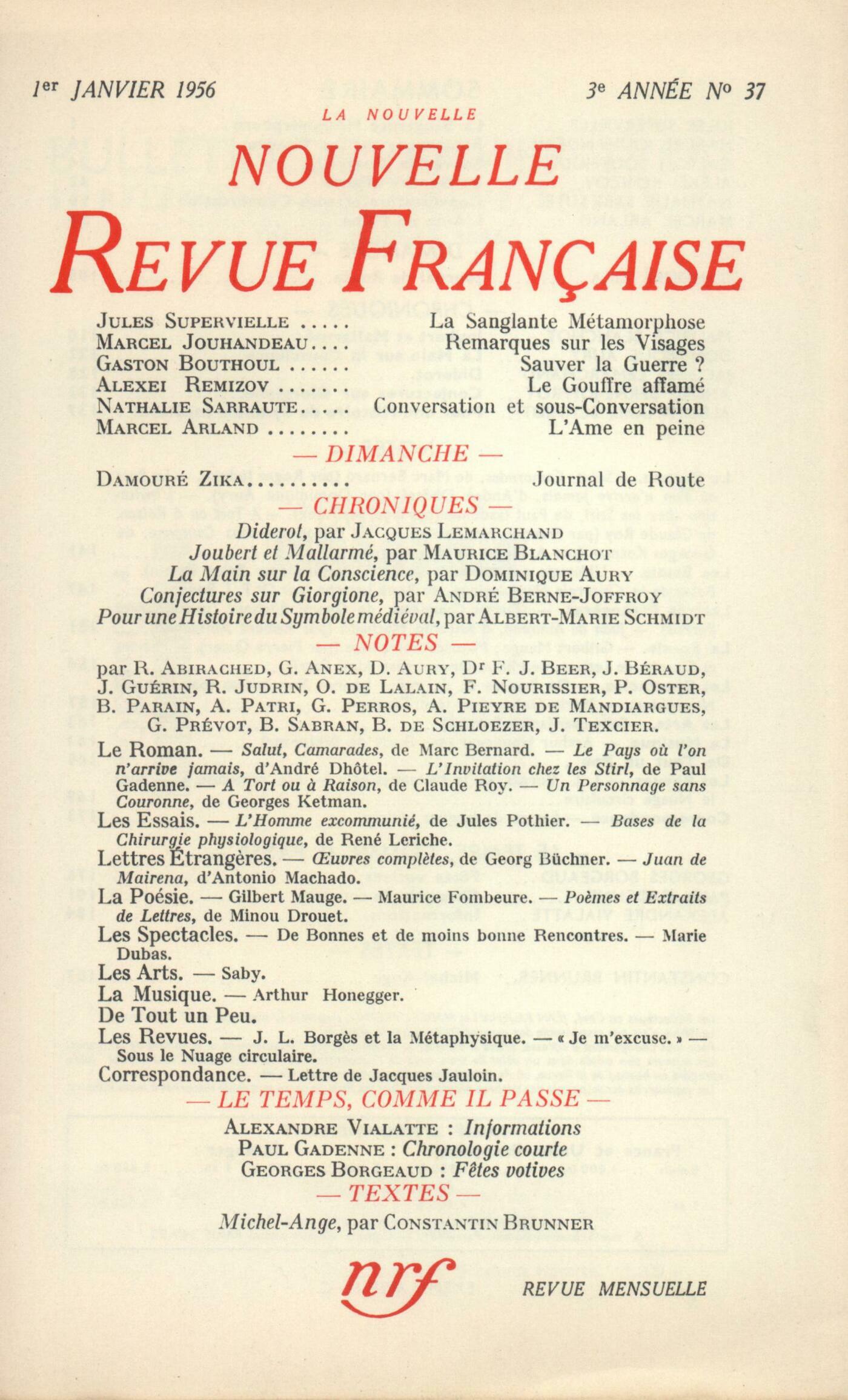 Jules Supervielle, La Sanglante MétamorphoseMarcel Jouhandeau, Remarques sur les visagesGaston Bouthoul, Sauver la Guerre?Alexeď Remizov, Le Gouffre affaméNathalie Sarraute, Conversation et sous-conversationMarcel Arland, L'Âme en peineDimanche : Damouré Zika, Journal de route (I)Chroniques : recherches : Maurice Blanchot, Joubert et MallarméChroniques : les romans : Dominique Aury, La main sur la conscienceChroniques : Jacques Lemarchand, DiderotAndré Berne-Joffroy, Conjectures sur GiorgioneChroniques : l'érudition : Albert-Marie Schmidt, Pour une histoire du Symbole médiévalNotes : le roman : Roger Judrin, Salut, camarades, par Marc Bernard (Gallimard)Dominique Aury, Le Pays oů l'on n'arrive jamais, par André Dhôtel (Pierre Horay)Georges Anex, L'Invitation chez les Stirl, par Paul Gadenne (Gallimard)François Nourissier, Ŕ tort ou ŕ raison, par Claude Roy (Gallimard)André Pieyre de Mandiargues, Un Personnage sans couronne, par Georges Ketman (Plon)Notes : les essais : Brice Parain, L'Homme excommunié, par Jules Pothier (Éditions de Minuit)François-Joachim Beer, Bases de la chirurgie physiologique, par René Leriche (Masson)Notes : lettres étrangčres : Georges Perros, uvres complčtes, de George Büchner (Club Français du Livre)Robert Abirached, Juan de Mairena, par Antonio Machado (Gallimard)Notes : la poésie : Pierre Oster, Un art de dire : Gilbert Mauge Maurice FombeureAimé Patri, Počmes et extraits de lettres, par Minou Drouet (Julliard)Notes : les spectacles : François Nourissier, De bonnes et de moins bonnes rencontresJean Texcier, Marie DubasNotes : les arts : Janine Béraud, Saby (Galerie du Dragon)Notes : la musique : Boris de Schlzer, Arthur HoneggerDe tout un peu : Gérard Prévot, Mallarmé vivant, par Robert Goffin (Nizet)Pierre Oster, Cahiers de Rochefort (Huitičme série)Odile de Lalain, Amčre Victoire, par René Hardy (Laffont) - Dieu est en retard, par Christine Arnothy (Gallimard) - Les Mains ouvertes, par Simone Barbier (Gallimard) - Les Fétiches, par Gérard Boutelleau (Julliard) - La Femme seule, par Pierre Audinet (Éditions de Minuit) - L'Office des Ténčbres, par Luc Bérimont (Grasset)Marcel Arland, Le Théâtre-prétexteBéatrice Sabran, La Lettre perdue, de Caragiale (Théâtre de poche) - Marie Tudor, de Victor Hugo (T. N. P.)Les revues : Jorge Luis Borges - Jean Guérin, J. L. Borges et la métaphysiquePaul Léautaud - Jean Guérin, Je m'excuseHenri Michaux, Sous le nuage circulaire Anonymes, DiversCorrespondance : Jacques Jauloin, Réponse ŕ Jean GuérinLe temps, comme il passe : Georges Borgeaud, Fętes votivesPaul Gadenne, Chronologie courteAlexandre Vialatte, InformationsTextes : Constantin Brunner, Michel-Ange