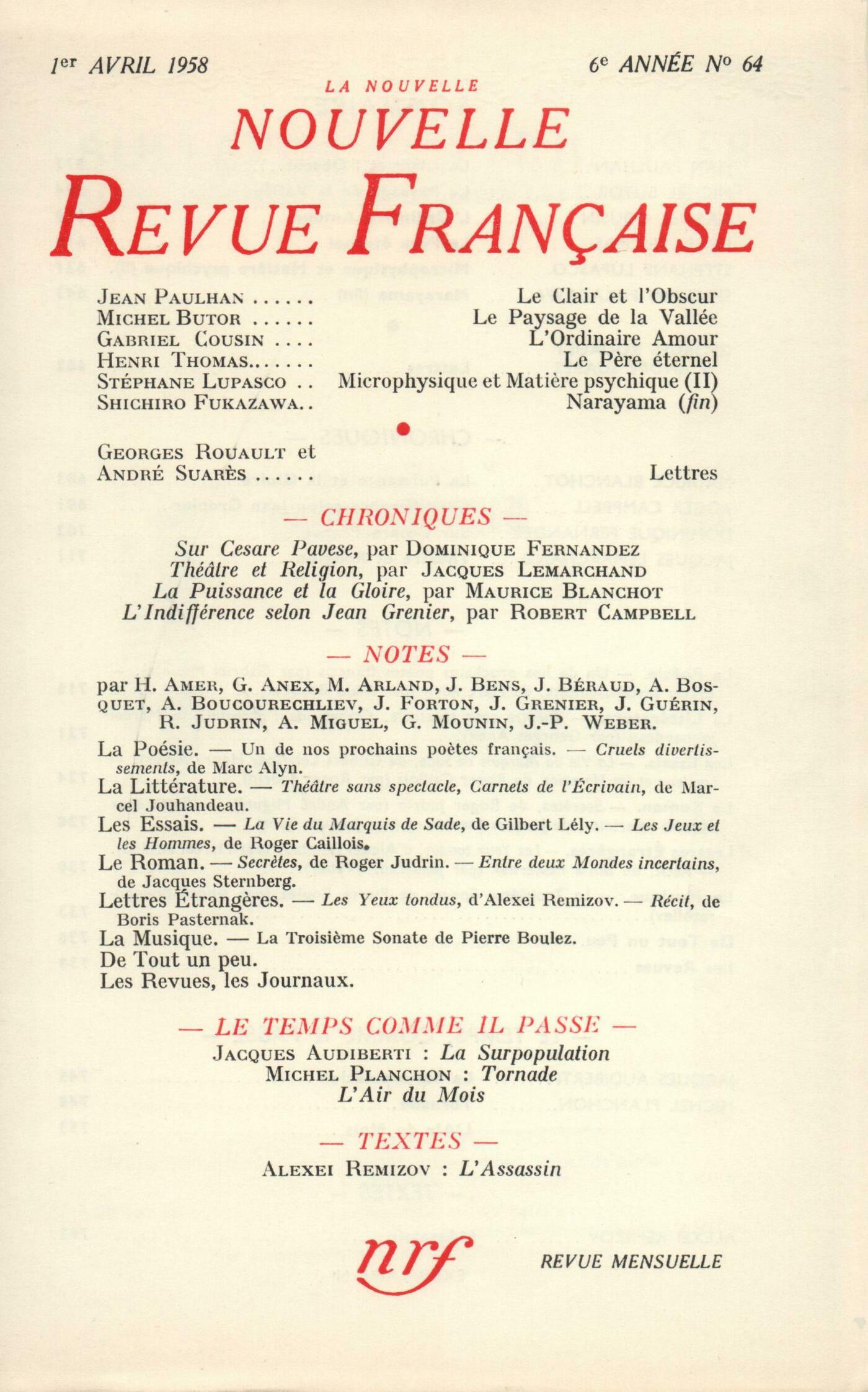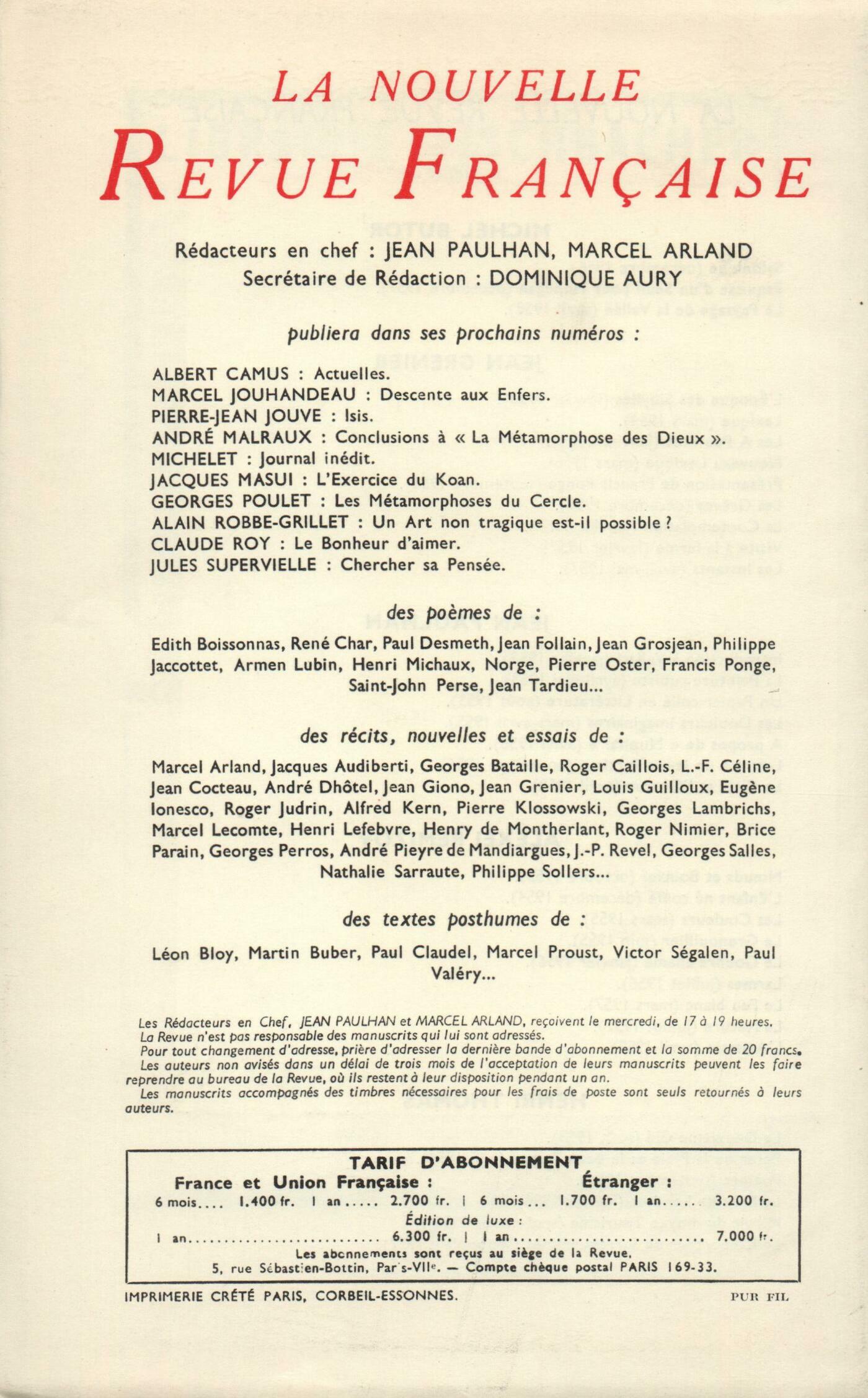 Jean Paulhan, Le Clair et l'ObscurMichel Butor, Le Paysage de la ValléeGabriel Cousin, L'Ordinaire AmourHenri Thomas, Le Pčre éternel Lupasco, Microphysique et matičre psychique (II) Fukazawa Shichirô, Narayama (fin)Georges Rouault - André Suarčs, LettresChroniques : recherches : Maurice Blanchot, La Puissance et la GloireChroniques : Robert Campbell, L'Indifférence selon Jean GrenierDominique Fernandez, Sur Cesare PaveseChroniques : le théâtre : Jacques Lemarchand, Théâtre et religionsNotes : la poésie : Georges Mounin, Un de nos prochains počtes françaisAlain Bosquet, Cruels divertissements, par Marc Alyn (Pierre Seghers)Notes : la littérature : Georges Anex, Théâtre sans spectacle, par Marcel Jouhandeau (Grasset) - Carnets de l'écrivain, par Marcel Jouhandeau (Gallimard)Notes : les essais : Henry Amer, Vie du Marquis de Sade, II, par Gilbert Lély (Gallimard)Roger Judrin, Les Jeux et les Hommes, par Roger Caillois (Gallimard)Notes : le roman : André Miguel, Secrčtes, par Roger Judrin (Gallimard)Jacques Bens, Entre deux mondes incertains, par Jacques Sternberg (Denoël)Notes : lettres étrangčres : Marcel Arland, Les Yeux tondus, par Alexeď Remizov (Gallimard)Jean-Paul Weber, Récit, par Boris Pasternak (Emm. Vitte)Notes : la musique : André Boucourechliev, La Troisičme Sonate de Pierre BoulezDe tout un peu : Henry Amer, Jean Pic de la Mirandole, par Pierre-Marie Cordier (Nouvelles Éditions Debresse)Jacques Bens, Entretiens avec L.-F. Céline, par Robert Poulet (Plon)Jean Grenier, Un Pas d'homme, par Marie Susini (Éditions du Seuil)Jean Forton, Retour ŕ Sorrente, par Noël Calef (Fayard)Jacques Bens, Des Saints et des Anges, par Gilles Rosset (Julliard)Jean Forton, Des hommes et des femmes, par Ivy Compton-Burnett (Gallimard)Janine Béraud, Peintures aborigčnes d'Australie (La Hune)Les revues : Jean Rostand - Jean Guitton, Style de ChardonneJean Guérin, Georges Bataille ŕ la Ciguë - DiversBernard Frank (1927-1996), Shichiro FukazawaLe temps, comme il passe : Jacques Audiberti, La Surpopulation...Michel Planchon, TornadeL'air du mois : Georges Borgeaud, Printemps fourbeJean Dutourd, NotesDenis Périer, AmitiéAbbé de Voisenon, Actualités littérairesGaston Chaissac, Lettre des champsMarcel Spada, En Turquie Calmis-Carteret, Le tableau et le regardantJean Lebrau, BrindillesMaurice Ygor, Au cabaret d'Agnčs CapriTextes : Alexeď Remizov, L'assassin