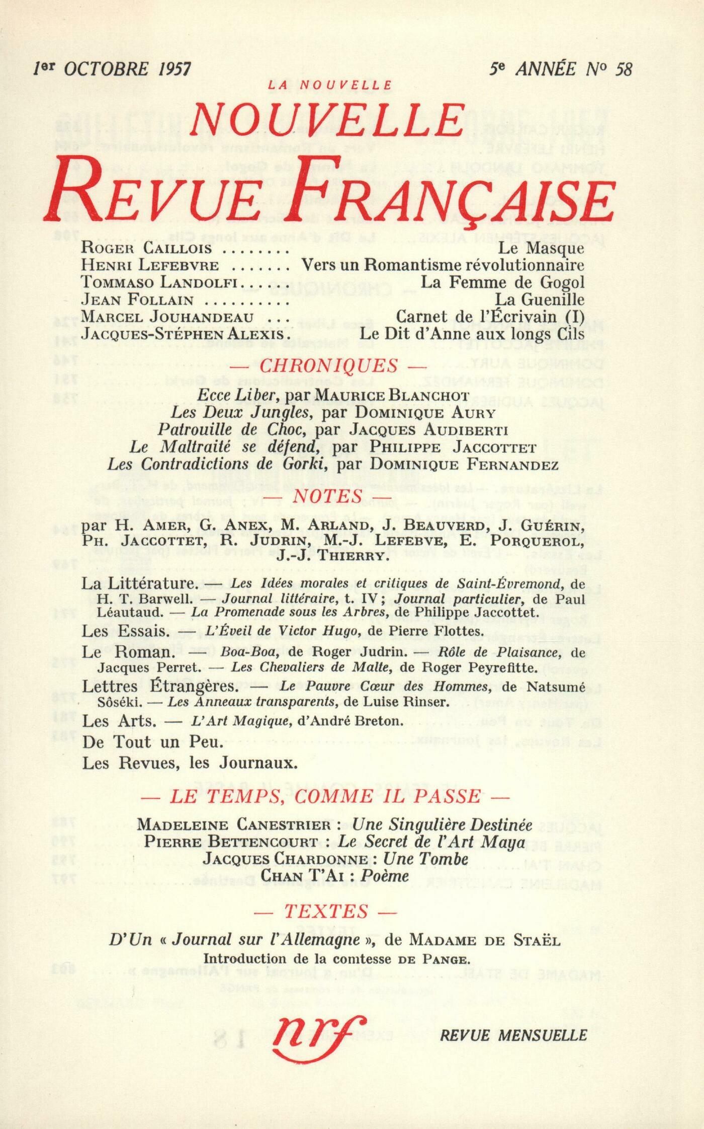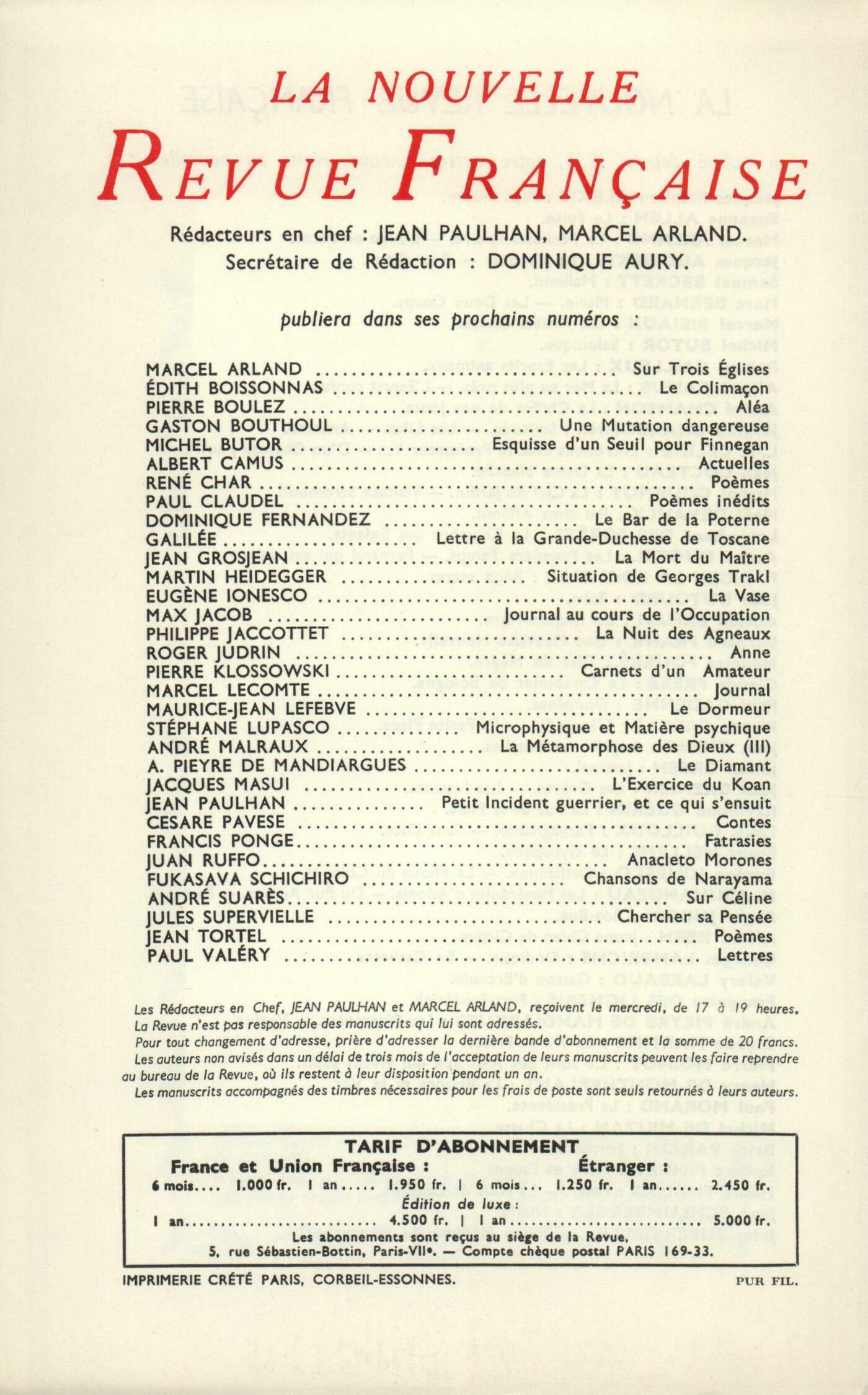 Roger Caillois, Le Masque Napoléon, Le Masque prophčteHenri Lefebvre, Vers un Romantisme révolutionnaireTommaso Landolfi, La Femme de GogolJean Follain, PočmesMarcel Jouhandeau, Carnet de l'écrivainJacques Stephen Alexis, Le Dit d'Anne aux longs CilsChroniques : recherches : Maurice Blanchot, Ecce LiberChroniques : Philippe Jaccottet, Le Maltraité se défendDominique Aury, Les Deux JunglesDominique Fernandez, Les contradictions de GorkiJacques Audiberti, Patrouille de chocNotes : la littérature : Roger Judrin, Les Idées morales et critiques de Saint-Évremond, par H. T. Barnwell (Presses Universitaires de France)Henry Amer, Journal littéraire, IV (Mercure de France ) Journal particulier, par Paul LéautaudGeorges Anex, La Promenade sous les Arbres, par Philippe Jaccottet (Mermod)Notes : les essais : Jacques Beauverd, L'éveil de Victor Hugo, par Pierre Flottes (Gallimard)Notes : le roman : Maurice-Jean Lefebve, Boa-Boa, par Roger Judrin (Gallimard)Roger Judrin, Rôle de Plaisance, par Jacques Perret (Gallimard)Jean-Jacques Thierry, Chevaliers de Malte, par Roger Peyrefitte (Flammarion)Notes : lettres étrangčres : Marcel Arland, Le Pauvre Cur des Hommes, par Natsumé Sôséki (Gallimard)Élisabeth Porquerol, Les Anneaux transparents, par Luise Rinser (Le Seuil)Notes : les arts : Henry Amer, L'Art magique, par André Breton (Club Français du Livre)De tout un peu : Philippe Jaccottet, Portulan, par Gérard Murail (Mercure de France)Jean Guérin, Dans un mois, dans un an, par Françoise Sagan (Julliard)Jean Forton, Yododo, par Armand Lanoux (Fayard) - Une fille pour l'été, par Maurice Clavel (Julliard) - Le Temps de notre vie, par Véronique Blaise (Gallimard) - La Polonaise, par Stanislas d'Otremont (Julliard) - Le Secret de Luc, par Ignazio Silone (Grasset)Les revues, les journaux : René Char - Jean Guérin, Curiosités : un počme de René Char...Jean Guérin - Paul Valéry, ... Et deux počmes de Paul ValéryGeorges Anex - Jean Guérin, En hommage ŕ Gustave Roux - Matériel truqué Anonymes, DiversLe temps, comme il passe : Jacques Chardonne, Une tombePierre Bettencourt, Le Secret de l'art maya Chan T'ai, PočmeMadeleine Canestrier, Une Singuličre DestinéeTextes : la Comtesse Jean de Pange, Madame de Staël ŕ FrancfortMadame de Staël, D'un Journal sur l'Allemagne