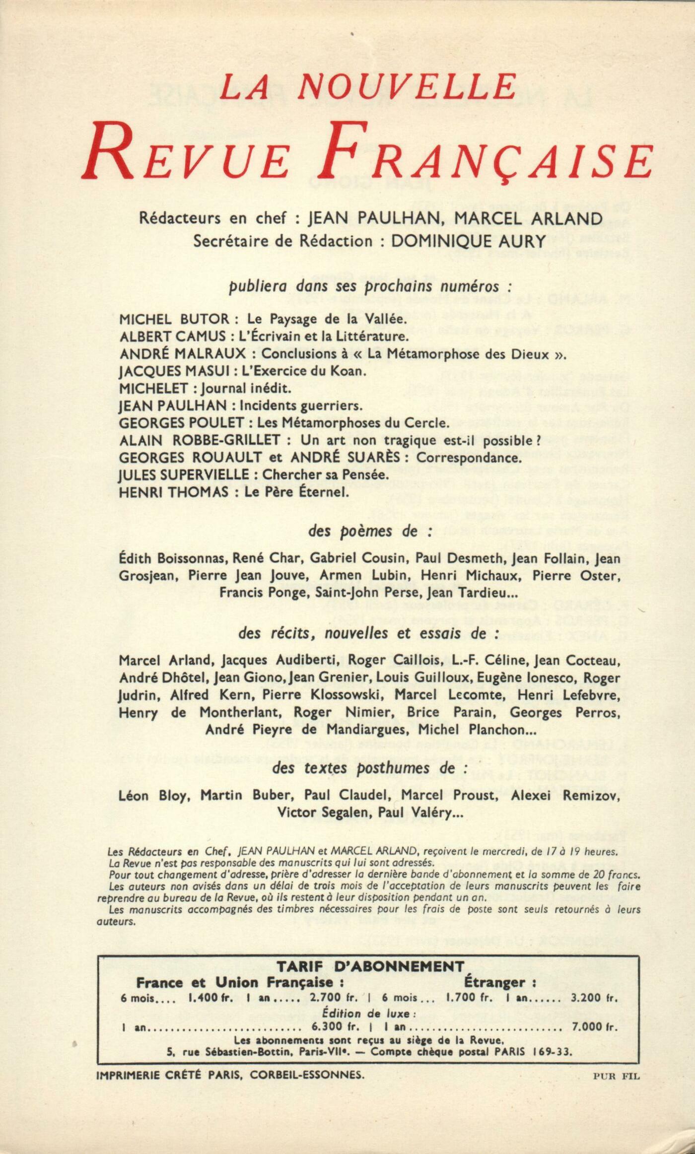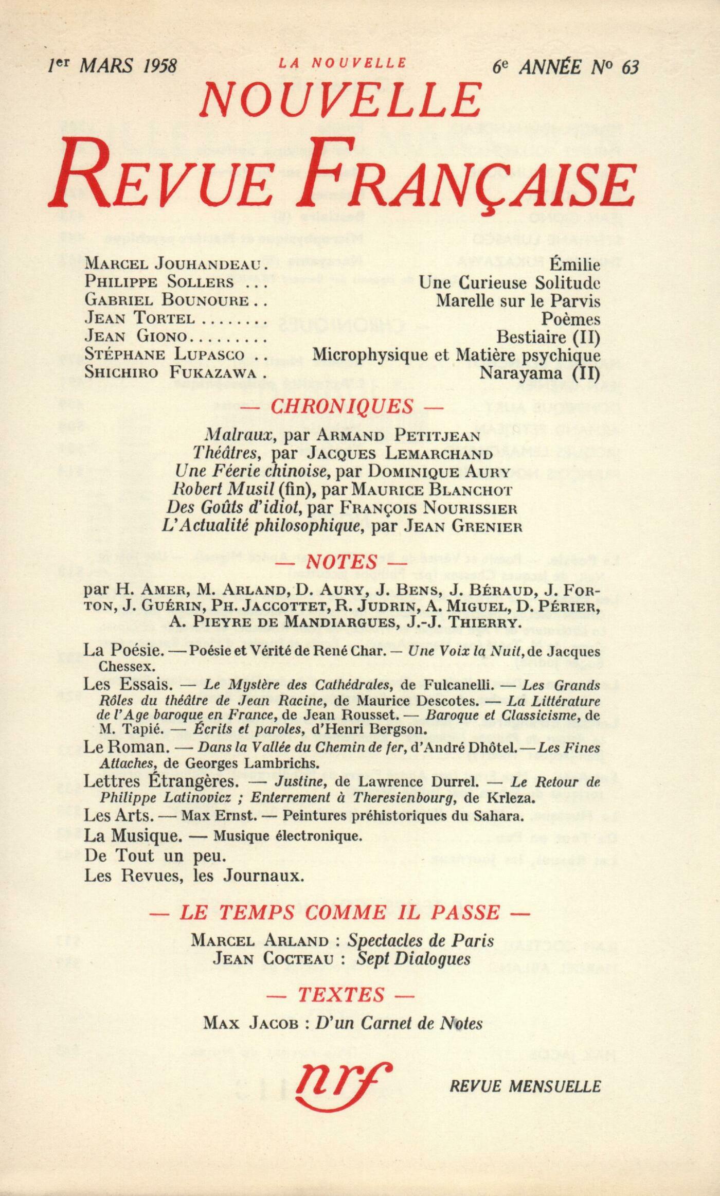 Marcel Jouhandeau, ÉmiliePhilippe Sollers, Une Curieuse SolitudeGabriel Bounoure, Marelles sur le parvisJean Tortel, PočmesJean Giono, Bestiaire (II) Lupasco, Microphysique et matičre psychique Fukazawa Shichirô, Narayama (II)Chroniques : recherches : Maurice Blanchot, Musil (Fin)Chroniques : Jean Grenier, L'actualité philosophiqueChroniques : le roman : Dominique Aury, Une Féerie chinoiseChroniques : Armand-M. Petitjean, Métamorphose des Dieux, I, métamorphose de Malraux...Jacques Lemarchand, ThéâtresChroniques : le cinéma : François Nourissier, Des Goűts d'idiotNotes : la poésie : André Miguel, Poésie et vérité de René CharPhilippe Jaccottet, Une Voix la nuit, par Jacques Chessex (Mermod)Notes : les essais : Henry Amer, Le Mystčre des Cathédrales, par Fulcanelli (Éditions des Champs-Élysées)Roger Judrin, Les Grands Rôles du théâtre de Jean Racine, par Maurice Descotes (Presses Universitaires de France)Henry Amer, La Littérature de l'âge baroque en France, par Jean Rousset (Corti) - Baroque et Classicisme, par Victor L. Tapié (Plon)Roger Judrin, Écrits et paroles, d'Henri Bergson (Presses Universitaires de France)Notes : le roman : Jean Forton, Dans la Vallée du chemin de fer, par André Dhôtel (Pierre Horay)Jacques Bens, Les Fines Attaches, par Georges Lambrichs (N. R. F.)Notes : lettres étrangčres : Dominique Aury, Justine, par Lawrence Durrel [sic] (Éditions Corręa)Jean-Jacques Thierry, Le Retour de Philippe Latinovicz, par Miroslav Krleza (Éditions Calmann-Lévy) - Enterrement ŕ Theresienbourg, par Miroslav Krleza (Éditions de Minuit)Notes : les arts : André Pieyre de Mandiargues, Max Ernst (Galerie Creuzevault)Janine Béraud, Peintures préhistoriques du SaharaNotes : la musique : André Boucourechliev, Musique électroniqueDe tout un peu : Jacques Bens, Ah, Monsieur!, par La Varende (Hachette)Marcel Arland, Deux doigts de terre, par Annie Guilbert (Julliard)Denis Périer, Nul ne s'évade, par Jean Bassan (Plon) - La Chambre secrčte, par Raymonde Temkine (Pierre Horay)Jean Forton, Une Fille de Tel-Aviv, par Henri Amouroux (Del Duca)Jacques Bens, Le Parlementaire vertueux, par René Masson (Laffont) - Les Ennemis publics, par Patrick Kessel (Julliard)Denis Périer, Crime, par Meyer Levin (Stock)Jacques Bens, Le Cirque du Pčre-Lachaise, par Philippe Jullian (Fasquelle)Jean Guérin, Les Folies bourgeoises, par Paul et Christiane Gilson (Éditions du Rocher)Denis Périer, Ascenseur pour l'échafaud, de Louis MalleJanine Béraud, Magritte (Galerie des Cahiers d'Art) - Maryan, Gillet et Levée (Galerie de France)Les revues, les journaux : Albert Camus, Préface pour l'édition américaine de L'ÉtrangerArmand Robin, L'histoire du maréchal qui se fit facteurJean Guérin, DiversLe temps, comme il passe : Jean Cocteau, Sept Dialogues avec le Seigneur inconnu qui est en nousMarcel Arland, Spectacles de ParisTextes : Max Jacob, D'un carnet de notes