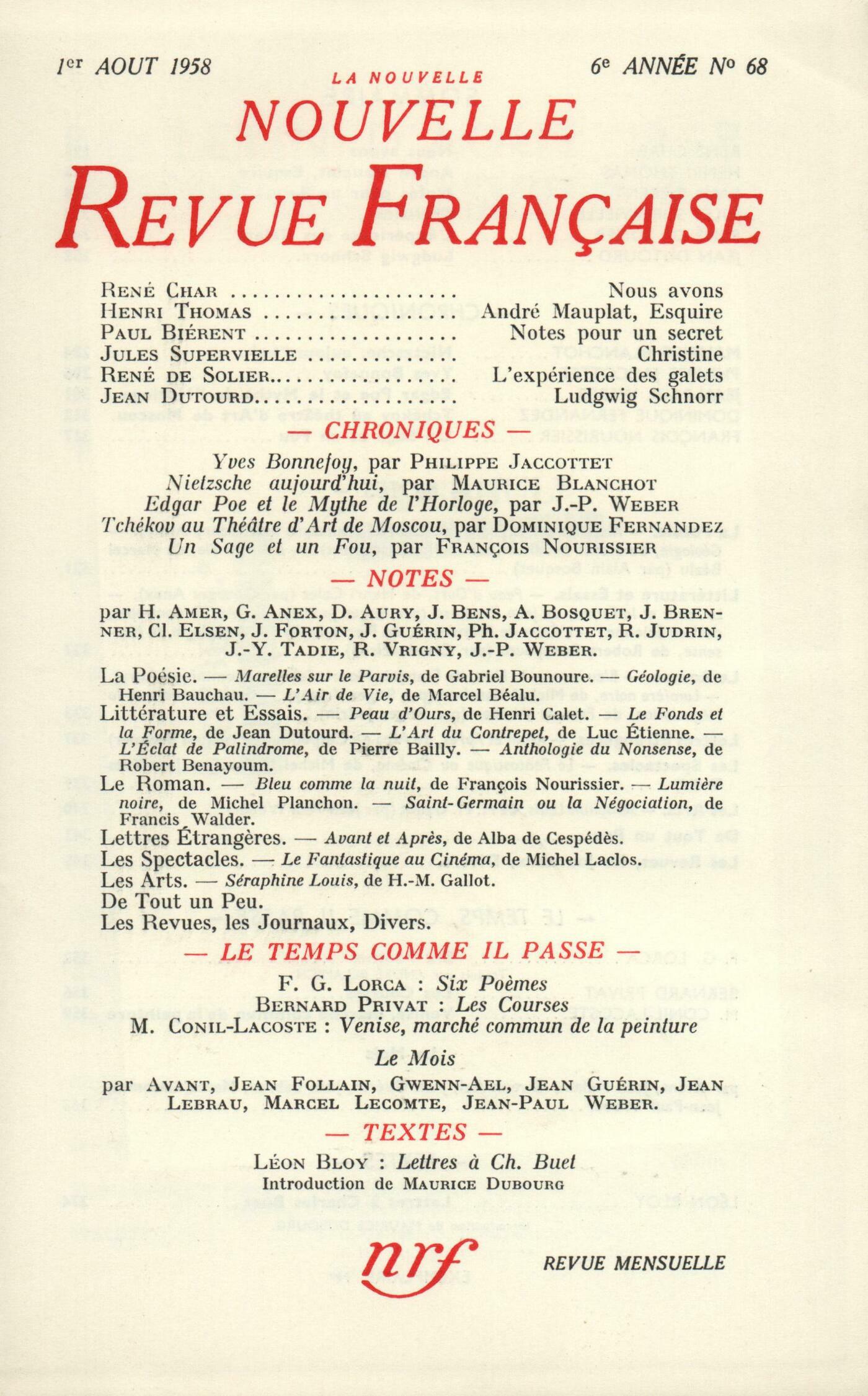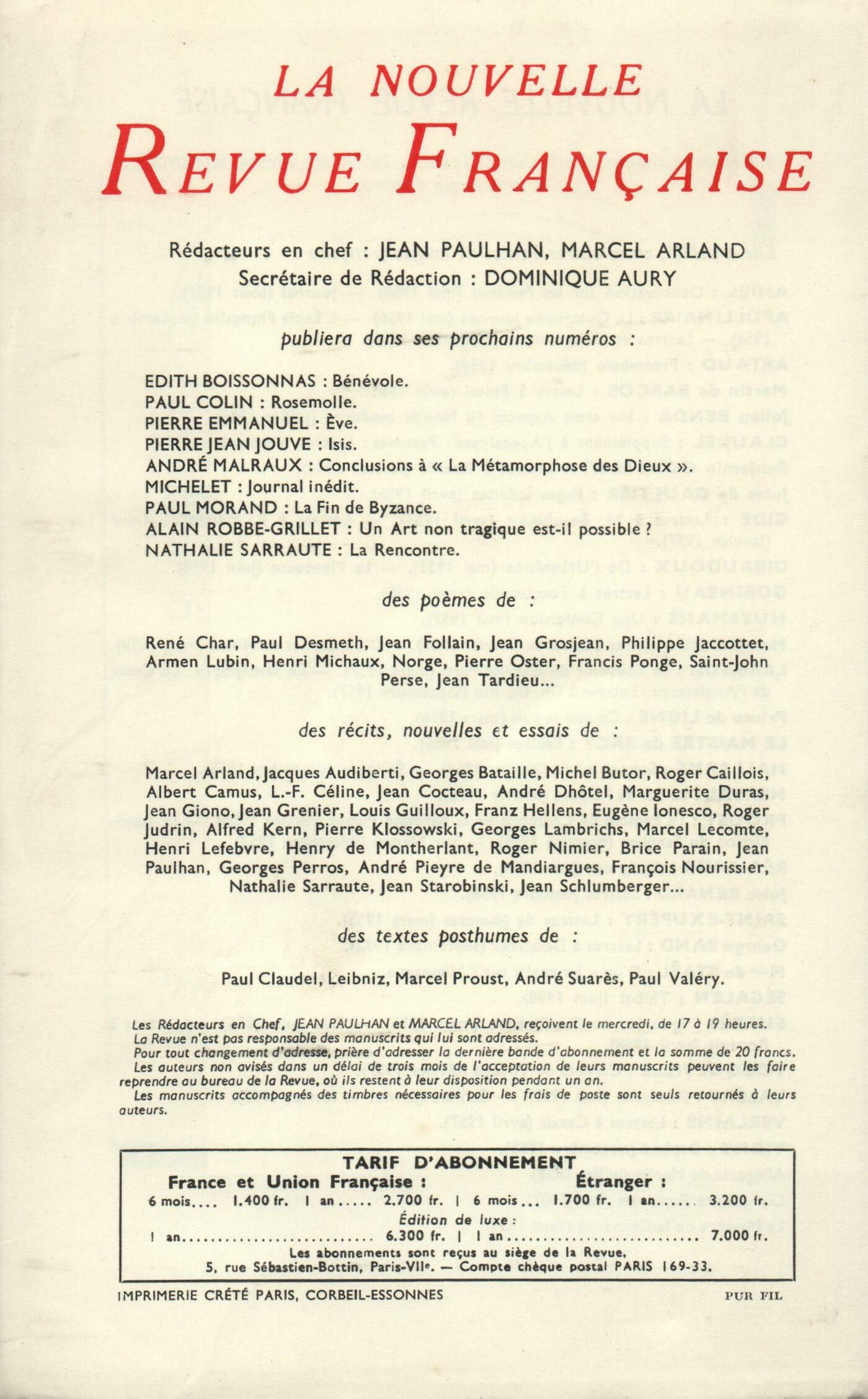 René Char, Nous avonsHenri Thomas, André Mauplat, EsquirePaul Biérent, Notes pour un secretJules Supervielle, ChristineRené de Solier, L'expérience des galetsJean Dutourd, Ludwig Schnorr ou La marche de l'HistoireChroniques : recherches : Maurice Blanchot, Nietzsche, aujourd'huiChroniques : Philippe Jaccottet, Yves BonnefoyJean-Paul Weber, Edgar Poe ou Le thčme de l'horlogeDominique Fernandez, Tchekhov au Théâtre d'Art de MoscouFrançois Nourissier, Un Sage et un FouNotes : la poésie : Henry Amer, Marelles sur le parvis, par Gabriel Bounoure (Plon)Philippe Jaccottet, Géologie, par Henry Bauchau (Gallimard)Alain Bosquet, L'Air de vie, par Marcel Béalu (Pierre Seghers)Notes : la littérature : Georges Anex, Peau d'ours, par Henri Calet (Gallimard)Roger Judrin, Le Fond et la Forme, par Jean Dutourd (Gallimard)Claude Elsen, L'art du contrepet, par Luc Étienne (J.-J. Pauvert) - L'éclat du palindrome, par Pierre Bailly Peut-on apprivoiser le palindrome?, par Luc Étienne (Revue Bizarre, J.-J. Pauvert) - Anthologie du nonsense, par Robert Benayoun (J.-J. Pauvert)Notes : le roman : Dominique Aury, Bleu comme la nuit, par François Nourissier (Grasset)Roger Vrigny, Lumičre noire, par Michel Planchon (Gallimard)Roger Judrin, Saint-Germain ou La négociation, par Francis Walder (Gallimard)Notes : lettres étrangčres : Jacques Brenner, Avant et aprčs, par Alba de Céspedes (Éditions du Seuil)Notes : les spectacles : Jean-Yves Tadié, Le Fantastique au cinéma, par Michel Laclos (J.-J. Pauvert)Notes : les arts : Jean-Paul Weber, Séraphine Louis, par H.-M. Gallot (L'Information artistique n° 60)De tout un peu : Jacques Bens, Ferveur française, par Paul Fort (Flammarion)Alain Bosquet, La Peine capitale, par Georges Haldas (Éditions Rencontre)Jean Forton, Les Ténčbres du dehors, par Maurice Desselle (Julliard) - Le Plein Été, par Jacques Peuchmaurd (Laffont) - La Terre du Barbare, par Jean Hougron (Del Duca) - Histoires anciennes, par Christian Mégret (Julliard)Jean-Paul Weber, Choix de contes, d'Edgar Poe (Aubier)Les revues, les journaux : Jean Guérin, Actualités - Drieu la Rochelle - DiversLe temps, comme il passe : Federico García Lorca, Six počmesBernard Privat, Les CoursesMichel Conil-Lacoste, Venise, marché commun de la peintureLe mois : Jean Follain, Georges Duveau Avant, L'Effraie L'AlouetteJean Lebrau, Brindilles Anonymes, D'un journal intimeJean Guérin, Boîtes d'allumettes Gwenn-Ael, Propos interrompusJean-Paul Weber, Petit cours de philosophieJean Follain, Du Théâtre de l'uvre ŕ la Place des VosgesTextes : Léon Bloy, Quelques lettres ŕ Charles Buet