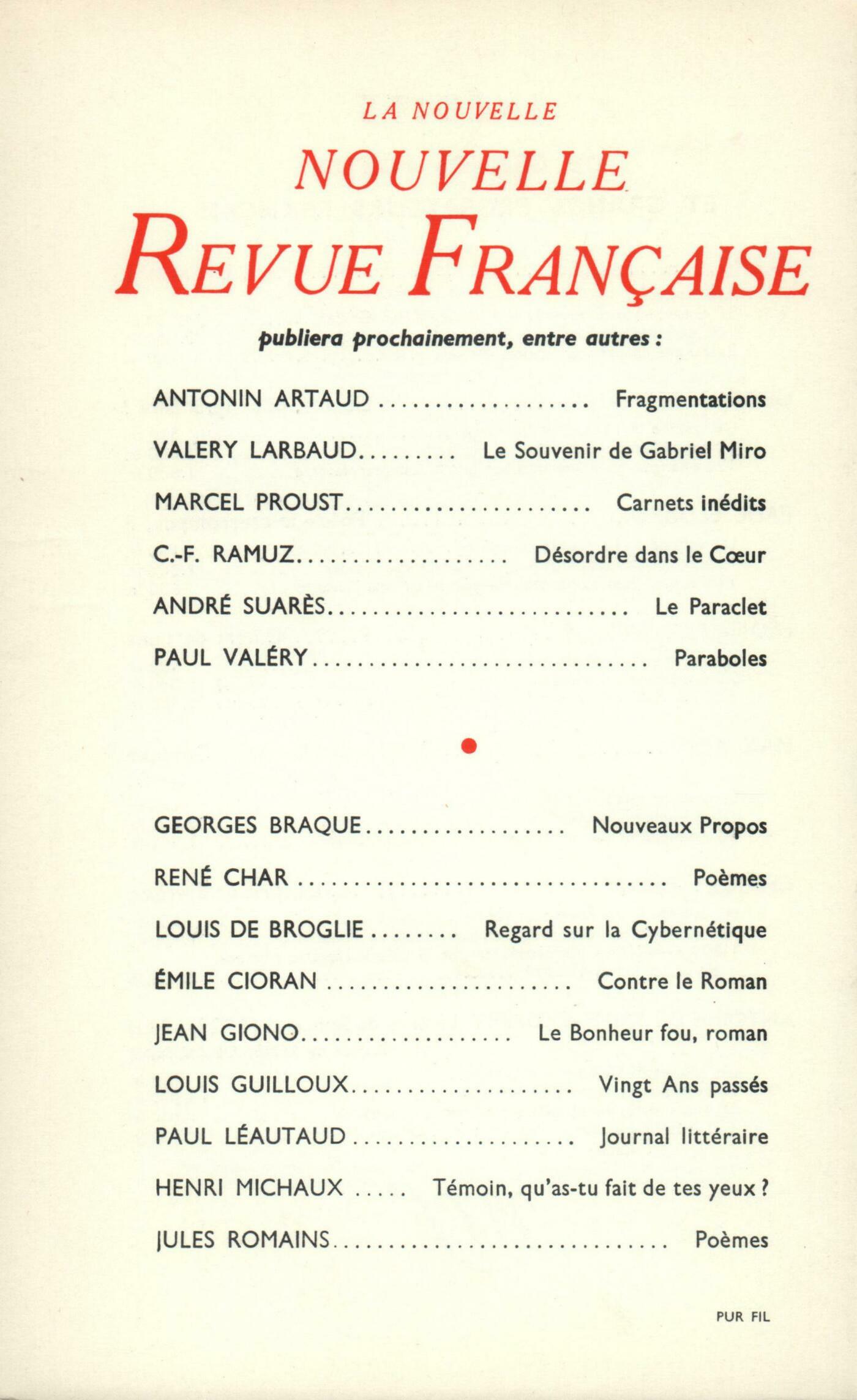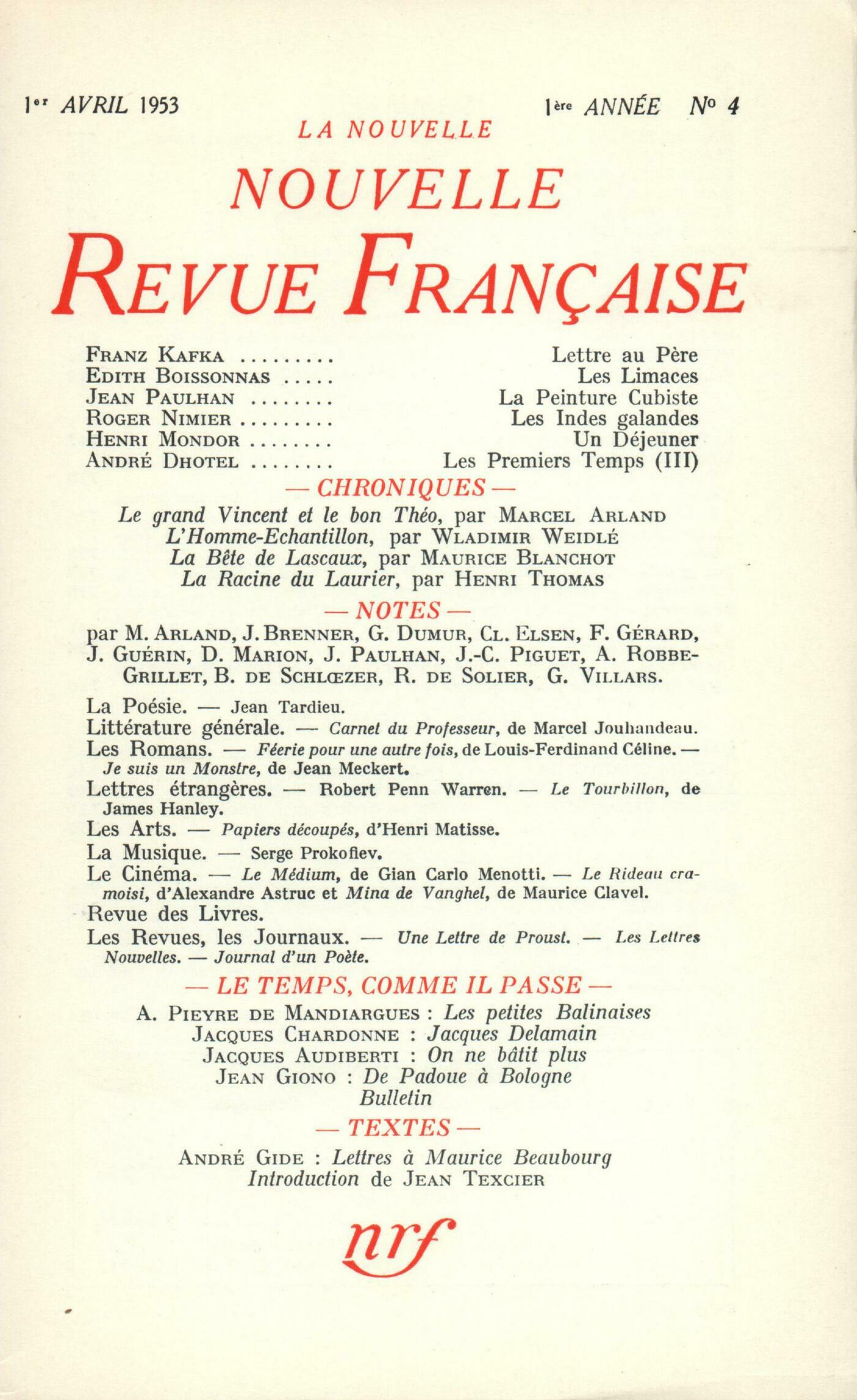 Franz Kafka, Lettre au pčre (I)Édith Boissonnas, Les LimacesJean Paulhan, La peinture cubiste ou L'espace d'avant les raisonsRoger Nimier, Les Indes galantesHenri Mondor, Un déjeunerAndré Dhôtel, Les Premiers Temps (III)Chroniques : Recherches : Maurice Blanchot, La Bęte de LascauxChroniques : la littérature : Marcel Arland, Le grand Vincent et le bon ThéoChroniques : Henri Thomas, La Racine du LaurierWladimir Weidlé, L'homme-échantillonNotes : la poésie : Marcel Arland, Jean TardieuNotes : littérature générale : Françoise Gérard, Carnet du Professeur, par Marcel Jouhandeau (Horay)Notes : les romans : Jacques Brenner, Féerie pour une autre fois, par Louis-Ferdinand Céline (Éditions de la N.R.F.)Jean-Claude Piguet, Je suis un monstre, par Jean Meckert (Gallimard)Notes : lettres étrangčres : Denis Marion, Robert Penn WarrenAlain Robbe-Grillet, Le Tourbillon, par James Hanley (Corręa)Notes : les arts : René de Solier, Papiers découpés, d'Henri Matisse (Berggruen)Notes : la musique : Boris de Schlzer, Serge ProkofievNotes : le cinéma : Denis Marion, Le Médium, par Gian-Carlo MenottiGuy Dumur, Le Rideau cramoisi et Mina de Vanghel, d'Alexandre Astruc et Maurice ClavelRevue des livres : Gilbert Villars, La mort est mon métier, par Robert Merle (Gallimard) - Mexique, par Pierre Fisson (Julliard)Françoise Gérard, Ŕ cur ouvert, par Odette Joyeux (Gallimard) - Si je criais, par Jean-Jacques Kim (Éditions du Seuil)Claude Elsen, Le Monde des A, par A. E. Van Vogt (Gallimard) - Nettoyage par le vide, par Mickey Spillane (Presses de la Cité)Michčle Rosier, Les migrations des Polynésiens, par P.H. Buck (Payot)Jean Guérin, Mémoire d'Homme, par René-Louis Doyon (La Connaissance) - Anatomie de l'Âme, par Henri Sebag (Monjoie-Saint-Denis)Les revues, les journaux : Marcel Proust, Une lettre Anonymes, Les Lettres Nouvelles - Le Journal des PočtesLe temps, comme il passe : Jean Giono, De Padoue ŕ BologneJacques Chardonne, Jacques DelamainAndré Pieyre de Mandiargues, Les petites BalinaisesJacques Audiberti, On ne bâtit plus Anonymes, BulletinTextes : André Gide, Quelques lettres ŕ Maurice Beaubourg Anonymes, Exposition Jarry - Note