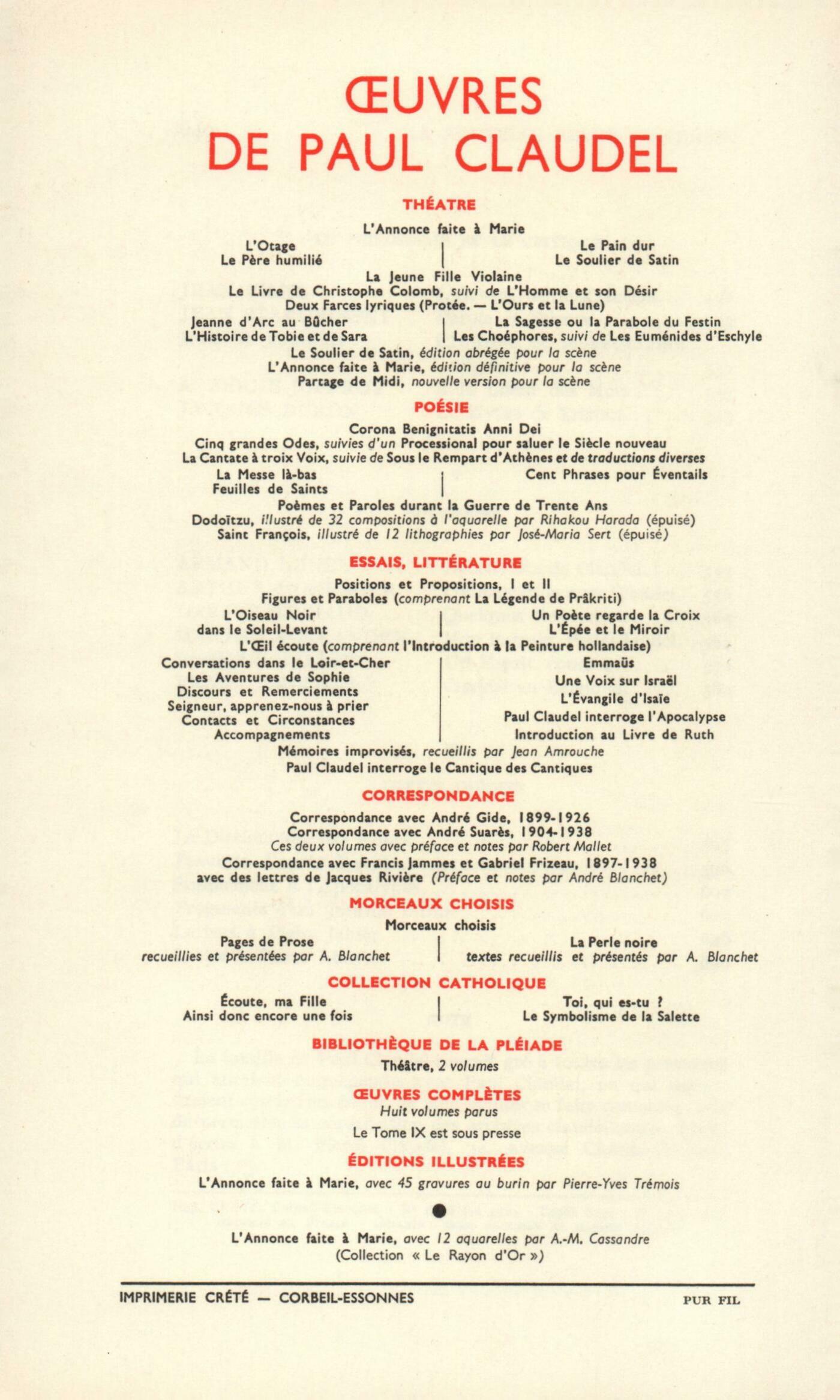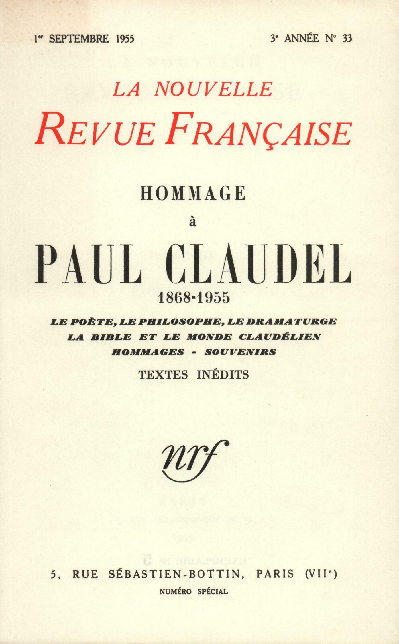 Hommages : Saint-John Perse, Silence pour ClaudelJules Supervielle, L'Arbre-FéeJules Romains, Paul Claudel et nousMarcel Jouhandeau, HommageFrancis Ponge, Prose De ProfundisLe monde claudélien : Maurice Blanchot, L'Autre ClaudelJean Grosjean, Claudel biblique ou nonYves Le Hir, L'Inspiration biblique dans l'Histoire de Tobie et de SaraGeorges Poulet, uf, Semence, Bouche ouverte, ZéroLe počte et le dramaturge : Philippe Jaccottet, La Terre parlePierre Oster, Note sur le Présent claudélienA. Rolland de Renéville, Ŕ propos de Paul Claudel Étiemble, Paul Claudel et le Vin des RochersGeorges Perros, La Fureur dramatiqueLe philosophe et le critique : Jean Wahl, L'Octave de la Création, l'Exhalaison de la TerreJean Starobinski, Parole et Silence de ClaudelRoger Judrin, Claudel et le Septičme SigneAndré Berne-Joffroy, Ŕ la Lueur des MotsJacques-Robert Duron, Le Mythe de TristanSouvenirs : Armand Lunel, Découverte de Paul ClaudelArthur Honegger, Collaboration avec Paul ClaudelDarius Milhaud, Quelques SouvenirsMaxime Alexandre, Mon Parrain Paul ClaudelRobert Mallet, Un Esprit concretFranz Hellens, Claudel en BelgiqueTextes inédits : Paul Claudel, Le Dictionnaire des Rimes - Psaumes d'aprčs David - Supplément ŕ l'Apocalypse - Journal intime (Fragments) - Lettres ŕ Piero Jahier - Lettre ŕ Pierre Lhoste
