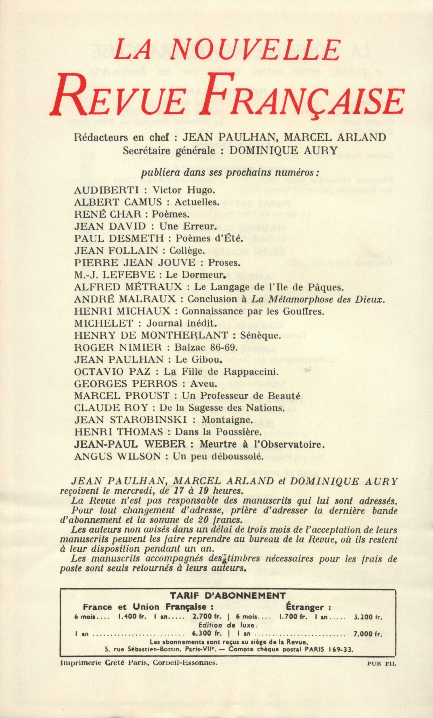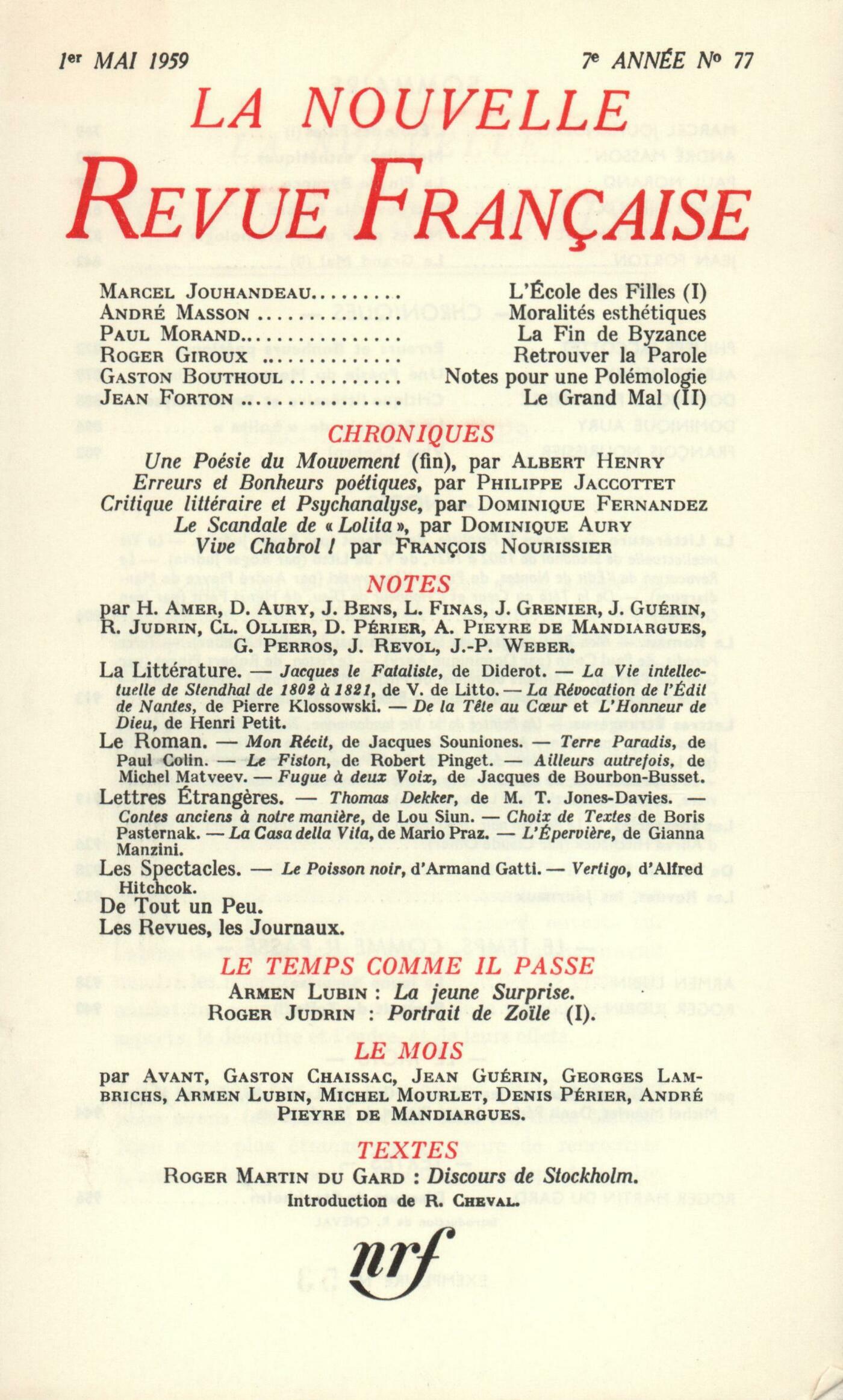 Marcel Jouhandeau, L'École des Filles (I)André Masson, Moralités esthétiquesPaul Morand, La Fin de ByzanceRoger Giroux, Retrouver la ParoleGaston Bouthoul, Notes pour une polémologieJean Forton, Le Grand Mal (II)Chroniques : la poésie : Philippe Jaccottet, Erreurs et bonheurs poétiquesChroniques : Albert Henry, Une Poésie du Mouvement (Fin)Dominique Fernandez, Critique littéraire et psychanalyseChroniques : le roman : Dominique Aury, Le scandale de LolitaChroniques : François Nourissier, Vive Chabrol!Notes : la littérature : Roger Judrin, Jacques le Fataliste, par Diderot - La vie intellectuelle de Stendhal de 1802 ŕ 1821, par V. Del Litto André Pieyre de Mandiargues, La Révocation de l'Édit de Nantes, par Pierre Klossowski Jean Grenier, De la tęte au cur, par Henri Petit - L'Honneur de Dieu, par Henri Petit Notes : le roman : Jean-Paul Weber, Mon Récit, par Jacques Souniones Dominique Aury, Terre Paradis, par Paul Colin Georges Perros, Le Fiston, par Robert Pinget Lucette Finas, Ailleurs autrefois, par Michel Matveev Jacques Bens, Fugue ŕ deux voix, par Jacques de Bourbon-Busset Notes : lettres étrangčres : Henry Amer, Un peintre dans la vie londonienne : Thomas Dekker, par M. T. Jones-Davies Lucette Finas, Contes anciens ŕ notre maničre, par Lou Siun Jean-Paul Weber, Choix de textes, de Boris Pasternak André Pieyre de Mandiargues, La Casa della Vita, par Mario Praz Lucette Finas, L'Épervičre, par Gianna Manzini Notes : les spectacles : Claude Ollier, Le Poisson Noir, par Armand Gatti - Vertigo (Sueurs froides), d'Alfred HitchcockDe tout un peu : Denis Périer, Les Maîtres et les Amis, par Jacques de Lacretelle Jean-Paul Weber, Manuel pratique du test de Rorschach, par Marguerite Loosli-Usteri Denis Périer, Roses ŕ crédit, par Elsa Triolet - Aimer fait peur, par Marie-Émilie Rey - Mourir demain, par Jean-Jacques Chaumont Roger Judrin, Mario Mariani, par Marie-Suzanne Berry Jean Guérin, Une Confrontation, par Klee et Kandinsky Jean Revol, Ardoises taillées, de Raoul Ubac (Galerie Adrien Maeght) - Thadée Kantor (Galerie Le Gendre)Pierre Courthion, La Jeune Parque de Marianne Clouzot (Aux dépens de l'auteur)Les revues, les journaux : R. Char, Cinq Poésies en hommage ŕ Georges BraqueJ. Guérin - D. de Rougemont, Métamorphoses de TristanA. Camus - J. Guérin - E. Ionesco, Cahier des saisonsJ. Guérin - M. Vinaver, Le sottisierJ. Guérin, DiversLe temps, comme il passe : A. Lubin, La jeune SurpriseR. Judrin, Portrait de Zoďle (I)Le mois : A. Pieyre de Mandiargues, Le Corps du PočmeG. Chaissac, Chronique de l'oie A. Lubin, Printemps G. Lambrichs, Une bonne nouvelle J. Guérin, La vie pratique (Suite) Avant, Austrasie Anonymes, Lettre ŕ la Sécurité sociale M. Mourlet, D. Périer, Petite discussion sur un événement attendu R. Cheval, ŤLe 11 novembre 1937, l'Académie suédoise décidait d'attribuer le prix Nobel...ť R. Martin du Gard, Discours de Stockholm