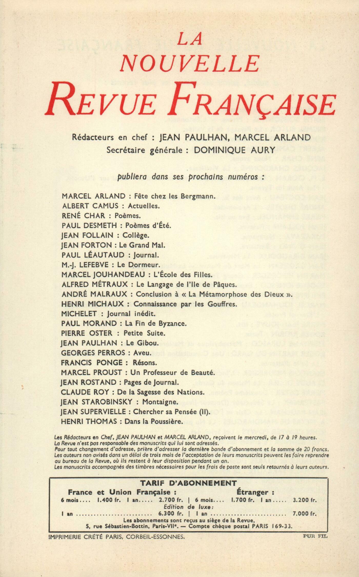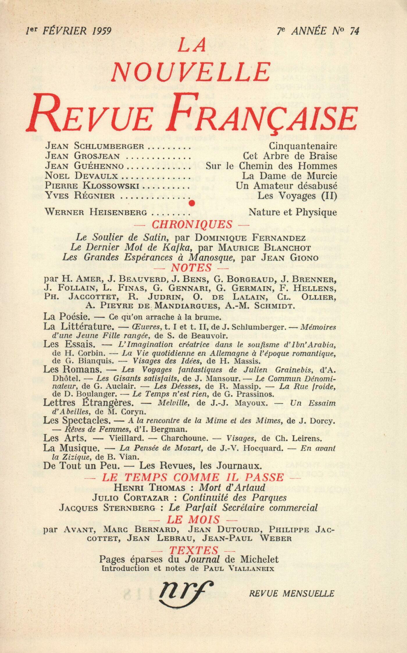 Jean Schlumberger, CinquantenaireJean Grosjean, Cet Arbre de braiseJean Guéhenno, Sur le Chemin des hommesNoël Devaulx, La Dame de MurciePierre Klossowski, Extraits des carnets d'un amateur désabuséYves Régnier, Les Voyages (II)Werner Heisenberg, L'Image de la nature selon la physique contemporaine (II)Chroniques : recherches : Maurice Blanchot, Le Dernier Mot de KafkaChroniques : Jean Giono, Les Grandes Espérances ŕ ManosqueChroniques : le théâtre : Dominique Fernandez, Le Soulier de SatinNotes : la poésie : Philippe Jaccottet, Ce qu'on arrache ŕ la brumeNotes : la littérature : Jean Schlumberger, uvres, I, II, de Jean Schlumberger (Gallimard)Henry Amer, Mémoires d'une jeune fille rangée, par Simone de Beauvoir (Gallimard)Notes : les essais : Gabriel Germain, L'Imagination créatrice dans le soufisme d'Ibn 'Arabi, par Henry Corbin (Flammarion)Albert-Marie Schmidt, La Vie quotidienne en Allemagne ŕ l'époque romantique, par Genevičve Bianquis (Hachette)Roger Judrin, Visages des idées, par Henri Massis (Grasset)Notes : le roman : Georges Borgeaud, Les Voyages fantastiques de Julien Grainebis, par André Dhôtel (Pierre Horay)André Pieyre de Mandiargues, Les Gisants satisfaits, par Joyce Mansour (Pauvert)Lucette Finas, Le Commun Dénominateur, par Georges Auclair (Gallimard)Odile de Lalain, Les Déesses, par Renée Massip (Gallimard)Claude Ollier, La Rue Froide, par Daniel Boulanger (La Table Ronde)Jacques Bens, Le Temps n'est rien, par Gisčle Prassinos (Plon)Notes : lettres étrangčres : Henry Amer, Melville, par Jean-Jacques Mayoux (Le Seuil)Genevičve Gennari, Un Essaim d'abeilles, par Marjorie Coryn (Gallimard)Notes : les spectacles : Jean Follain, Ŕ la rencontre de la Mime et des mimes, par Jean Dorcy (Les Cahiers de danse et de culture)Claude Ollier, Ręves de femmes, d'Ingmar BergmanNotes : les arts : René de Solier, Roger Vieillard (Galerie Adrien Maeght) - Charchoune (Galerie Michel Warren)Franz Hellens, Visages, de Charles Leirens (Galerie du Cheval de verre)Notes : la musique : Jacques Beauverd, La Pensée de Mozart, par J.-V. Hocquard Jacques Bens, En avant la zizique, par Boris Vian De tout un peu : Philippe Jaccottet, Poésie orale - Débris, par Charles Mouchet - La Pelote ŕ épingles, par Gabrielle Marquet Jean-Paul Weber, Les Barreaux de bois, par Yves DierryckGilbert Villars, La Fille jetée aux loups, par Xavier Salomon Jean-Paul Weber, Les Dévoyés, par Paul Arnold Odile de Lalain, La Lettre, par Clarisse Francillon Les revues, les journaux : J. Guérin, Le premier numéro un - DiversLe temps, comme il fait : H. Thomas, Mort d'ArtaudJ. Cortázar, Continuité des ParquesJ. Sternberg, Le parfait secrétaire commercialLe mois : P. Jaccottet, Notes d'hiverJ. Lebrau, Brindilles (II)M. Bernard, Noël, sous les pontsAvant, Le coucou Le pinson Le merle Le pigeon Le verdier Le troglodyte J.-P. Weber, Humour blęme J. Dutourd, Les noix confites P. Viallaneix, ŤBientôt sera ouvert tout grand...ť J. Michelet, Pages éparses du Journal