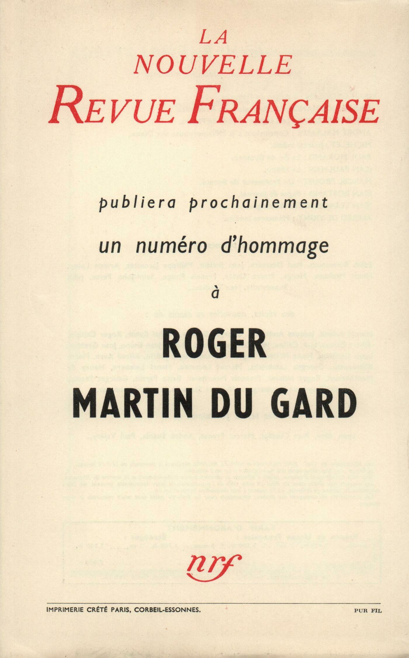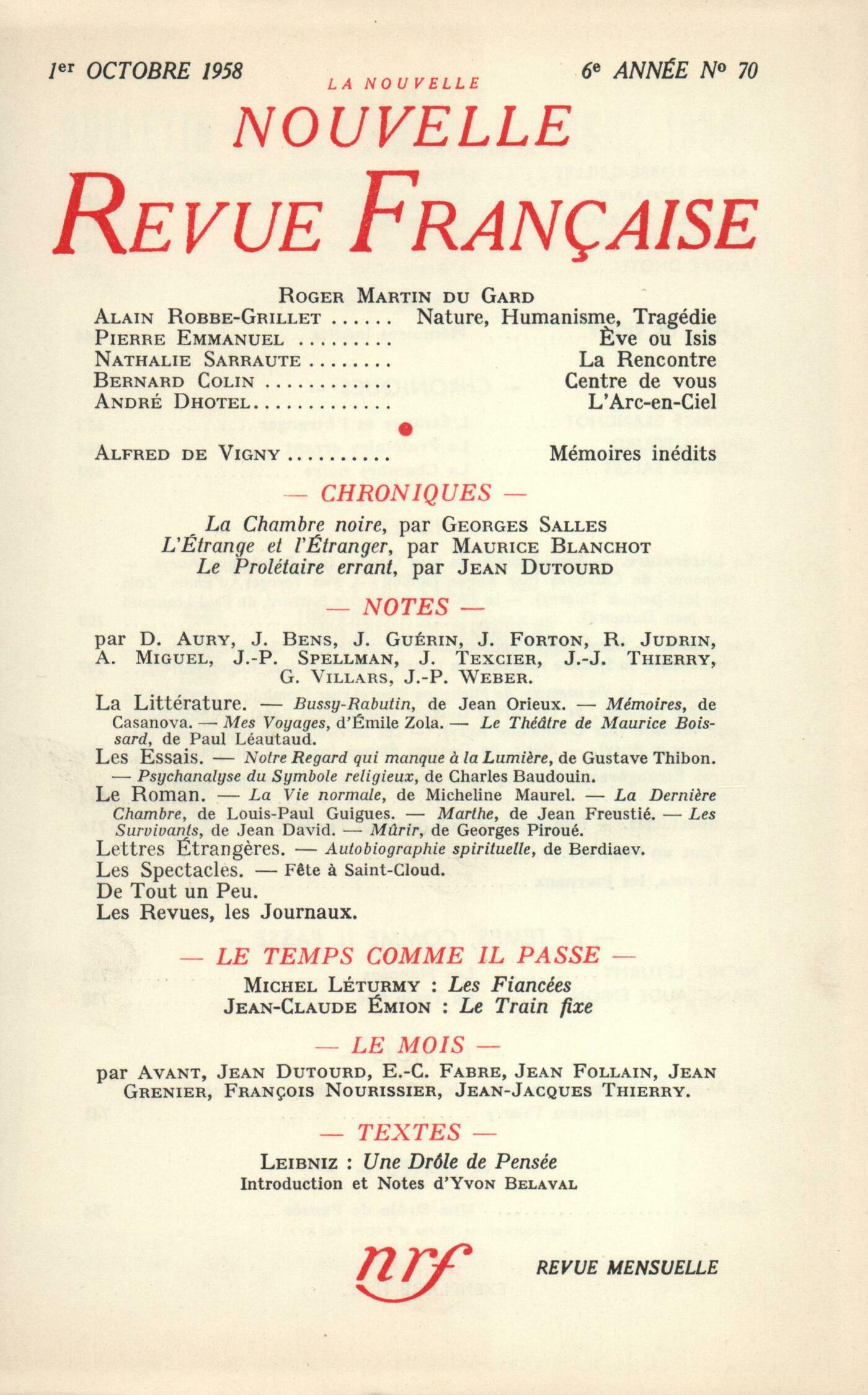 Jean Paulhan, Roger Martin du GardAlain Robbe-Grillet, Nature, Humanisme, TragédiePierre Emmanuel, Čve ou IsisNathalie Sarraute, La RencontreBernard Collin, Centre de vousAndré Dhôtel, L'Arc-en-cielAlfred de Vigny, Mémoires inéditsChroniques : recherches : Maurice Blanchot, L'Étrange et l'ÉtrangerChroniques : Jean Dutourd, Le Prolétaire errantGeorges Salles, La Chambre noireNotes : la littérature : Dominique Aury, Bussy-Rabutin, le libertin galant homme, par Jean Orieux (Flammarion)Roger Judrin, Mémoires, de Casanova (Gallimard)Jean-Jacques Thierry, Mes voyages, par Émile Zola (Fasquelle)Jean Dutourd, Le Théâtre de Maurice Boissard, par Paul Léautaud (Gallimard)Notes : les essais : Roger Judrin, Notre regard qui manque ŕ la lumičre, par Gustave Thibon (Amiot-Dumont) - Psychanalyse du symbole, par Charles Baudouin (Arthčme Fayard)Notes : le roman : Dominique Aury, La Vie normale, par Micheline Maurel (Éditions de Minuit)Jacques Bens, La Derničre Chambre, par Louis-Paul Guigues (N. R. F.)Dominique Aury, Marthe ou Les Amants tristes, par Jean Freustié (La Table Ronde) - Les Survivants, par Jean David (Le Seuil)Jean Guérin, Műrir, par Georges Piroué (Denoël)Notes : lettres étrangčres : Jean-Pierre Spellman, Essai d'autobiographie spirituelle, par Nicolas Berdiaev (Buchet-Chastel)Notes : les spectacles : Jean Texcier, La fęte ŕ Saint-CloudDe tout un peu : Jean Forton, Les Enfants du Marais, par Georges Montforez (Gallimard) - L'Escurial et l'Amour, par Marcel Schneider (Albin Michel)André Miguel, De tous les horizons, par Driss Chraďbi (Denoël) - Les Transparents, par Vassily Photiades (Stock)Jacques Bens, Le Grand Homme gris, par Marie-Gisčle Landes (Gallimard)Jean-Paul Weber, Le plus jeune fils de l'écureuil, par Michel Calonne (Robert Laffont) - Les Heureux de la Terre, par Jean Rousselot (Albin Michel)Gilbert Villars, Ne te retourne pas, Kipian, par Vahé Katcha (Plon)Jean Guérin, Parabole, par William Faulkner (Gallimard)Jacques Bens, Louison Bobet, une vélobiographie, par Jean Bobet (Gallimard)Les revues : Gabriel Bounoure - Jean Guérin, La rose de ChoubrahJean Guérin - Vladimir Tarr, L'anticosmosJean Guérin, ŤTa gueule!ť - Divers Anonymes, NotesLe temps, comme il passe : Michel Léturmy, Les FiancéesJean-Claude Emion, Le Train fixeLe mois : Philippe Jaccottet, NotesJean Follain, San Marino Plutarque, Ŕ qui servent les grands hommes d'État... Avant, Le MillepertuisFrançois Nourissier, Auto-critique (II)E.-C. Fabre, TerrasseJean-Jacques Thierry, Du snobismeTextes : Yvon Belaval, Une Ťdrôle de penséeť de LeibnizG.W. Leibniz, Drôle de Pensée