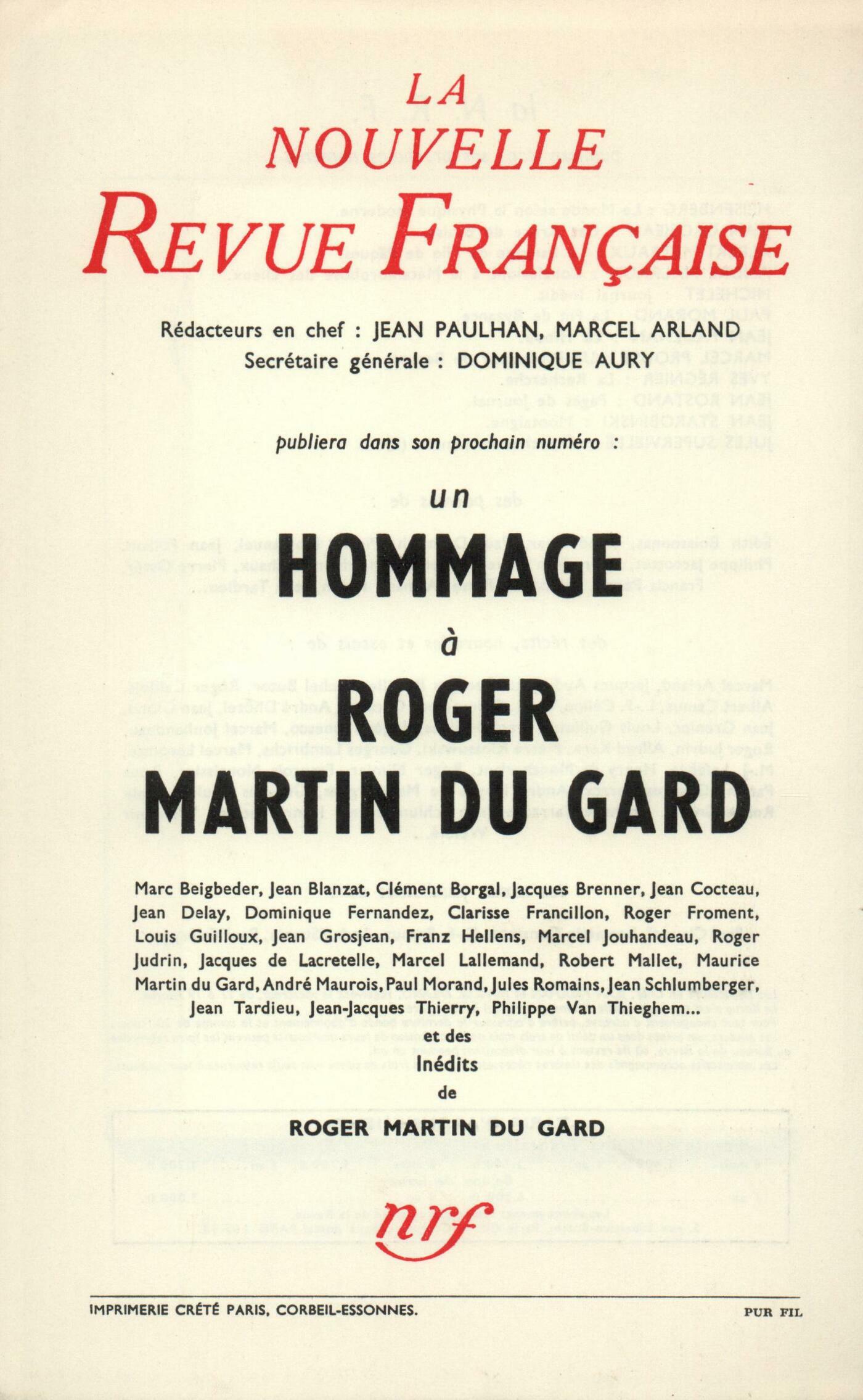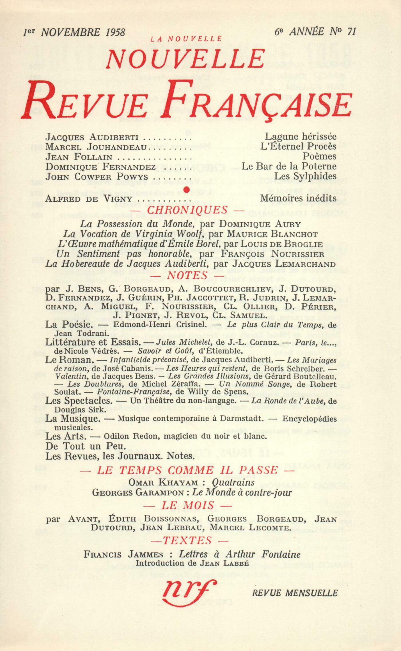 Jacques Audiberti, Lagune hérisséeMarcel Jouhandeau, L'Éternel ProcčsJean Follain, PočmesDominique Fernandez, Le Bar de la PoterneJohn Cowper Powys, Les SylphidesAlfred de Vigny, Mémoires inéditsChroniques : recherches : Maurice Blanchot, La Vocation de Virginia WoolfChroniques : Louis de Broglie, L'uvre mathématique d'Émile BorelDominique Aury, La Possession du MondeChroniques : le théâtre : Jacques Lemarchand, La Hobereaute, de Jacques AudibertiChroniques : François Nourissier, Un Sentiment pas honorableNotes : la poésie : Philippe Jaccottet, Edmond-Henri Crisinel - Le plus clair du Temps, par Jean Todrani (G. L. M.)Notes : les essais, la littérature : Roger Judrin, Jules Michelet, par Jean-Louis Cornuz (Droz)François Nourissier, Paris, le..., par Nicole Vedrčs (Mercure de France)Roger Judrin, Savoir et Goűt, par Étiemble (Gallimard)Notes : le roman : Roger Judrin, Infanticide préconisé, par Jacques Audiberti (Gallimard)Jacques Lemarchand, Les Mariages de raison, par José CabanisClaude Ollier, Les Heures qui restent, par Boris Schreiber (Denoël)Jean Dutourd, Valentin, par Jacques Bens (Gallimard)François Nourissier, Les Grandes Illusions, par Gérard Boutelleau (Grasset) - Les Doublures, par Michel Zéraffa (Albin Michel)Georges Borgeaud, Un nommé Songe, par Robert Soulat (Gallimard)Jacques Bens, Fontaine-Française, par Willy de Spens (Plon)Notes : les spectacles : Dominique Fernandez, Un théâtre du non-langageClaude Ollier, La Ronde de l'aube, de Douglas SirkNotes : la musique : André Boucourechliev, Musique contemporaine ŕ DarmstadtClaude Samuel, Encyclopédies musicalesNotes : les arts : Jean Revol, Odilon Redon, magicien du noir et blanc (Stephen Higgins)De tout un peu : Janine Pignet, Henri Poincaré ou La vocation souveraine, par André Bellivier (Gallimard)Georges Borgeaud, Chrétienne Compagnie, par Guy Mazeline (Gallimard)Jacques Bens, Les Passagers du Sidi-Brahim, par Jacques Lanzmann (Julliard)Denis Périer, Emmanuelle ou Le Doute, par P. P. Schneeberger (Gallimard) - L'État de grâce, par Daniel Gilles (Gallimard) - Tulipan, par Yvonne Escoula (Gallimard)Jacques Bens, Une Lettre, par Michel Breitman (Denoël)Jean Guérin, La Lampe de Sala, par Gabriel Germain (Plon)François Nourissier, Drame dans un miroir, par Marcel Haedrich (Denoël)André Miguel, Le Pauvre d'esprit, par Constantin Amariu (Denoël)Les revues, les journaux : J. Guérin - P. Rollet, La tentative de GordeJ. Guérin - G. Mathieu, Vers une nouvelle incarnation des signesJ. Guérin, Bachelin rencontre Léautaud - DiversAnonymes, NotesLe temps, comme il passe : O. Khayyâm, QuatrainsG. Garampon, Le monde ŕ contre-jourLe mois : É. Boissonnas, Un hôte de choixJ. Lebrau, BrindillesAvant, La Mésange Le Chardonneret La Grive La Perdrix Le Pic ÉpeicheJ. Dutourd, Les Deux EnnuisM. Lecomte, D'un Journal intime G. Borgeaud, Le désert J. Labbé, ŤDe toutes les correspondances que Francis Jammes a entretenues avec...ťF. Jammes, Lettres ŕ A. Fontaine