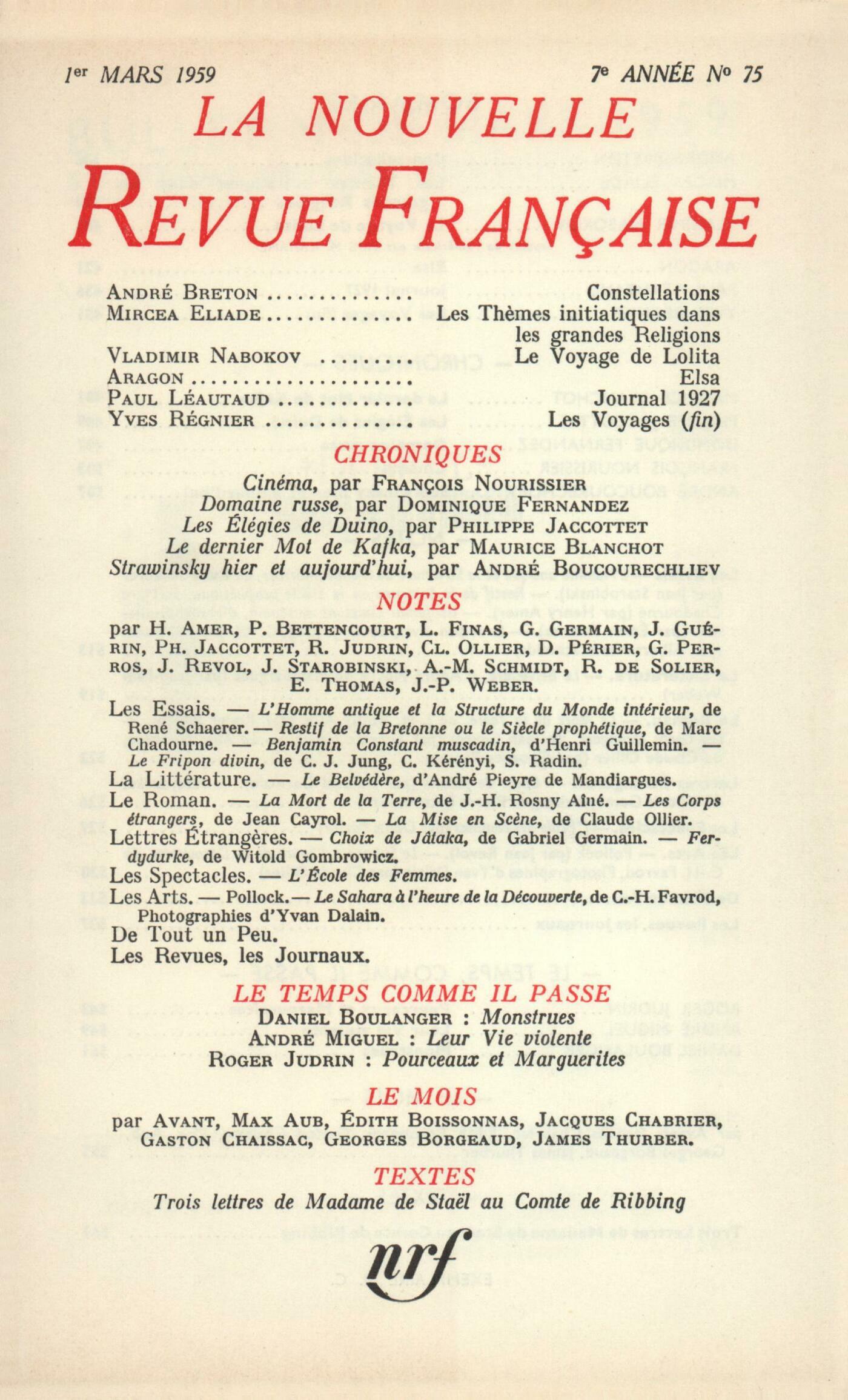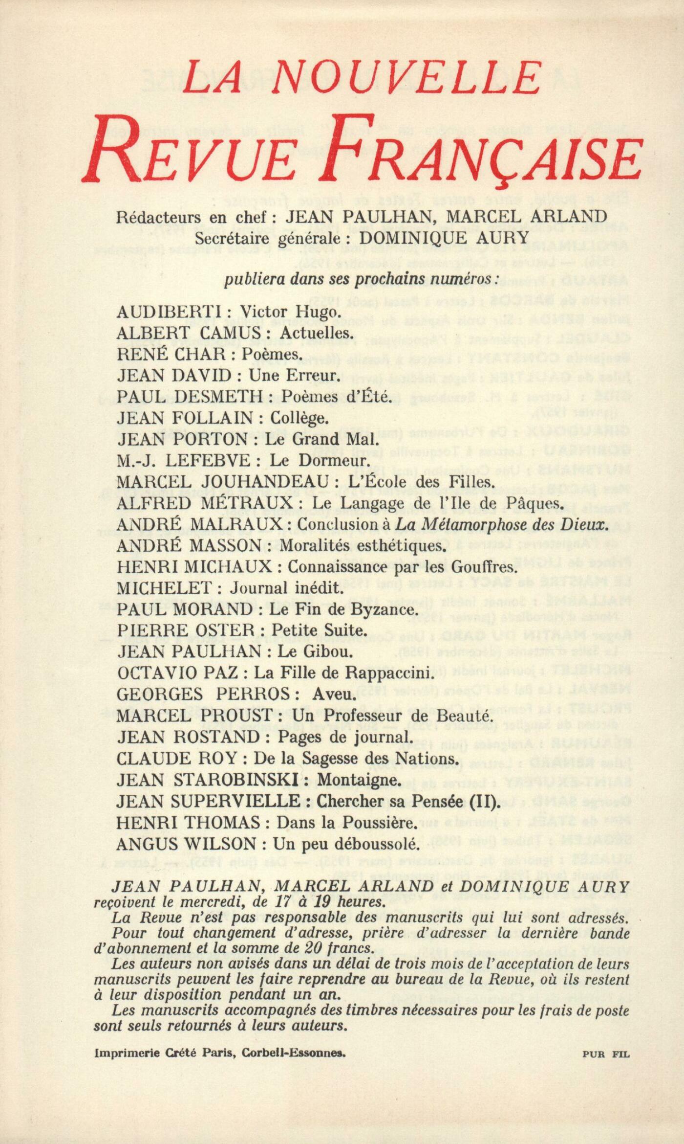André Breton, ConstellationsMircea Eliade, Les thčmes initiatiques dans les grandes religionsVladimir Nabokov, Le Voyage de LolitaLouis Aragon, Elsa (Fragment)Paul Léautaud, Journal 1927 (Fragments)Yves Régnier, Les Voyages (Fin)Chroniques : recherches : Maurice Blanchot, Le Dernier Mot de Kafka (II)Chroniques : la poésie : Philippe Jaccottet, Les Élégies de DuinoChroniques : le théâtre : Dominique Fernandez, Domaine russeChroniques : François Nourissier, Le cinémaAndré Boucourechliev, Strawinsky hier et aujourd'huiAndré Boucourechliev - Boris de Schlzer, Un entretien [ŕ propos de Strawinsky]Notes : les essais : Jean Starobinski, L'Homme antique et la structure du Monde intérieur, par René Schaerer (Payot)Henry Amer, Restif de la Bretonne ou Le sičcle prophétique, par Marc Chadourne (Hachette)Édith Thomas, Benjamin Constant muscadin, par Henri Guillemin (Gallimard)Albert-Marie Schmidt, Le Fripon divin, par C.-G. Jung, C. Kérényi et S. Radin (Georg et Albin Michel)Notes : la littérature : Jean-Paul Weber, Le Belvédčre, par André Pieyre de Mandiargues (Grasset)Notes : le roman : Roger Judrin, La Mort de la Terre, par J.-H. Rosny (Denoël)Lucette Finas, Les Corps étrangers, par Jean Cayrol (Le Seuil)Georges Perros, La Mise en scčne, par Claude Ollier (Éditions de Minuit)Notes : lettres étrangčres : Gabriel Germain, Choix de Jâtaka (Gallimard)Pierre Bettencourt, Ferdydurke, par Witold Gombrowicz (Julliard)Notes : les spectacles : Denis Périer, L'École des Femmes (T. N. P.)Notes : les arts : Jean Revol, Pollock et la jeune peinture américaine (Musée d'Art moderne)Claude Ollier, Le Sahara ŕ l'heure de la découverte, par Charles-Henri Favrod (La Guilde du Livre)De tout un peu : Denis Périer, Počmes, de Sabine Sicaud (Stock)Philippe Jaccottet, A E A, par Urs Oberlin (Jeune Poésie)Denis Périer, Portrait d'un officier, par Pierre-Henri Simon (Le Seuil)Lucette Finas, L'Ordre des choses, par Jacques Brosse (Plon)Jean-Paul Weber, Les Belles d'acier, par Robert Pascal (Corręa)Denis Périer, Un Heureux Événement, par Suzy Morel (Le Seuil) - Beauchant (Galerie Bignon)Jean Revol, Quatre peintres (Galerie Breteau)Denis Périer, New-York, par Bernard Buffet (Galerie David-Garnier)Les revues, les journaux : Francis Ponge, L'AbricotAlbert Camus, Sur Les Îles de Jean GrenierJean Guérin, Le sottisier Anonymes, DiversLe temps, comme il passe : Roger Judrin, Pourceaux et margueritesAndré Miguel, Leur vie violenteDaniel Boulanger, MonstruesLe mois : Avant, HerbierJacques Chabrier, D'un JournalÉdith Boissonnas, Poésie et romanGaston Chaissac, Chronique de l'OieMax Aub, Crimes exemplairesGeorges Borgeaud, Les bruits du matinJames Thurber, La Licorne dans le jardinTextes : Madame de Staël, Trois lettres au Comte de Ribbing
