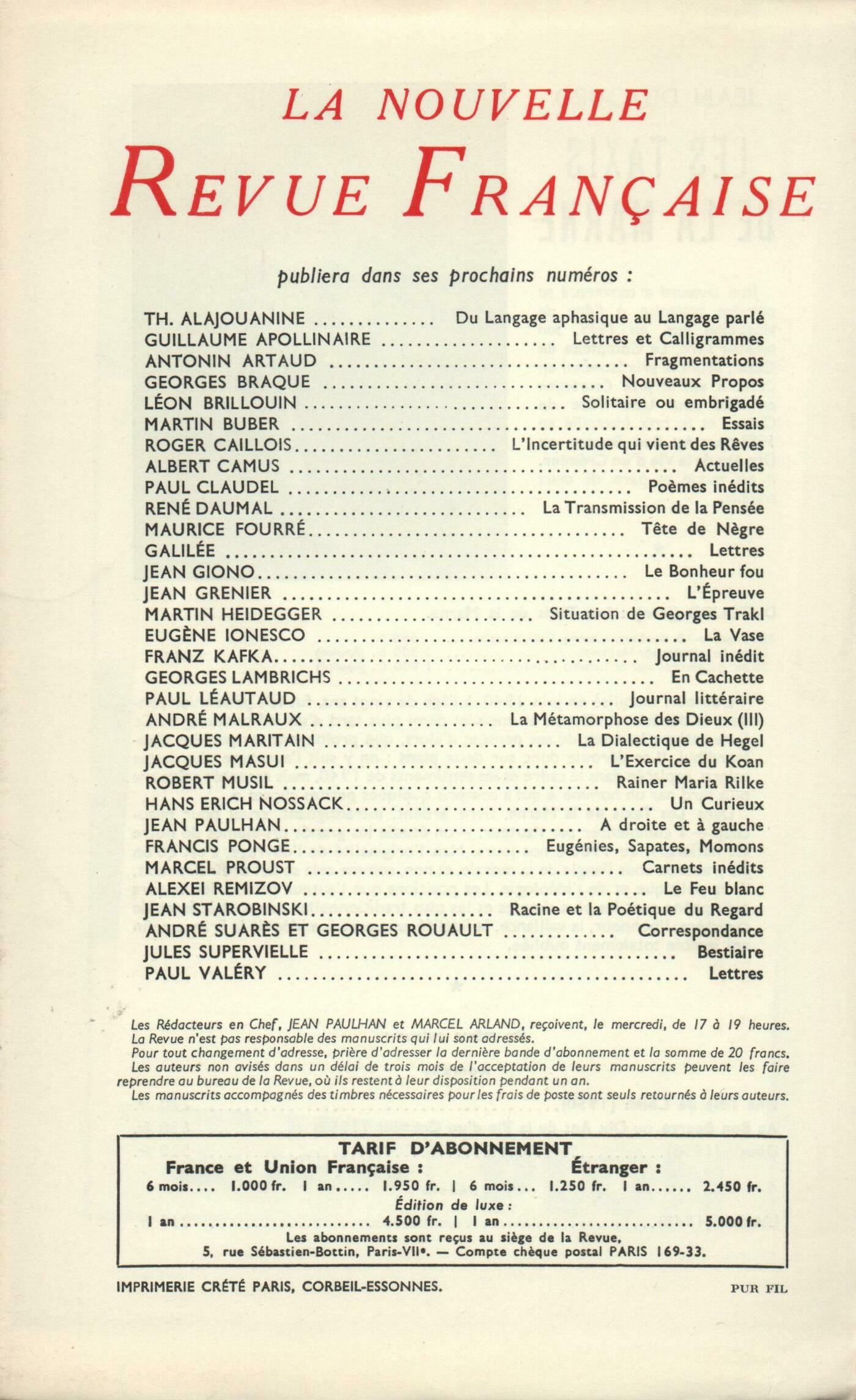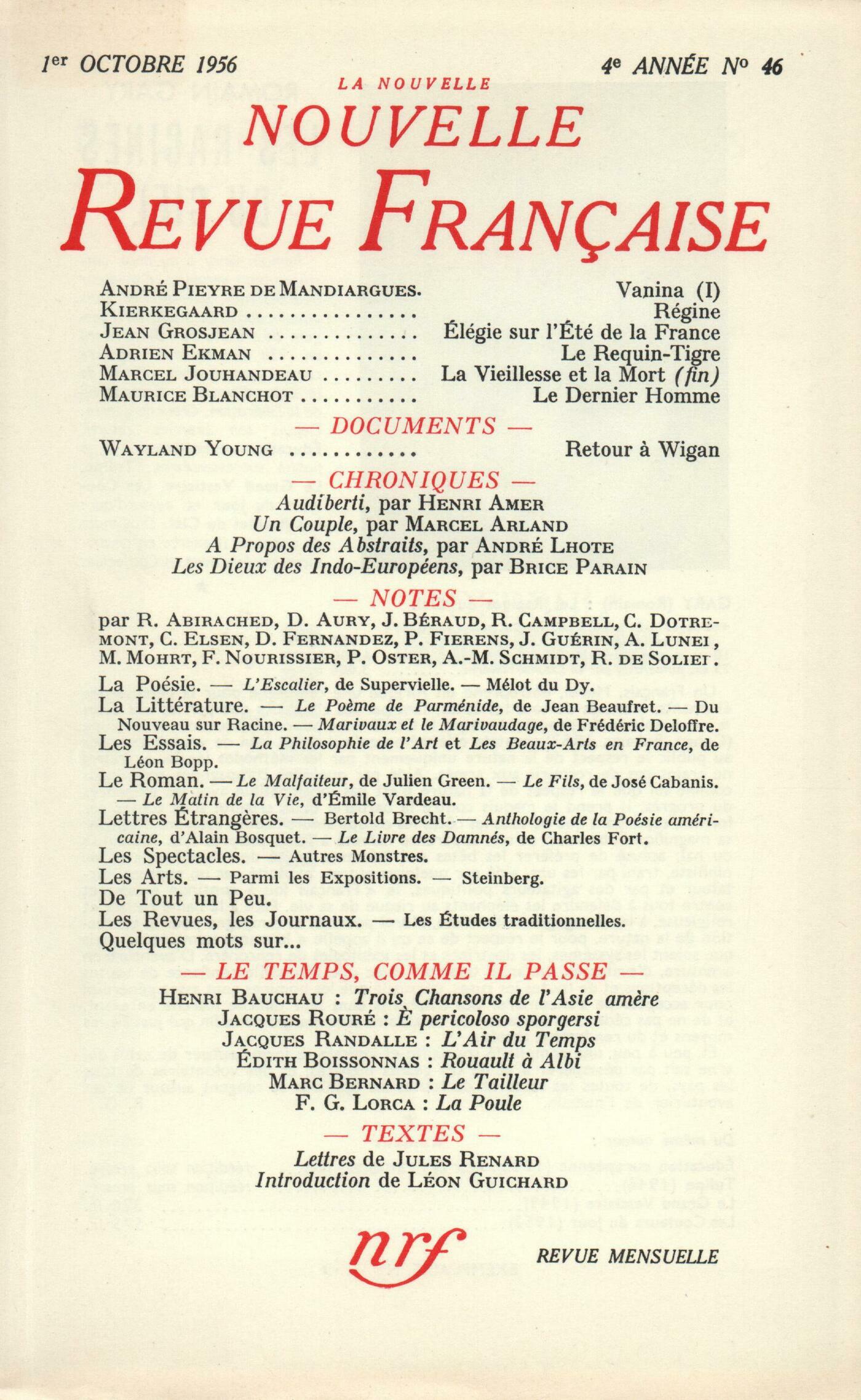 André Pieyre de Mandiargues, VaninaSören Kierkegaard, RégineJean Grosjean, Élégie sur l'Été de la FrancePierre-Adrien Ekman, Le Requin-TigreMarcel Jouhandeau, Réflexions sur la Vieillesse et la Mort (Fin)Maurice Blanchot, Le Dernier HommeDocuments : Wayland Young, Retour ŕ WiganChroniques : Marcel Arland, Un coupleHenry Amer, Aubiberti, romancier de l'incarnationBrice Parain, Les Dieux des Indo-EuropéensAndré Lhote, Ŕ propos des AbstraitsNotes : la poésie : Pierre Oster, L'Escalier, par Jules Supervielle (Gallimard)Paul Fierens, Mélot du DyNotes : la littérature : Robert Campbell, Le Počme de Parménide, par Jean Beaufret (P. U. F.)Robert Abirached, Du nouveau sur RacineAlbert-Marie Schmidt, Marivaux et le marivaudage, par Frédéric Deloffre (Les Belles-Lettres)Notes : les essais : Armand Lunel, Philosophie de l'Art, par Léon Bopp (Gallimard) - Les Beaux-Arts en France, par Léon Bopp (Gallimard)Notes : le roman : Christian Dotremont, Le Malfaiteur, par Julien Green (Plon)Dominique Aury, Le Fils, par José Cabanis (Gallimard) - Le Matin de la Vie, par Émile Vardeau (Gallimard)Notes : lettres étrangčres : Dominique Fernandez, Bertold Brecht ou L'Homme incapable de TragédieMichel Mohrt, Anthologie de la poésie américaine, par Alain Bosquet (Stock)Claude Elsen, Le Livre des Damnés, par Charles Fort (Deux-Rives)Notes : le cinéma : François Nourissier, Autres MonstresNotes : les arts. Parmi les expositions : René de Solier, Bernard Dufour (Galerie Pierre) - Saby (Galerie du Dragon) - Bona (Galerie de Beaujolais) - Sergio de Castro (Galerie Rive Gauche) - Beretta (Galerie de l'Odéon) - Hayter (Galerie La Hune) - Henri Georges Adam (Biennale de Venise)Janine Béraud, Dessins, de Steinberg (Gallimard)De tout un peu : Dominique Aury, Journal d'un raté, par Henri Pollčs (Gallimard)Jean Guérin, Jules Renard, par Marcel Pollitzer (La Colombe) - Les Nomades de la Mer, par J. Emperaire (Gallimard) - Fabrice, par Pierre Benoît (Albin Michel) - Les Enfantillages, par Claude Jamet (Flammarion)Les revues : René Guénon - Jean Guérin, Les Études traditionnelles Anonymes, Divers - Quelques mots sur...Le temps, comme il passe : Federico García Lorca, La PouleMarc Bernard, Le TailleurHenry Bauchau, Trois Chansons d'Asie amčreJacques Rouré, Č pericoloso sporgersiÉdith Boissonnas, Rouault au Musée Toulouse-Lautrec ŕ AlbiJacques Randalle, L'Air du TempsTextes : Jules Renard, Lettres