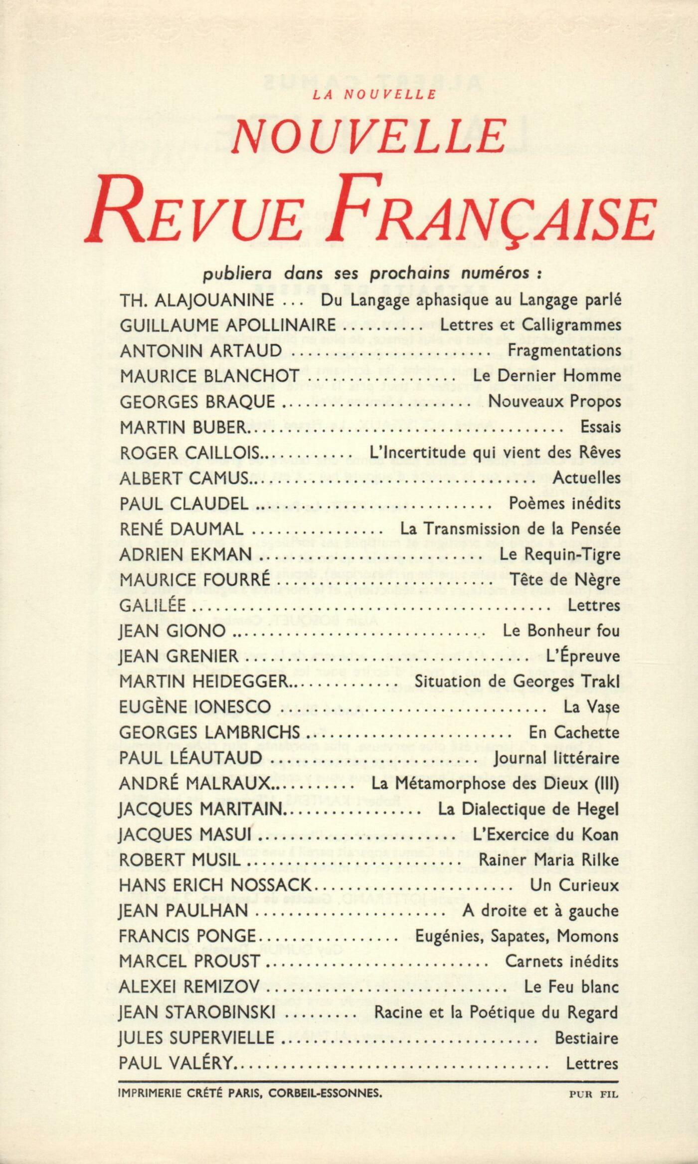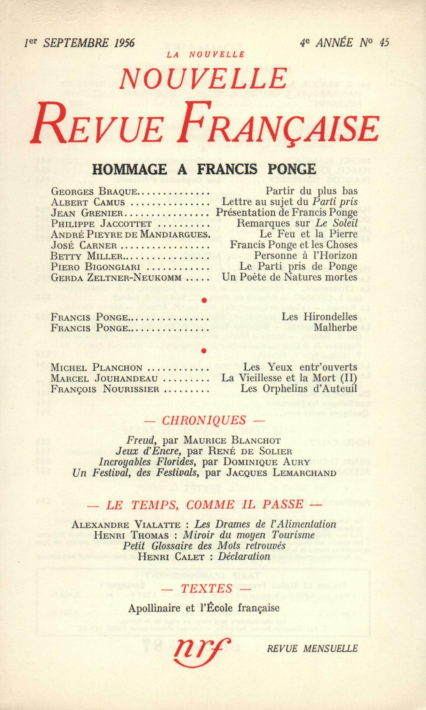Hommage ŕ Francis Ponge : Albert Camus, Lettre au sujet du Parti prisJean Grenier, Présentation de Francis PongePhilippe Jaccottet, Remarques sur Le SoleilAndré Pieyre de Mandiargues, Le Feu et la PierreJosep Carner, Francis Ponge et les chosesBetty Miller, Personne ŕ l'horizonPiero Bigongiari, Le Parti pris de PongeGerda Zeltner-Neukomm, Un Počte de natures mortesFrancis Ponge, Les Hirondelles ou ŤDans le style des hirondellesť - MalherbeMichel Planchon, Les Yeux entr'ouvertsMarcel Jouhandeau, Réflexions sur la Vieillesse et la Mort (II)François Nourissier, Les Orphelins d'AuteuilChroniques : recherches : Maurice Blanchot, FreudChroniques : Dominique Aury, Incroyables FloridesChroniques : le théâtre : Jacques Lemarchand, Un Festival, des FestivalsChroniques : René de Solier, Jeux d'encreNotes : Marc Bernard, Henri CaletNotes : la poésie : Jean Grosjean, Raymond Schwab ou L'invitation ŕ l'avenirNotes : la littérature : Robert Campbell, Philosophie de la Révolution française, par Bernard Groethuysen (Gallimard)Roger Judrin, Présence des Morts, par Emmanuel Berl (Gallimard)Notes : le roman : Marcel Arland, Le Soleil de Cavouri, par Jean Blot (Gallimard)Roger Judrin, Adeline Vénician, par André Chamson (Grasset) - L'Amour de toi, par Jacques Perry (Julliard)Notes : lettres étrangčres : Alain Bosquet, Gottfried BennKnud Ferlov, Giovanni PapiniGeorges Anex, Lettres ŕ Milena, de Franz Kafka (Gallimard)Dominique Fernandez, Lénine et les problčmes de la littérature russe, par Boris Meilakh (Éditions Sociales)Yvon Belaval, Harlequin Phnix, par Thelma Niklaus (The Bodley Head)Notes : les spectacles : Jean Texcier, Moulin-RougeNotes : les arts : André Berne-Joffroy, De Giotto ŕ Bellini : Primitifs italiens des musées de Province (Orangerie des Tuileries, Musée des Arts décoratifs)Georges Lambrichs, Allons ŕ MattaDe tout un peu : Pierre Oster, Fomalhaut, par Romain Weingarten (Falaize) - Ręve et Folie et autres počmes, par Georg Trakl (G. L. M.) - Počmes choisis, d'Ilarie Voronca (Seghers)Marcel Arland, Fugue ŕ Waterloo, par René de Obaldia (Julliard) - L'Espace d'un Matin, par Jean-Pierre Servin (Gallimard)Jean Guérin, Deux Anglaises et le Continent, par H.-P. Roché (Gallimard) - Jeunes Proies, par Roger Peyrefitte (Flammarion) - La Liberté ou la Mort, par Nicolas Kazantzaki (Plon)Emmanuel Berl, TélévisionLes revues, les journaux : André Thérive - Jean Guérin, Julien Benda - Le souvenir de Vincent Muselli - Vieilles querelles Anonymes, Divers - Quelques mots sur...Le temps, comme il passe : Henri Calet, Déclaration Anonymes, Petit glossaire des mots retrouvésHenri Thomas, Miroir du moyen TourismeAlexandre Vialatte, Les Drames de l'alimentationTextes : Roger Shattuck, Apollinaire et l'École FrançaiseGuillaume Apollinaire, Le Salon d'Automne L'Exposition d'Ingres