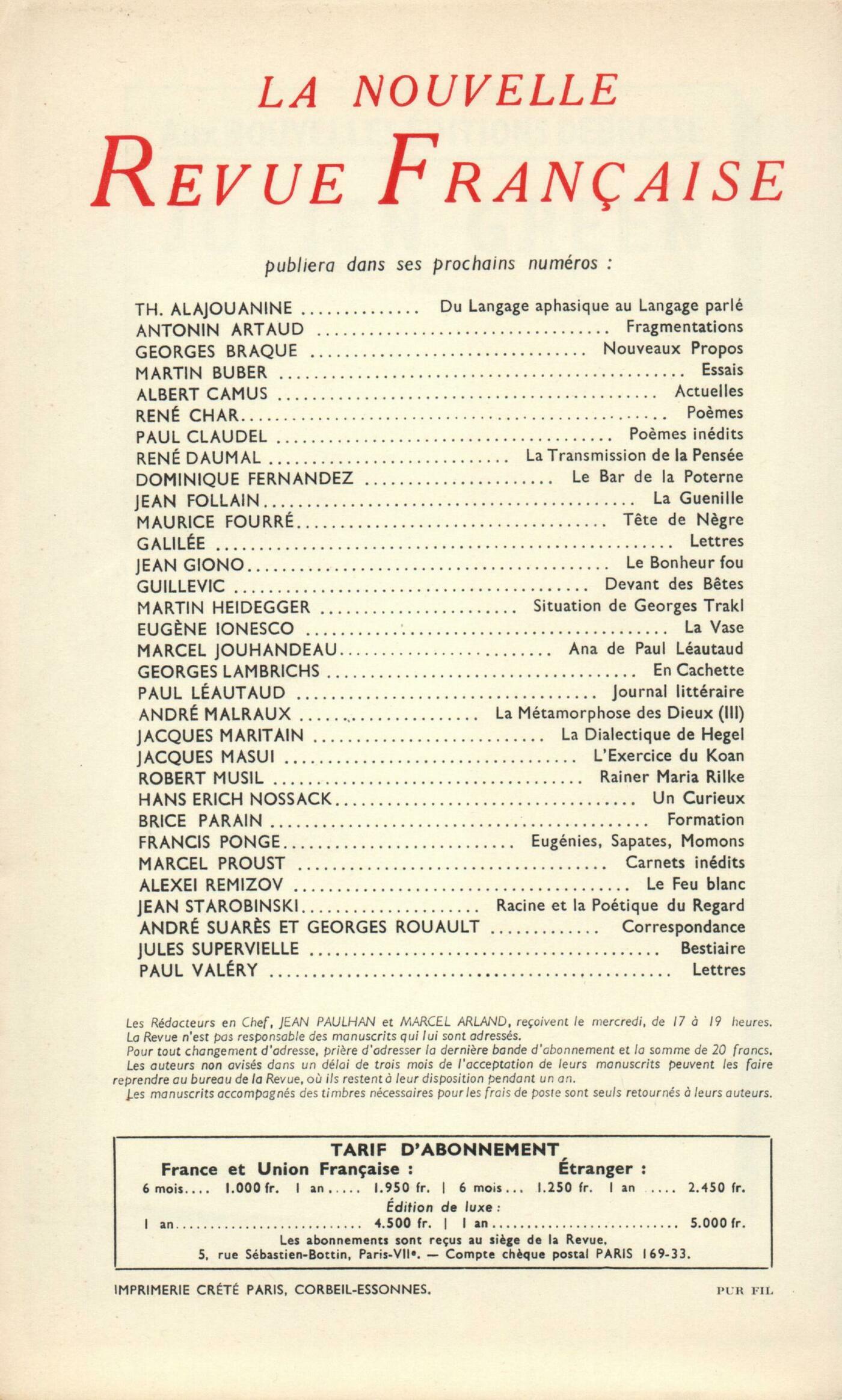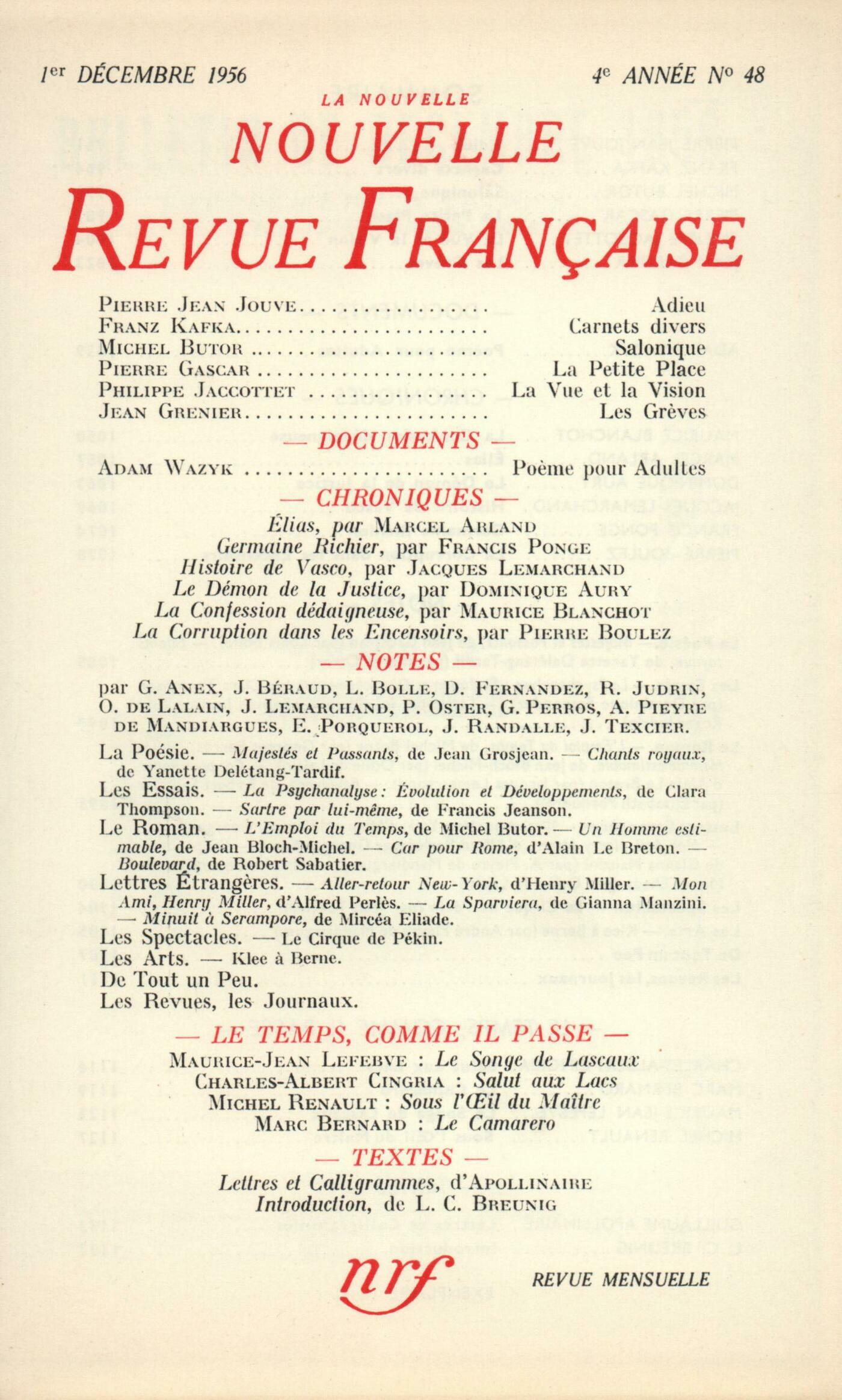 Pierre Jean Jouve, AdieuFranz Kafka, Cahiers diversMichel Butor, SaloniquePierre Gascar, La Petite PlacePhilippe Jaccottet, La Vue et la VisionJean Grenier, Les GrčvesDocuments : Armand Robin, ŤPočme pour Adultes, d'Adam Wazyk, a paru le 21 aoűt 1955 ŕ Varsovie...ťAdam Wazyk, Počme pour AdultesChroniques : recherches : Maurice Blanchot, La Confession dédaigneuseChroniques : Marcel Arland, ÉliasChroniques : le roman : Dominique Aury, Le Démon de la JusticeChroniques : le théâtre : Jacques Lemarchand, Histoire de VascoChroniques : les arts : Francis Ponge, Germaine RichierChroniques : la musique : Pierre Boulez, La Corruption dans les EncensoirsNotes : la poésie : Louis Bolle, Majestés et Passants, par Jean Grosjean (Gallimard)Pierre Oster, Chants royaux, par Yanette Delétang-Tardif (Seghers)Notes : les essais : Dominique Fernandez, La Psychanalyse, par Clara Thompson (Gallimard)Roger Judrin, Sartre par lui-męme, par Francis Jeanson (Éditions du Seuil)Notes : le roman : Georges Perros, L'Emploi du Temps, par Michel Butor (Éditions de Minuit)Odile de Lalain, Un Homme estimable, par Jean Bloch-Michel (Gallimard)Jacques Lemarchand, Car pour Rome, par Alain Le Breton (Gallimard)Élisabeth Porquerol, Boulevard, par Robert Sabatier (Albin Michel)Notes : lettres étrangčres : Georges Anex, Aller-retour New York, par Henry Miller (Guilde du Livre) - Mon ami Henry Miller, par Alfred Perlčs (Julliard)André Pieyre de Mandiargues, La Sparviera, par Gianna Manzini (Mondadori)Odile de Lalain, Minuit ŕ Serampore, par Mircea Eliade (Stock)Notes : les spectacles : Jean Texcier, Le Cirque de PékinNotes : les arts : André Pieyre de Mandiargues, Klee ŕ BerneDe tout un peu : Pierre Oster, Essai sur Paul Valéry, par Jacques Charpier (Seghers) - Amour et autres Visages, pat Philippe Jones (Les Lettres)Roger Judrin, Lettre ŕ un jeune Rastignac, par Michel Déon (Fasquelle) - Le Fait démographique français et ses conséquences, par Jean Daric (Cahiers des Amis de la Liberté) - La Vie d'artiste, par Jean Oberlé (Denoël) - Bilan littéraire du XXe sičcle, par R.-M. Albérčs (Aubier) - L'Allemagne en cage, par Jean Davidson (Le Seuil)Odile de Lalain, L'Amour vagabond, par André Fraigneau (Plon) - La Petite Anglaise, par Renée Massip (Gallimard)Jacques Randalle, Cet Enfant émerveillé, par Hubert de Luze (Corręa) - La Ligne droite, par Yves Gibeau (Calmann-Lévy)Roger Judrin, Le Train pour l'Océan, par Silvain Reiner (Gallimard) - Le Soleil dans la poche, par Hans Ruesch (Calmann-Lévy) - Confidence antipathique, par Léon Weinigel (Denoël)Janine Béraud, Poliakoff (Galerie Bing)Les revues : Albert-Marie Schmidt, La philosophie de Guy de MaupassantJean Pfeiffer, Les grâces de Jean CocteauGaëtan Picon, La pensée de Maurice BlanchotJean Guérin, DiversLe temps, comme il passe : Charles-Albert Cingria, Salut aux LacsMarc Bernard, Le CamareroMaurice-Jean Lefebve, Le Songe de Lascaux