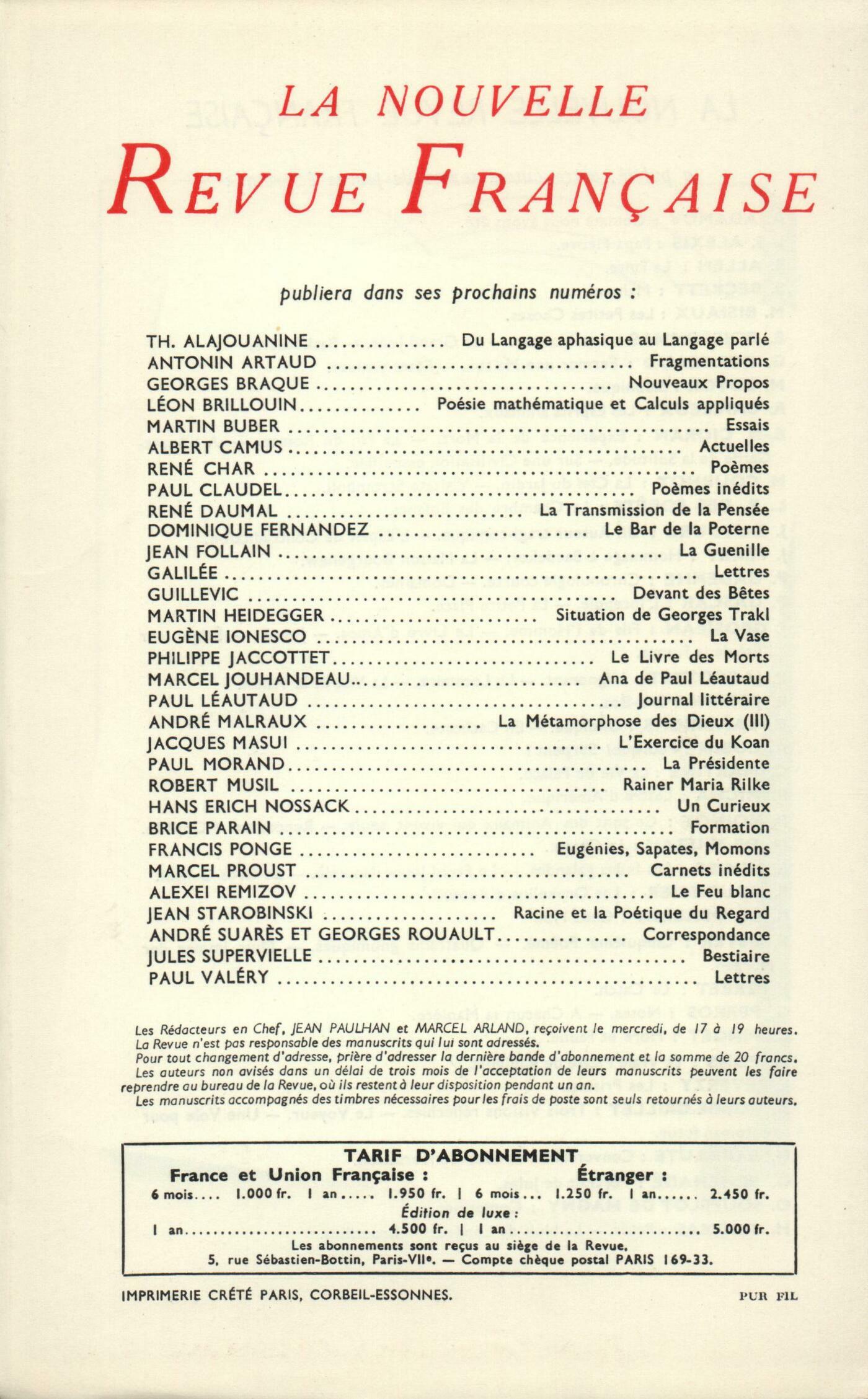 Henri Michaux, L'Infini turbulentJean Grenier, Visite ŕ la fermePierre Oster, Neuvičme PočmeJacques Chardonne, L'Éducation des FillesJacques Maritain, La Dialectique de Hegel (Fin)Jean Giono, BataillesRené Daumal - Roger Gilbert-Lecomte, LettresChroniques : Maurice Blanchot, Brecht et le dégoűt du théâtreMarcel Arland, Ŕ un jeune homme de lettresMarie Delcourt, Le Mythe de DelphesChroniques : les romans : Dominique Aury, Le Droit d'asileChroniques : Jacques Lemarchand, Théâtre américain ŕ ParisJanine Béraud, Odilon RedonNotes : la poésie : Alain Bosquet, Aragon ou L'insolencePaul Neuhuys, Choix de počmes, de Franz Hellens (Seghers)Notes : la littérature : Henry Amer, Les Immémoriaux, par Victor Segalen (Plon)Roger Judrin, Sainte Russie, par Henri Troyat (Grasset)Notes : les essais : Michel de M'Uzan, La psychanalyse aujourd'hui, par S. Nacht (P. U. F.)Albert-Marie Schmidt, Forgerons et Alchimistes, par Mircea Eliade (Flammarion) - Les Douze Clefs de Philosophie de Basile Valentin, par Eugčne Canseliet (Éditions de Minuit)Jean Guérin, Le Parlement aux mains des banques, par Paul Rassinier (Contre-courant)Pierre Oster, L'Art poétique, par Jacques Charpier et Pierre Seghers (Seghers)Notes : le roman : Jacques Randalle, Qui j'ose aimer, par Hervé Bazin (Grasset)Henry Amer, La Géométrie dans la Terreur, par Jacques Sternberg (J.-J. Pauvert) - La Sortie est au fond de l'espace, par Jacques Sternberg (Denoël)Notes : lettres étrangčres : Michel Mohrt, Aux Sources du Fleuve, par Thomas Wolfe (Stock)Jean Guérin, Les Portes de la Perception, par Aldous Huxley (Éditions du Rocher) - Le Ciel et l'Enfer, par Aldous Huxley (Éditions du Rocher)Dominique Fernandez, L'Epidemia, par Alberto Moravia (Bompiani)Notes : les spectacles : François Nourissier, Deux mois dans le noirNotes : les arts : Janine Béraud, PougnyNotes : les arts. Indéfinition de la peinture : André Berne-Joffroy, Atlan (Galerie Bing) - Tchelitchew (Galerie Rive Gauche)Notes : les arts. Parmi les expositions : René de Solier, Germain (Galerie Michel Warren) - Burri (Galerie Rive Droite) - César (Galerie Rive Droite) - Domec (Galerie Furstenberg)De tout un peu : Roger Judrin, Divers LibellesOdile de Lalain, Un Jour quelconque, par Colette Ofaire (Stock)Jacques Randalle, Sa Majesté des Mouches, par William Golding (Gallimard)Les revues, les journaux : Jean Guérin, La Chandelle verteJean Grenier - Jean Guérin, Chien et chat - DiversLe temps, comme il passe : Rémy Duval, Trois PlisMaxime Gorki, Lettre ŕ Franz HellensJean Cuttat, Les Comptines de l'OiselierAmbrose Bierce, Fables fantastiquesTextes : J.-P. Mayer, Les voyages de Tocqueville et la genčse de sa sociologie politiqueAlexis de Tocqueville, Carnets de voyage