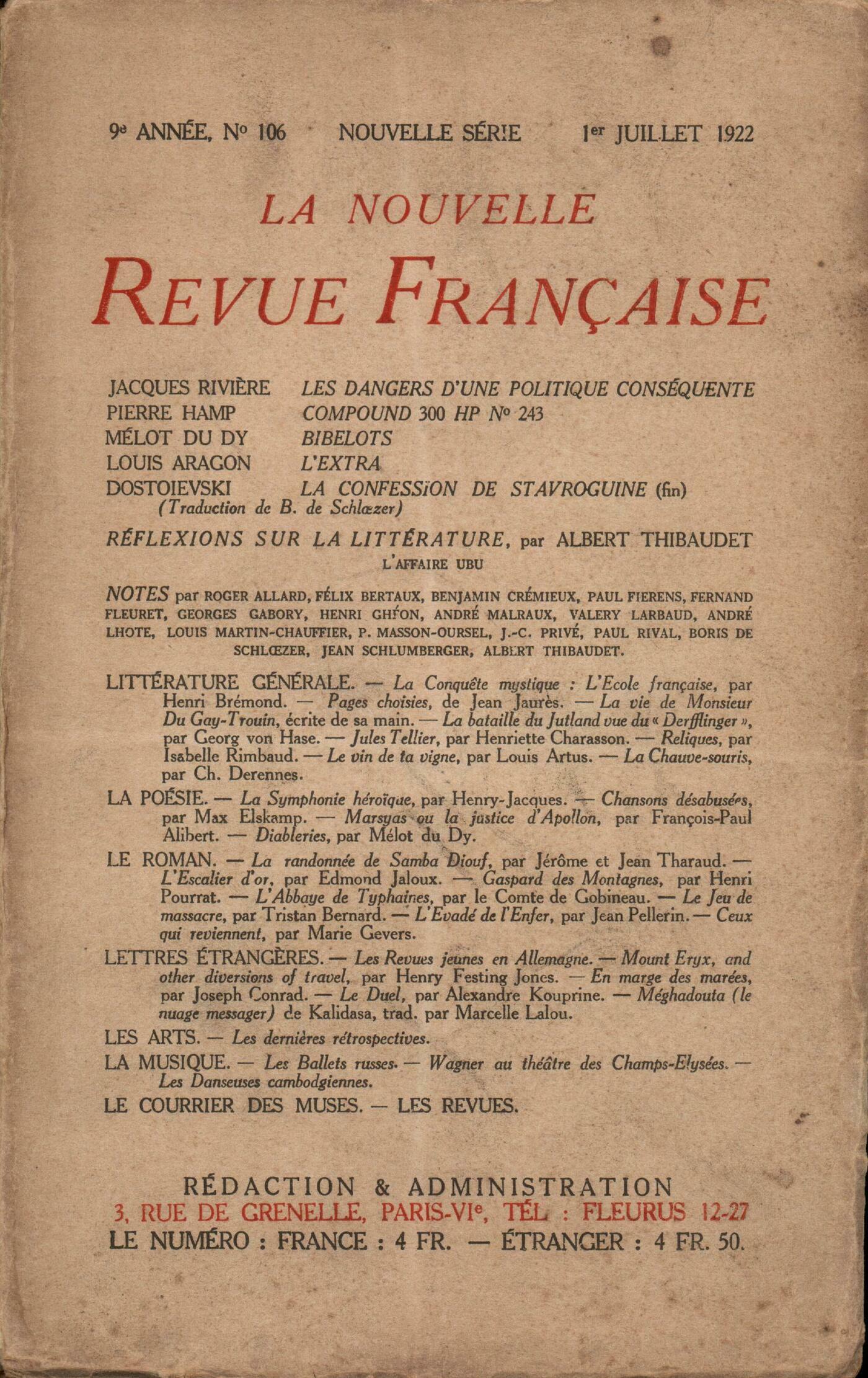 Jacques Rivičre, Les dangers d'une politique conséquentePierre Hamp, Compound 300 HP n° 243Mélot Du Dy, BibelotsLouis Aragon, L'ExtraFédor Dostoďevski, La confession de Stavroguine (fin)Réflexions sur la littérature : Albert Thibaudet, L'Affaire UbuNotes : littérature générale : Henri Ghéon, La Conquęte mystique : l'École française, par Henri Brémond Benjamin Crémieux, Pages choisies, de Jean Jaurčs - Histoire socialiste de la Révolution française, I, par Jean Jaurčs Jean Schlumberger, La vie de Monsieur Du Gay-Trouin écrite de sa main - La bataille du Jutland vue du ŤDerfflingerť, par Georg von Hase Albert Thibaudet, Jules Tellier, par Henriette Charasson Benjamin Crémieux, Reliques, par Isabelle Rimbaud Albert Thibaudet, Le Vin de ta Vigne, par Louis Artus Benjamin Crémieux, La Chauve-souris, par Charles Derennes - Les Discours du docteur O'Grady, par André Maurois Notes : la poésie : Roger Allard, La symphonie héroďque, par Henry Jacques Paul Fierens, Chansons désabusées, par Max Elskamp Jean Schlumberger, Marsyas ou La justice d'Apollon, par François-Paul Alibert Georges Gabory, Diableries, par Mélot du Dy Notes : le roman : Paul Rival, La randonnée de Samba Diouf, par Jérôme et Jean Tharaud Benjamin Crémieux, L'Escalier d'Or, par Edmond Jaloux - Gaspard des Montagnes, par Henri Pourrat André Malraux, L'Abbaye de Typhaines, par le comte de Gobineau Louis Martin-Chauffier, Le jeu de massacre, par Tristan Bernard Fernand Fleuret, L'Évadé de l'Enfer, par Jean Pellerin Jean Schlumberger, Ceux qui reviennent, par Marie Gevers Benjamin Crémieux, Vers l'Ouest, par Constantin Weyer Notes : lettres étrangčres : Pierre Bertaux, Les revues jeunes en AllemagneValery Larbaud, Mount Eryx and other diversions of travel, par Henry Festing Jones Benjamin Crémieux, En marge des marées, par Joseph Conrad Boris de Schlzer, Le Duel, par Alexandre Kouprine Paul Masson-Oursel, Méghadouta, de Kalidasa Notes : les arts : André Lhote, Les derničres rétrospectivesNotes : la musique : Boris de Schlzer, Les Ballets russes - Wagner au théâtre des Champs-ÉlyséesJ.-C. Privé, Les danseuses cambodgiennes ŕ l'OpéraGeorges Gabory, Le courrier des musesLes revues : Anonymes, Paul Valéry - Ŕ propos de Marcel Proust - Sur Les Copains - Les entretiens d'été de Pontigny - Mémento