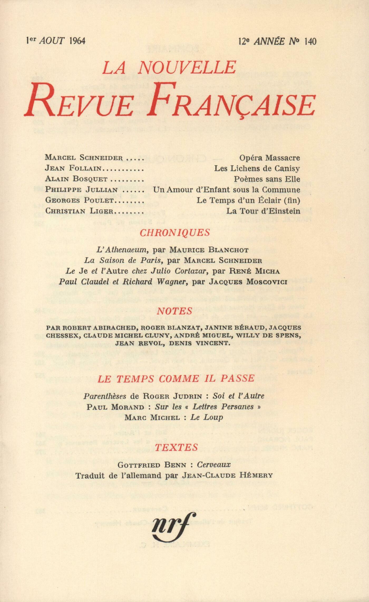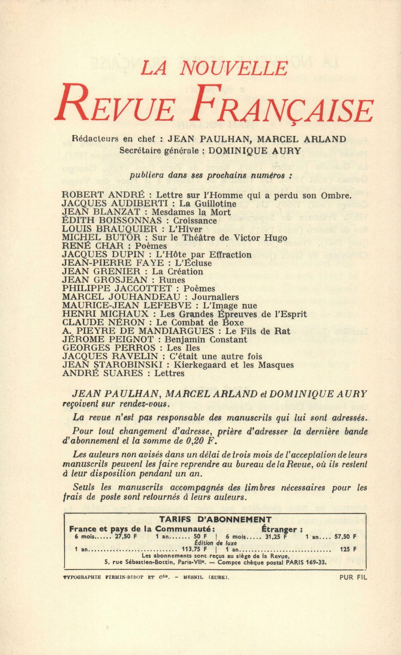 Marcel Schneider, Opéra MassacreJean Follain, Les lichens de CanisyAlain Bosquet, Počmes sans ellePhilippe Jullian, Un amour d'enfant sous la CommuneGeorges Poulet, Le temps d'un éclair (Fin)Christian Liger, La Tour d'EinsteinChroniques : Maurice Blanchot, L'AthenaeumRené Micha, Le Je et l'Autre chez Julio CortázarJacques Moscovici, Paul Claudel et Richard WagnerMarcel Schneider, La Saison de ParisNotes : littérature et essais : Claude Michel Cluny, Mille chemins ouverts, par Julien Green (Grasset)Roger Blanzat, Lettres ŕ quelques-unes, par André Bay (Mercure de France)Robert Abirached, Journal, par Jean-René Huguenin (Le Seuil)Jacques Chessex, Apprendre ŕ vivre, par Clara Malraux (Grasset)Notes : le roman : Claude Michel Cluny, Les Invités, par Marc Saporta (Éditions du Seuil)André Miguel, Les arčnes de Vérone, par Georges-Emmanuel Clancier (Robert Laffont)Marc Michel, Couleur de cendre, par René Pons (Gallimard)Notes : lettres étrangčres : André Miguel, Paris est une fęte, par Ernest Hemingway (Gallimard)Willy de Spens, Les enfants de Sanchez, par Oscar Lewis (Gallimard)Notes : les arts : Jean Revol, L'art et la quantité (Biennale de Venise)Janine Béraud, Peintures et Gouaches et pastels de Kupka (Galerie Carré Galerie Flinker)Carnet : Denis Vincent, Aventures spirituelles, par Arthur Symons (Mercure de France) - L'Automate, par Alberto Moravia (Flammarion) - Cheval d'ivoire, par Michel Stavaux (Gallimard) - Delacroix ou Le combat solitaire, par René Huyghe (Hachette) - Rouault (Musée du Louvre) - Jacques Villon, par Lionello Venturi (Louis Carré) - Lavis, dessins et aquarelles de Chagall (Galerie Maeght)Le temps comme il passe. Parenthčses : Roger Judrin, Soi et l'autreLe temps comme il passe : Paul Morand, Sur les Lettres persanesMarc Michel, Le loupTextes : Gottfried Benn, Cerveaux