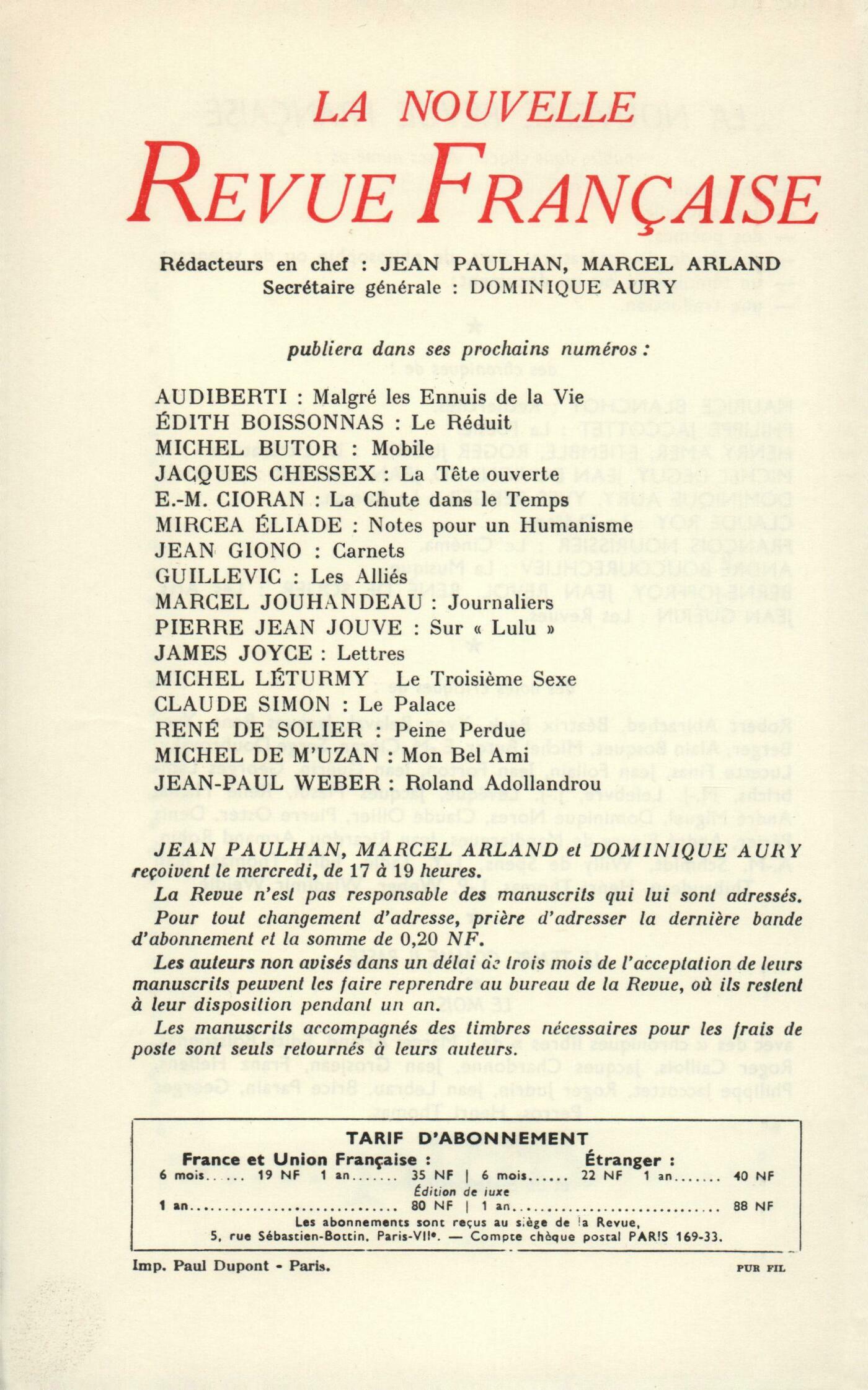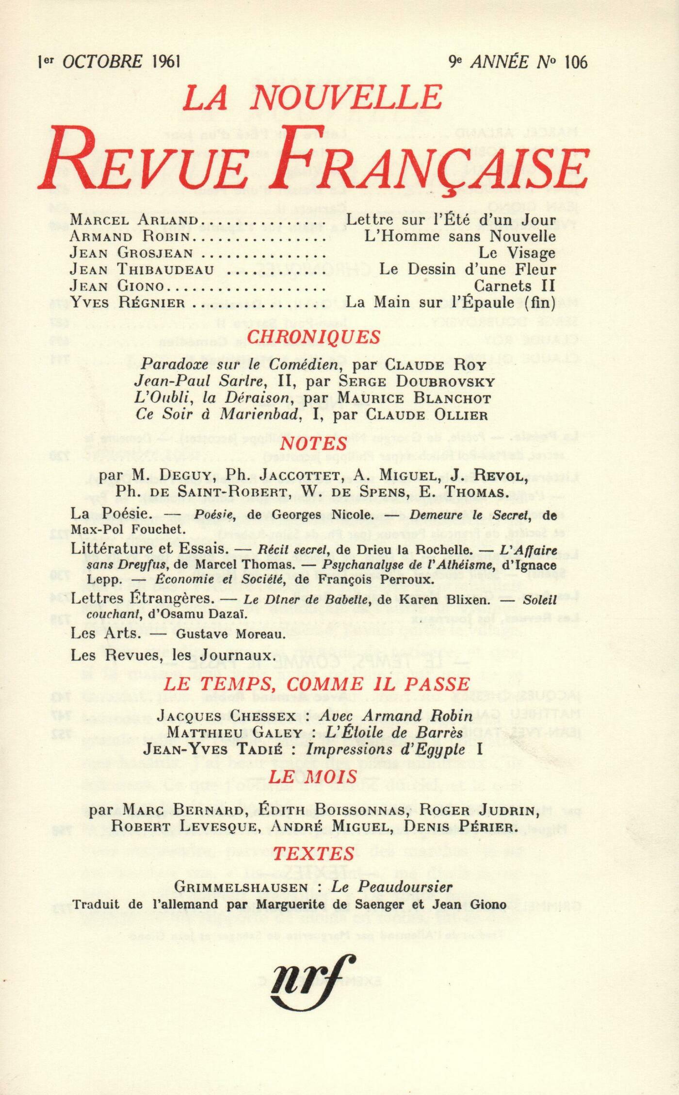 Marcel Arland, Lettre sur l'été d'un jourArmand Robin, L'Homme sans NouvelleJean Grosjean, Le VisageJean Thibaudeau, Le dessin d'une fleurJean Giono, Carnets (II)Yves Régnier, La Main sur l'épaule (Fin)Chroniques : Maurice Blanchot, L'Oubli, la DéraisonSerge Doubrovsky, Jean-Paul Sartre et le mythe de la Raison dialectique (II)Claude Roy, Le Paradoxe du SpectateurClaude Ollier, Ce soir ŕ Marienbad (I)Notes : la poésie : Philippe Jaccottet, Poésie, par Georges Nicole (Carrérouge) - Demeure le secret, par Max-Pol Fouchet (Mercure de France)Notes : littérature et essais : Michel Deguy, Récit secret, par Pierre Drieu la Rochelle (Gallimard)Édith Thomas, L'Affaire sans Dreyfus, par Marcel Thomas (Fayard)Willy de Spens, Psychanalyse de l'athéisme moderne, par Ignace Lepp (Grasset)Philippe de Saint-Robert, Économie et société, par François Perroux (P. U. F.)Willy de Spens, Le Dîner de Babette, par Karen Blixen (Gallimard)André Miguel, Soleil couchant, par Osamu Dazai (Gallimard)Notes : les arts : Jean Revol, Gustave MoreauLes revues : Jean Guérin, DadelsenGeorges Navel, PagesJean Guérin, DiversLe temps, comme il passe : Jacques Chessex, Avec Armand RobinMatthieu Galey, L'étoile de BarrčsJean-Yves Tadié, Impressions d'ÉgypteLe mois : Roger Judrin, CalibanDenis Périer, BagatellesAndré Miguel, En ArlesÉdith Boissonnas, MoyensMarc Bernard, En regardant peindre Joseph SimaRobert Levesque, PčlerinagesTextes : Grimmelshausen, Le Peaudoursier
